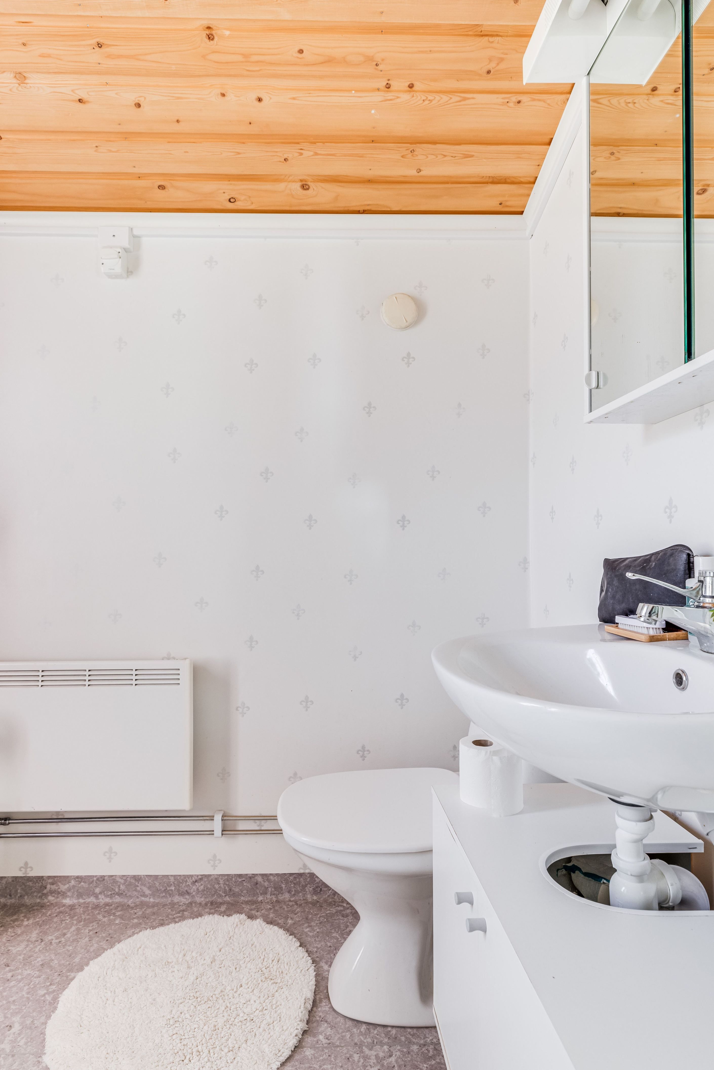 Huvudstugan är en timring och här finner man de sociala ytorna, kök, toalett, ett stort allrum och pricken över i:et en härlig inglasning. I allrummet finns det en kamin som värmer hela bostaden, samt en praktiskt luftvärmepump både för värme eller för att kyla ner dom varma sommardagarna. Här har även badrummet totalrenoverats i nya ytskikt 2022 och det finns utrymme för tvättmaskin om man skulle vilja installera det.