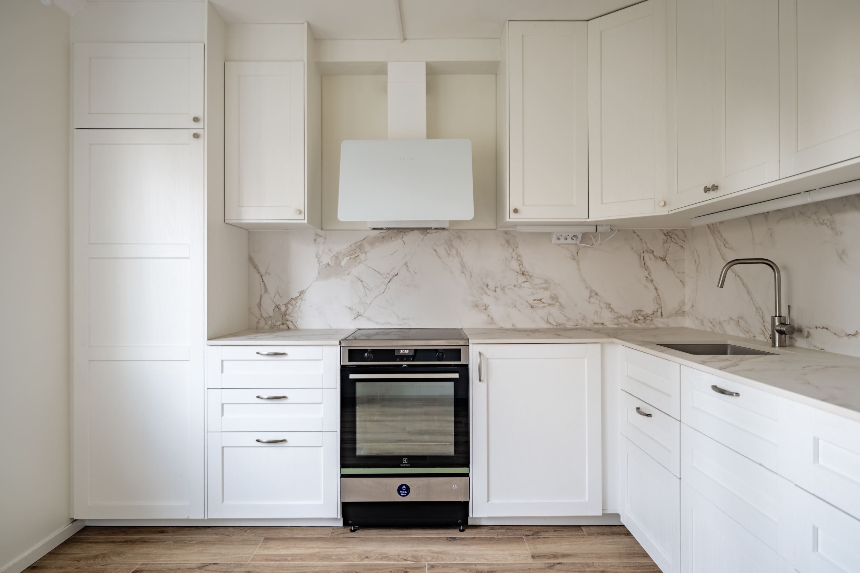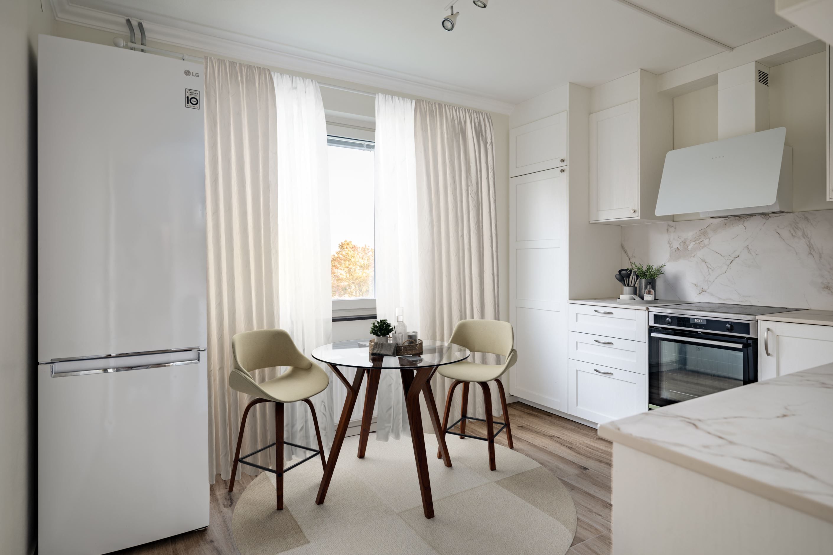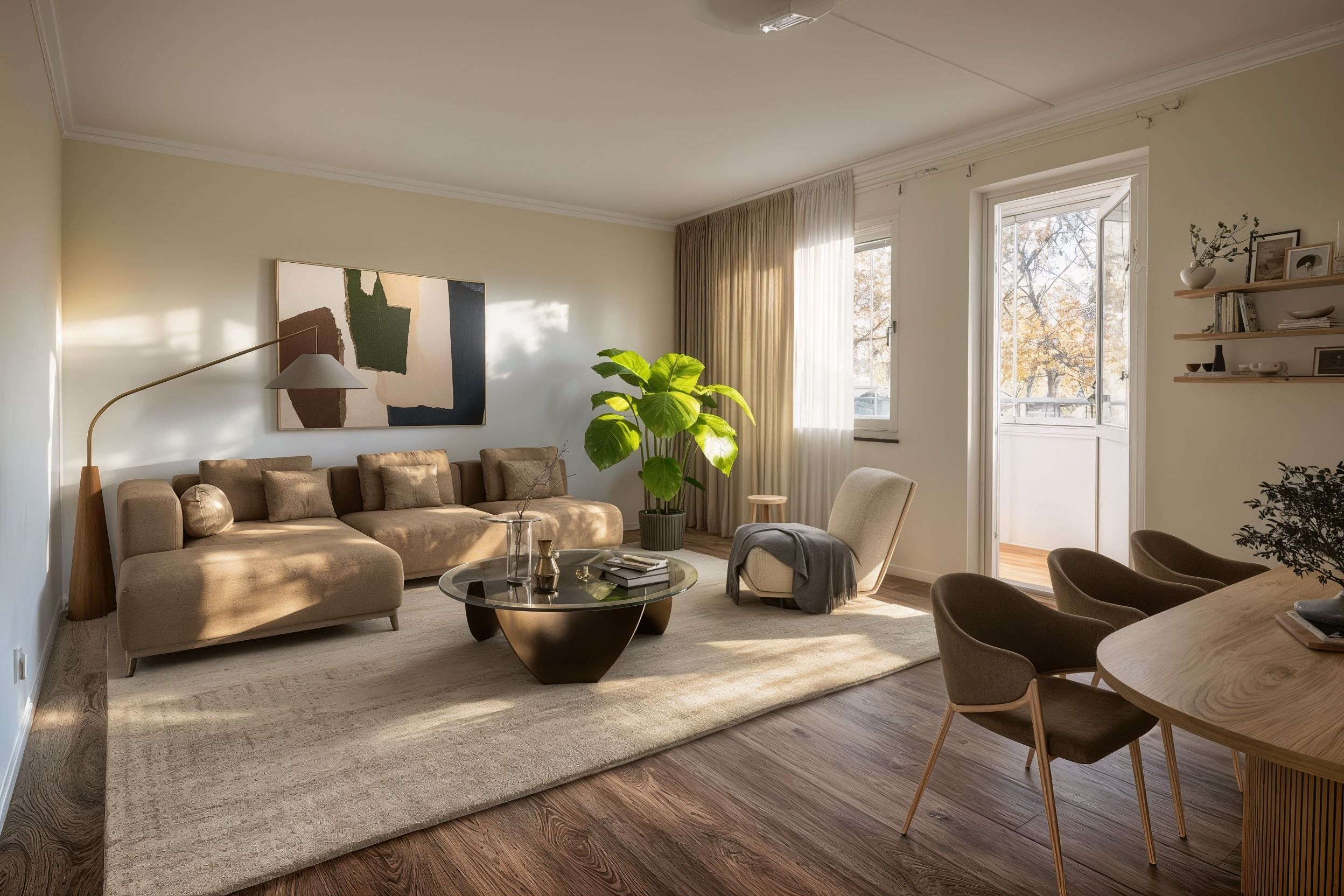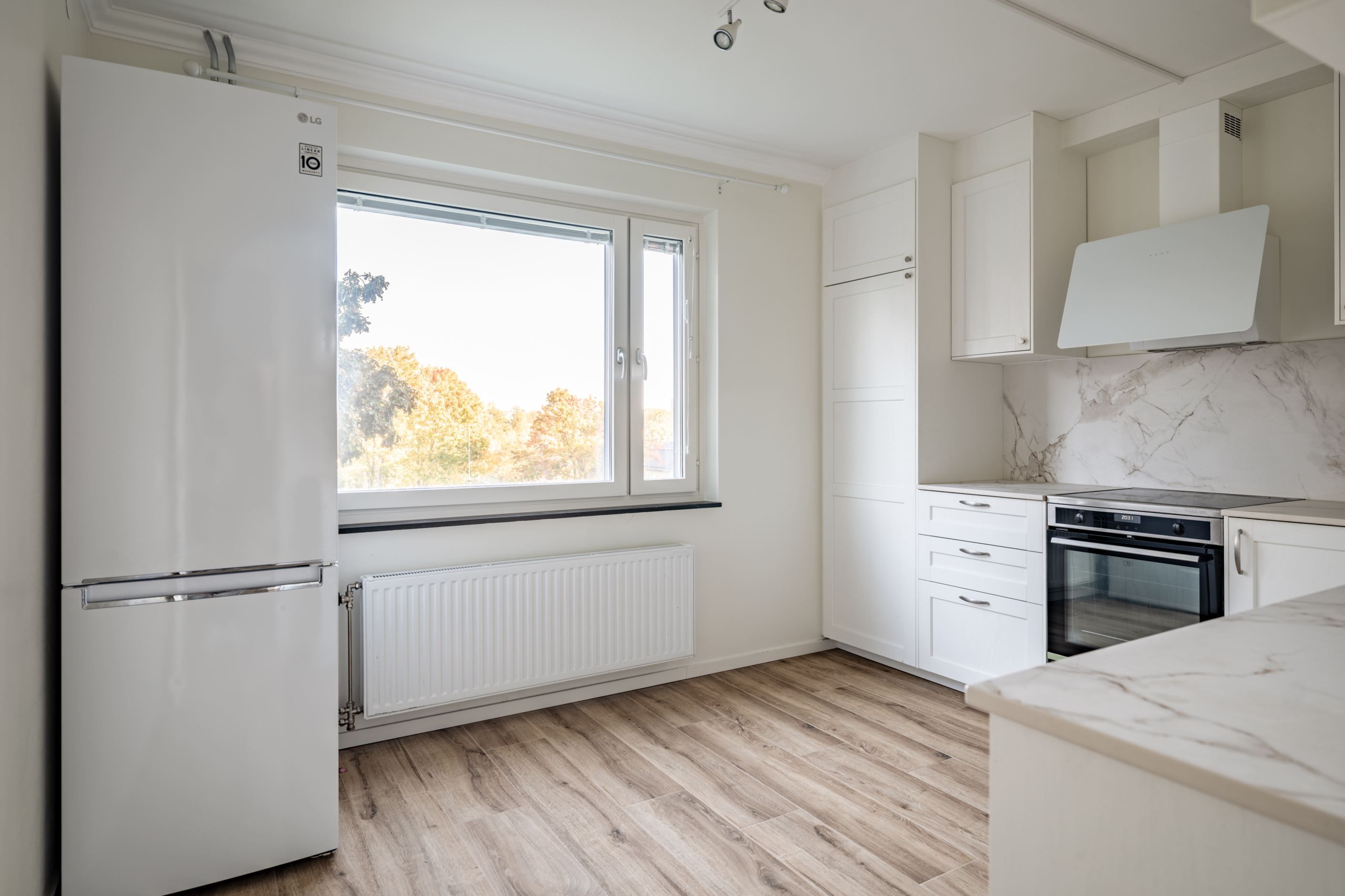 Det moderna köket har gott om arbetsyta, fri utsikt och plats för matbord intill fönster. I samband med stambytet har både badrum och gäst-wc uppdaterats med tidlösa materialval. Två bra sovrum ger plats för familj, gäster eller hemmakontor. Från vardagsrummet nås den stora inglasade balkongen i privat läge – en extra yta som kan användas stora delar av året.
