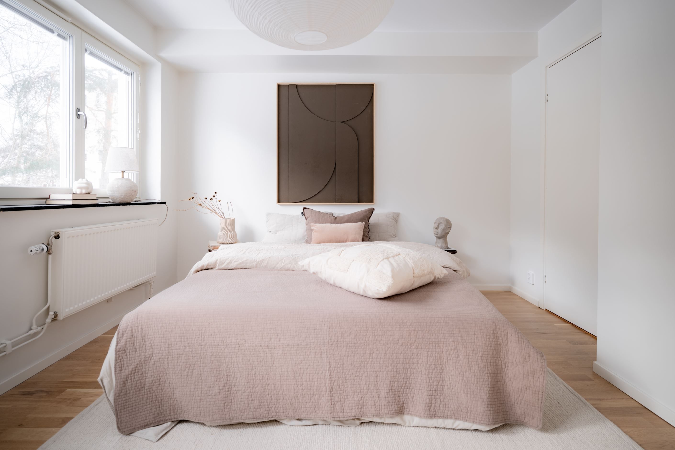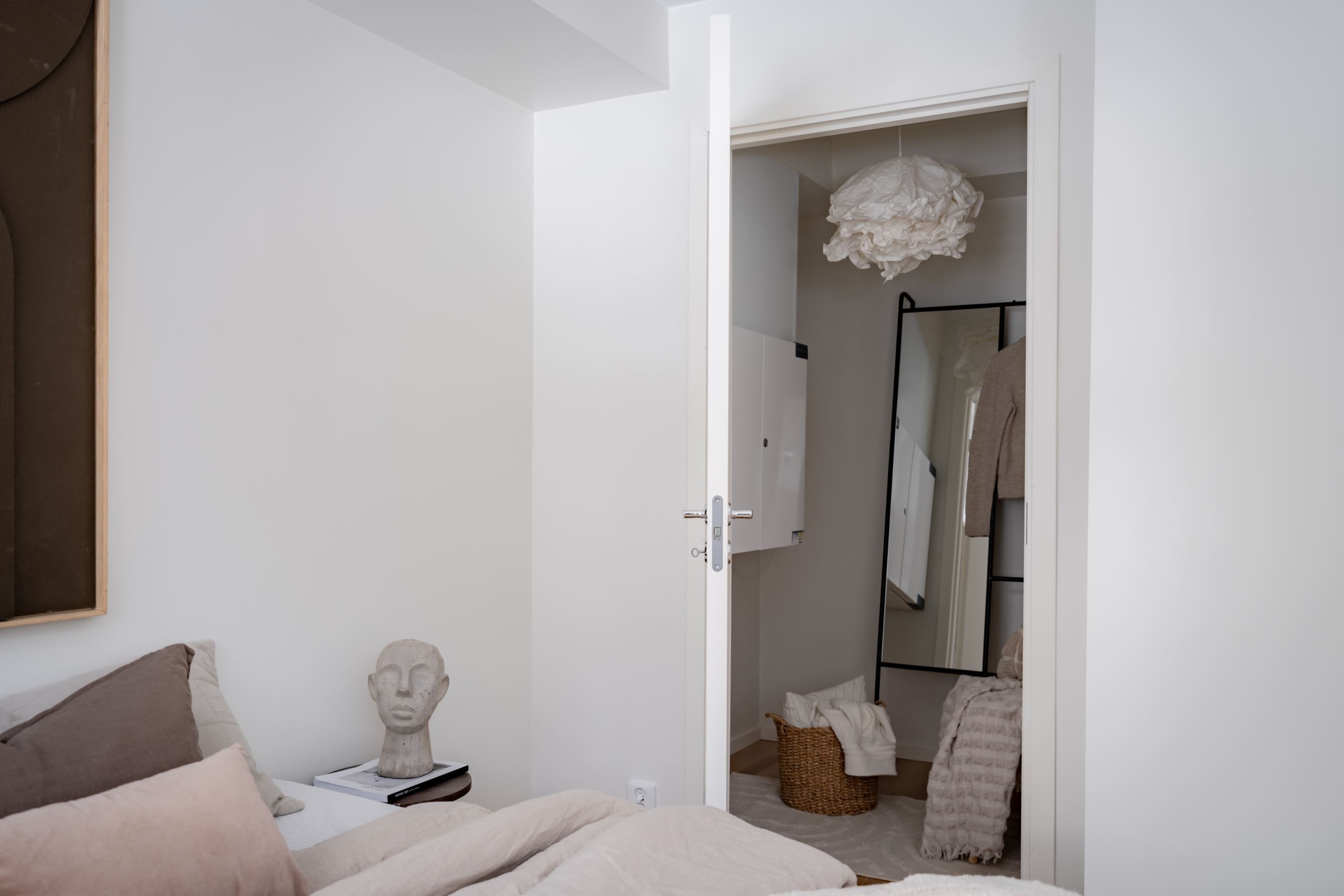 Det stora sovrummet har en rymlig klädkammare/förråd med gott om förvaring, medan det andra rummet enkelt kan användas som sovrum, matrum, kontor eller tv-rum – perfekt för den som vill kunna anpassa sitt boende efter livets olika faser. Det andra sovrummet har flera platsbyggda garderober. Badrummet är helkaklat och nybyggt med stilren dusch och förberett för tvättmaskin, och i hallen finns dessutom en praktisk gäst-wc. Båda med golvvärme.