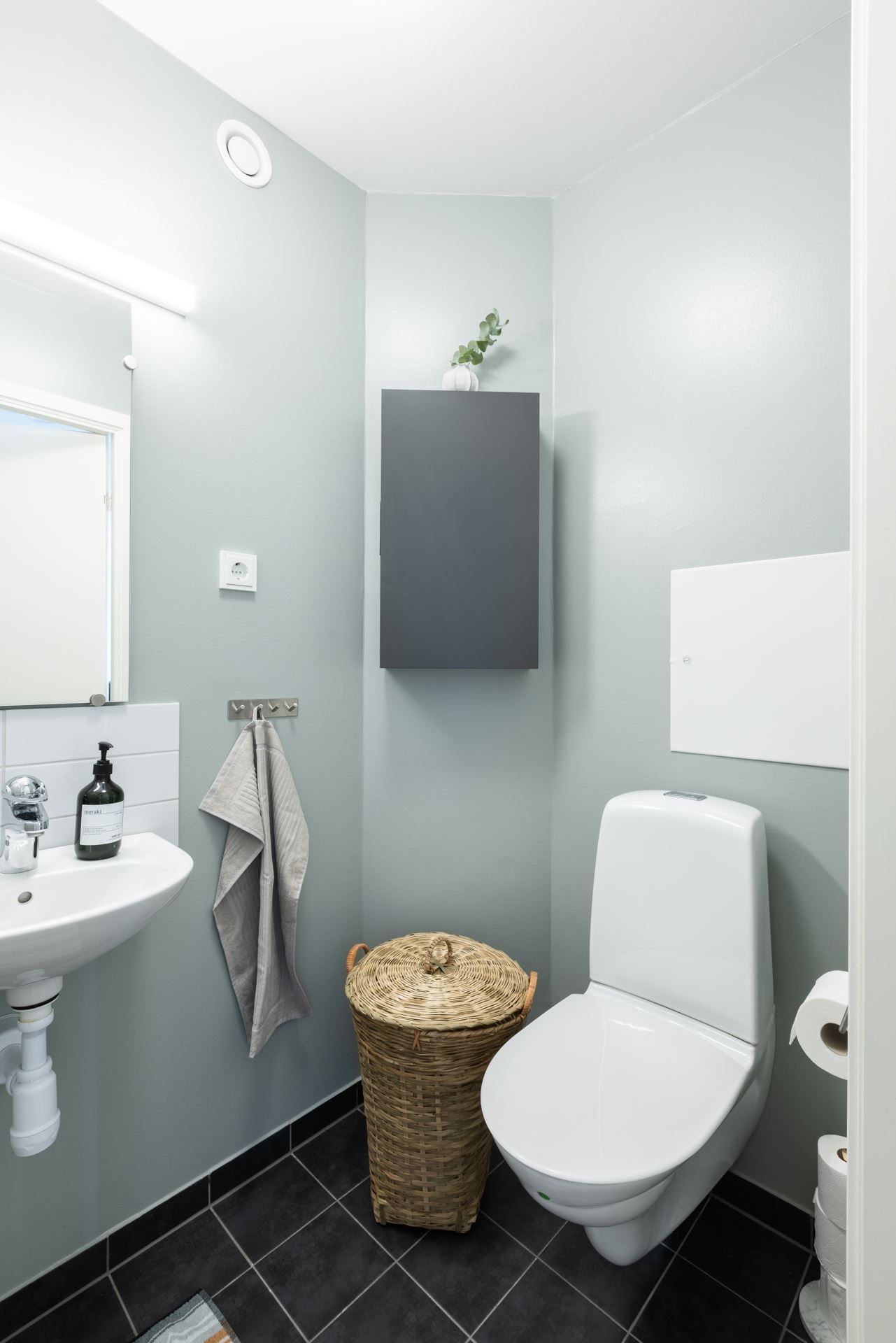 Badrummet är helkaklat i stilrena toner och bjuder egen tvättsektion som löser vardagstvätten.