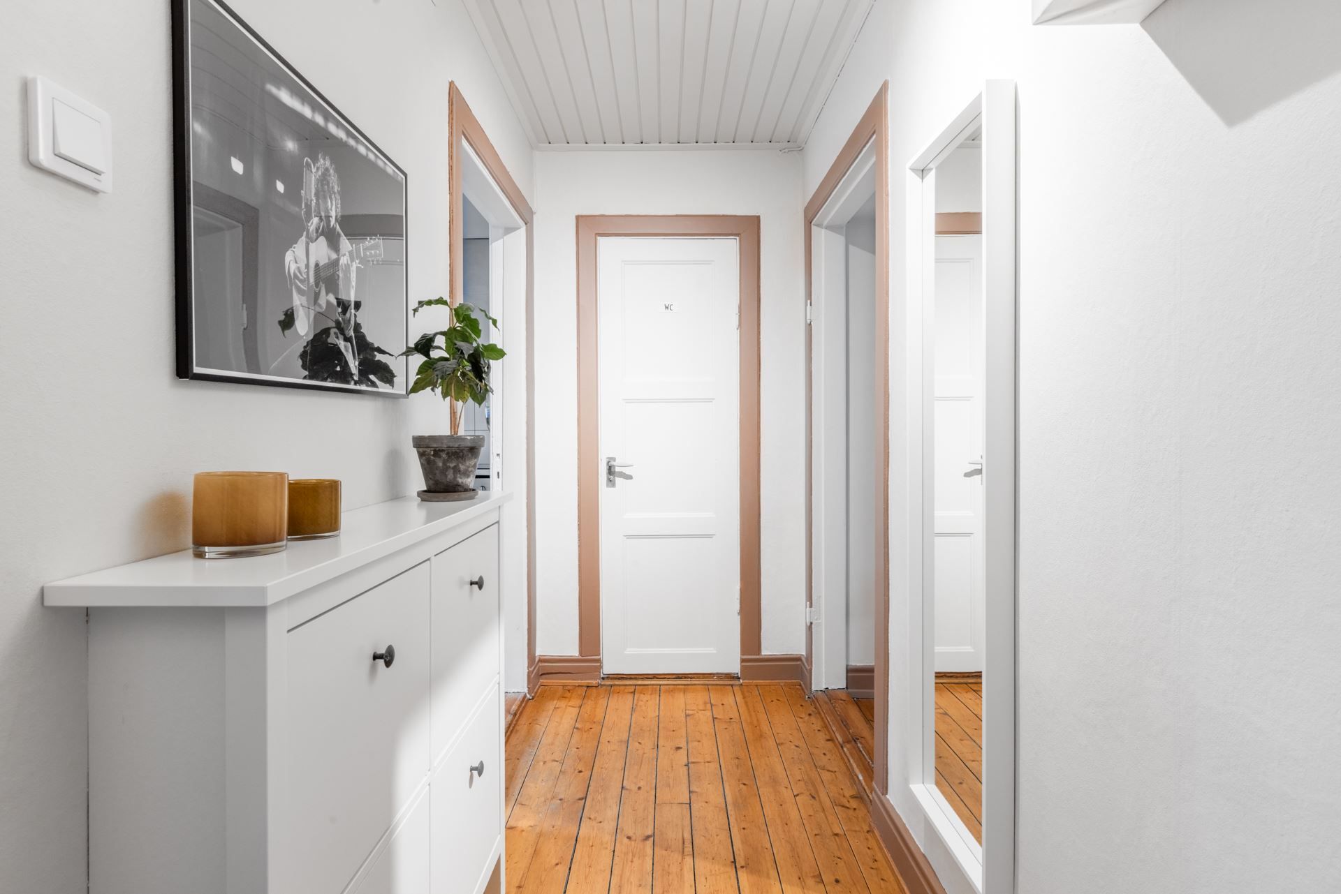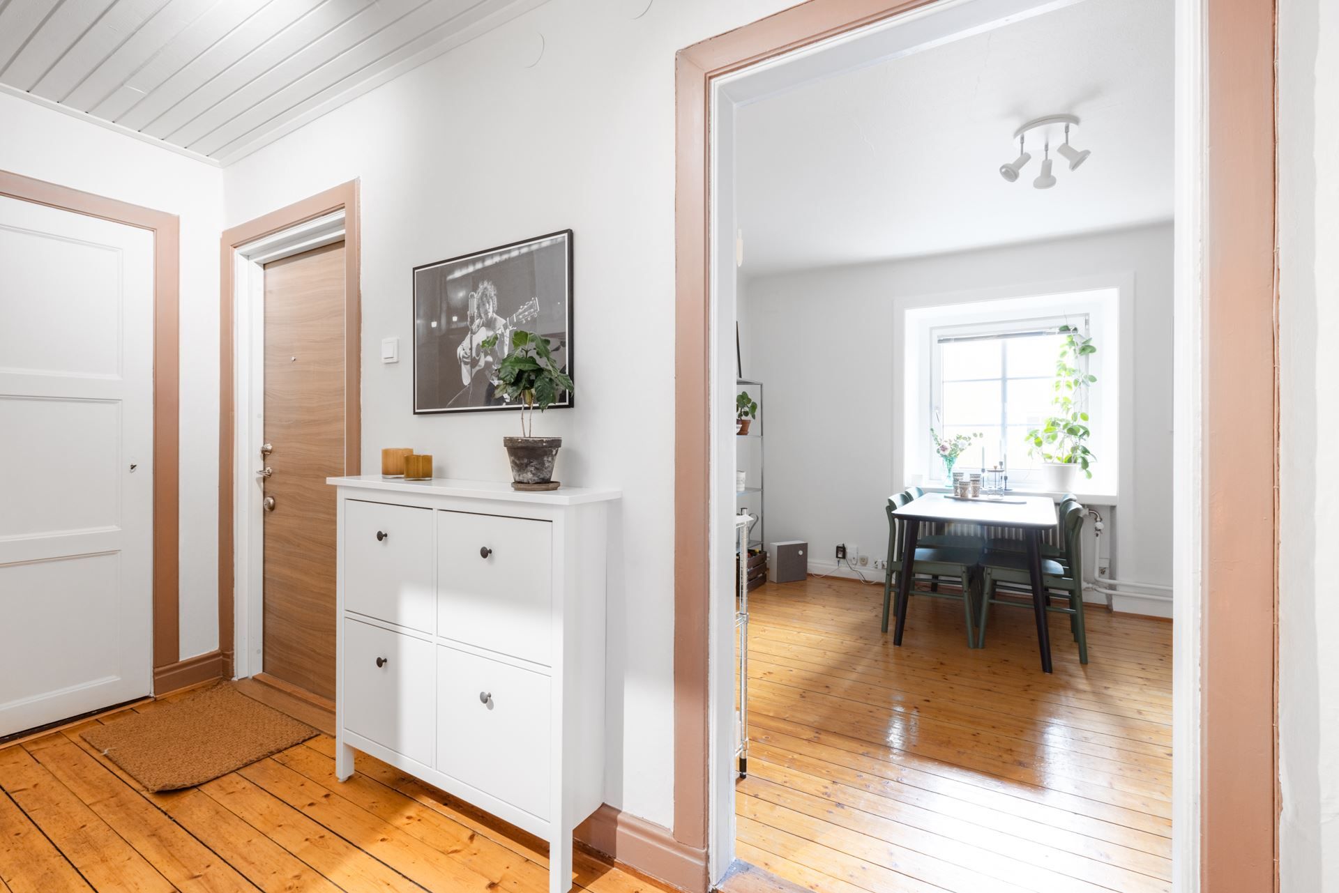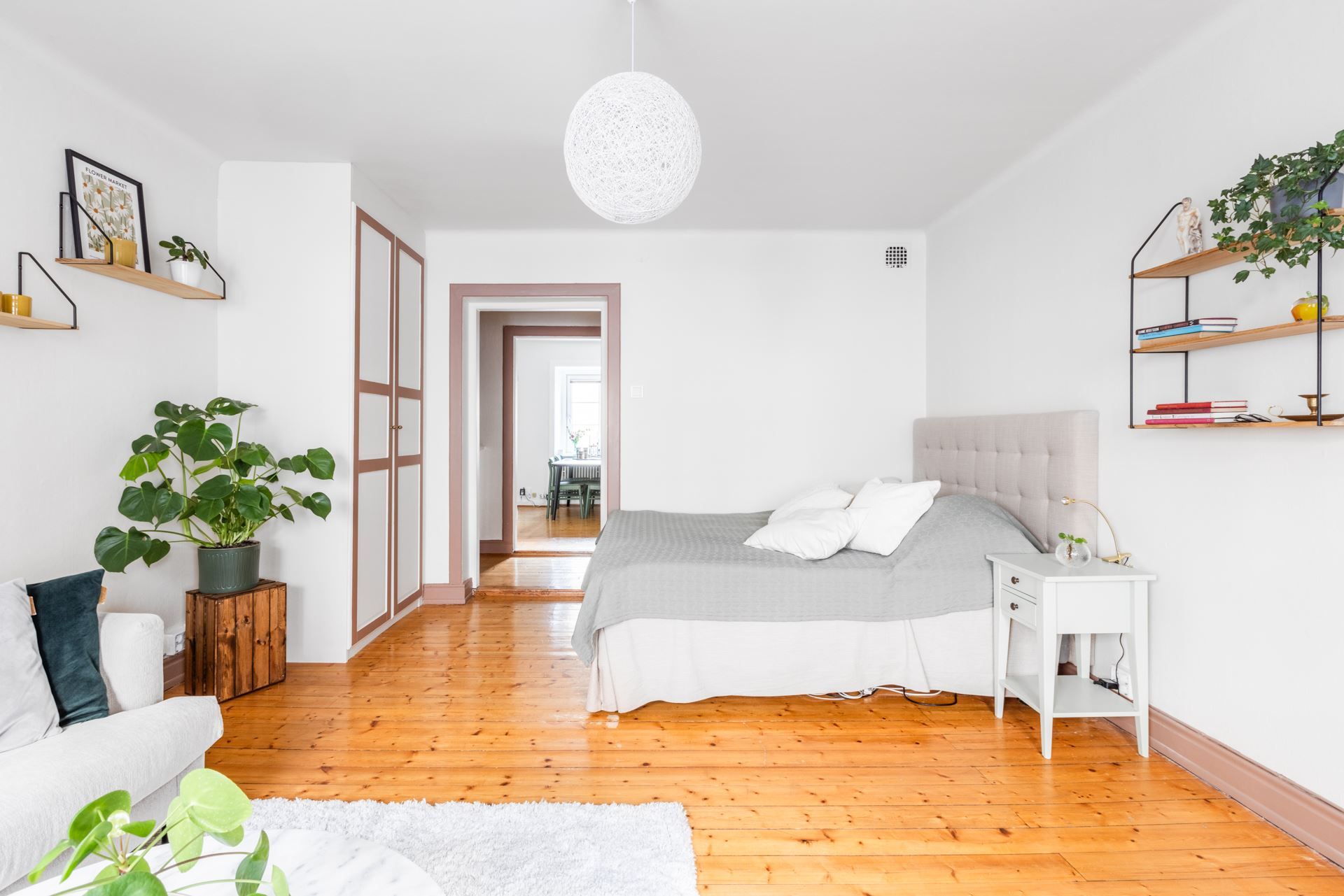 När du kliver in i denna bostad möts du direkt av en hemtrevlig atmosfär. Lägenheten har vackra plankgolv och charmiga fönster som skapar en varm och inbjudande miljö. Det rymliga kombinerade sovrummet/vardagsrummet erbjuder plats för både en stor dubbelsäng, en soffgrupp och eventuellt en läshörna eller arbetsplats. De stora fönsterpartierna bidrar till ett rikligt ljusinsläpp som fyller rummet.