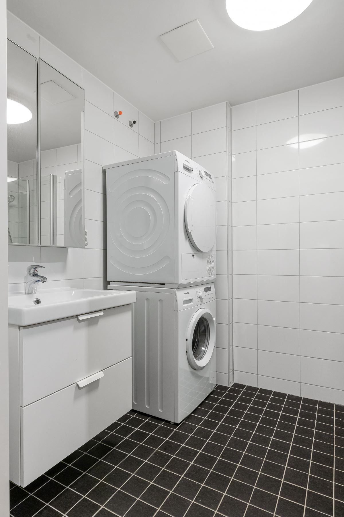 - Stort, helkaklat badrum med tvättmaskin och torktumlare