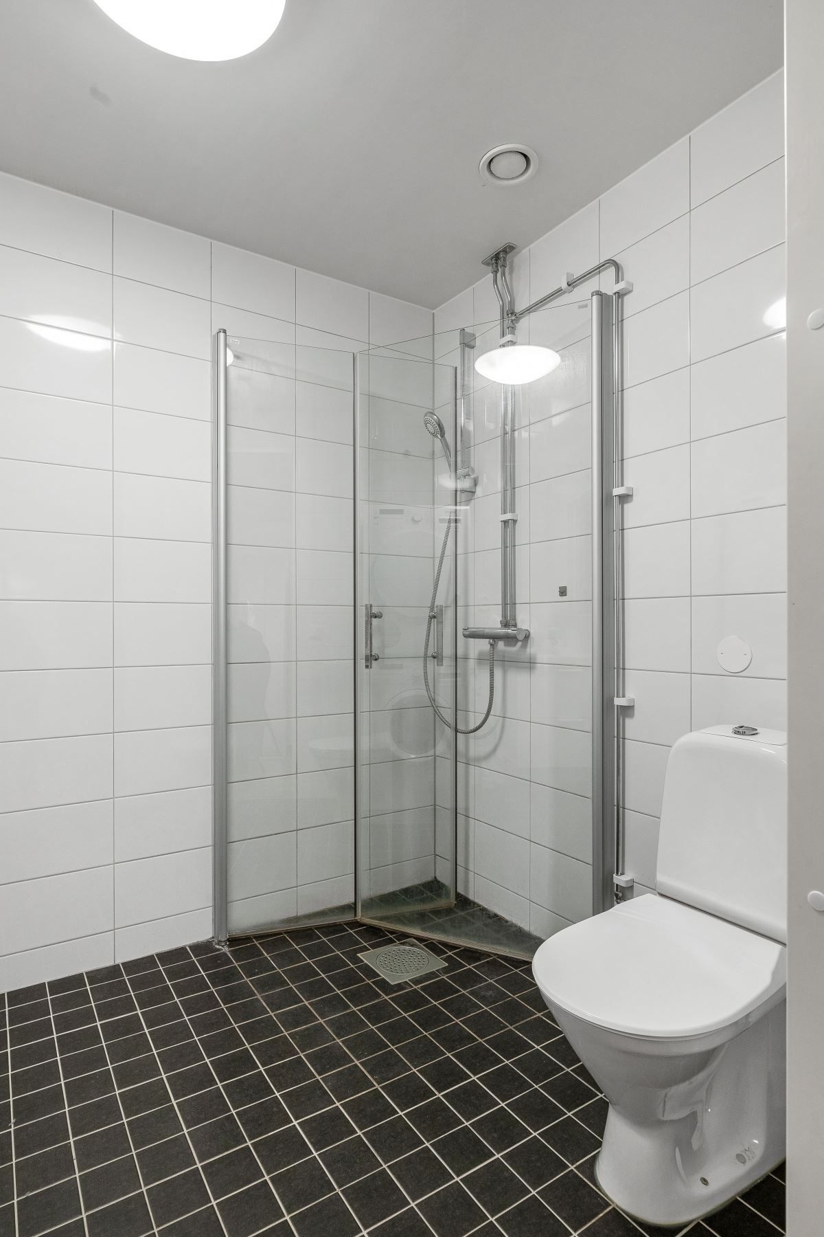 Redan i hallen möts du av goda avhängningsmöjligheter och förvaring. Det stora, helkaklade badrummet ligger direkt till höger och erbjuder både tvättmaskin, torktumlare, dusch och wc.
