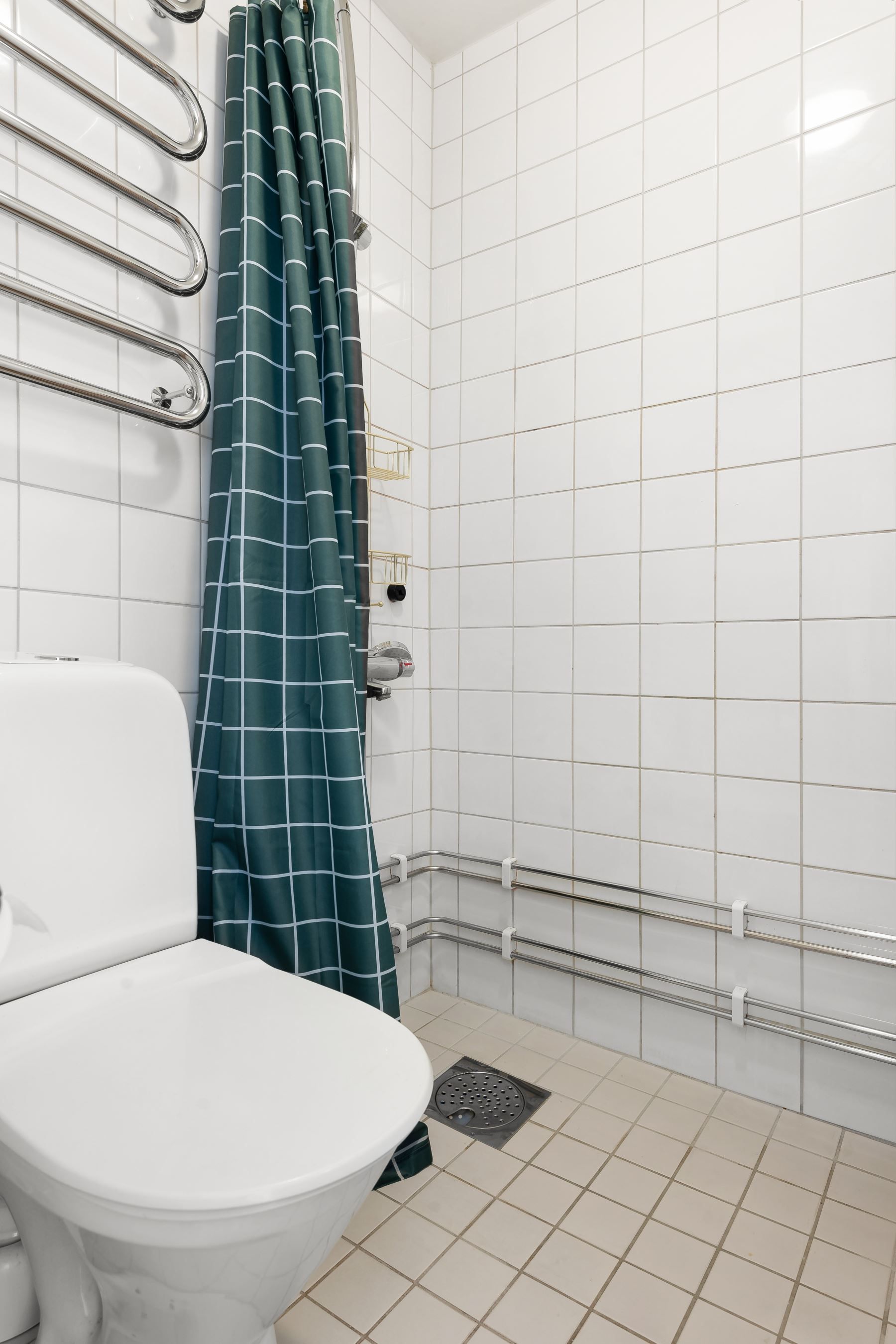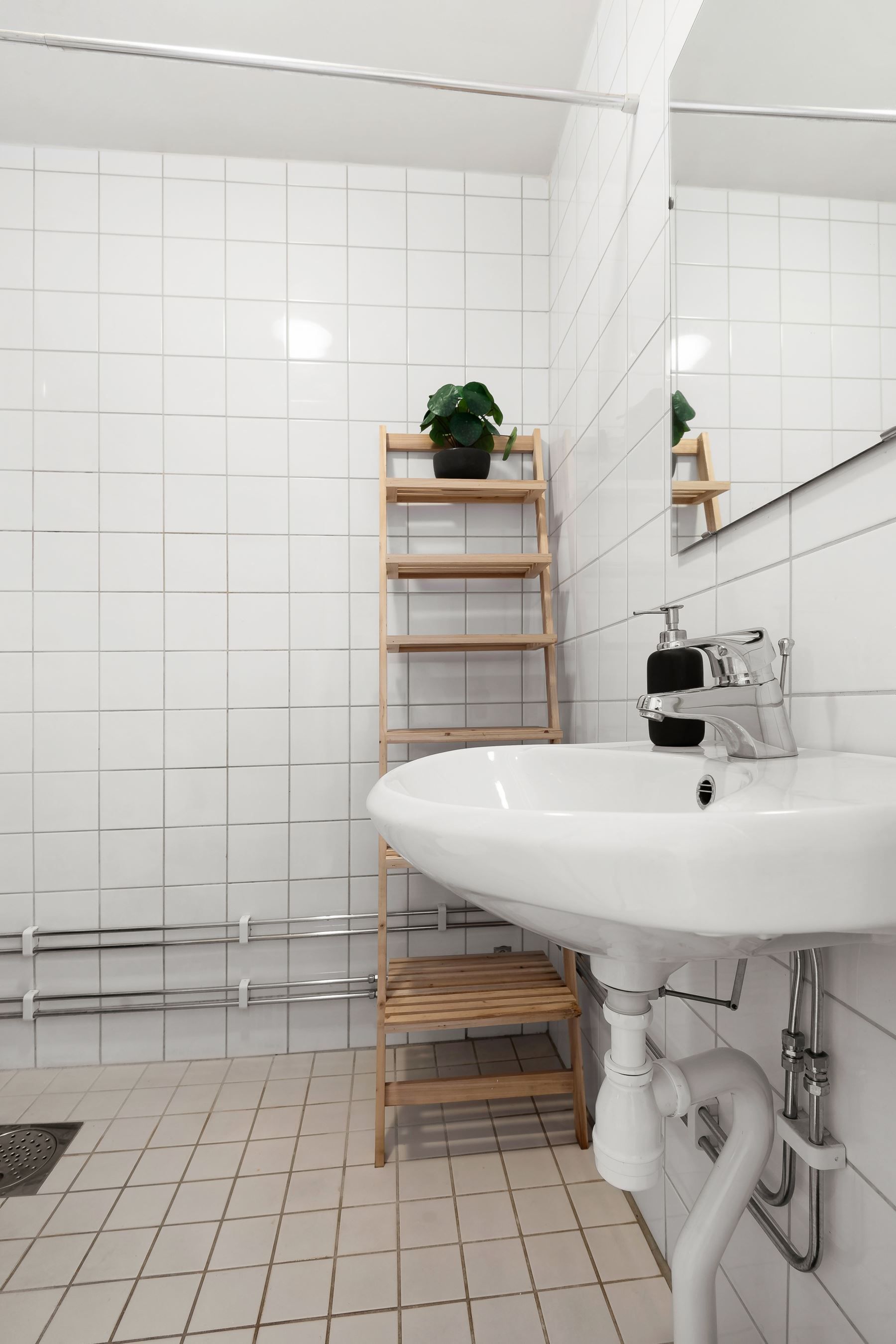 I hallen finns gott om förvaring och plats för avhängning av ytterkläder. Bostadens badrum är helkaklat (stambytt -02) med dusch, wc, handfat och spegelskåp.