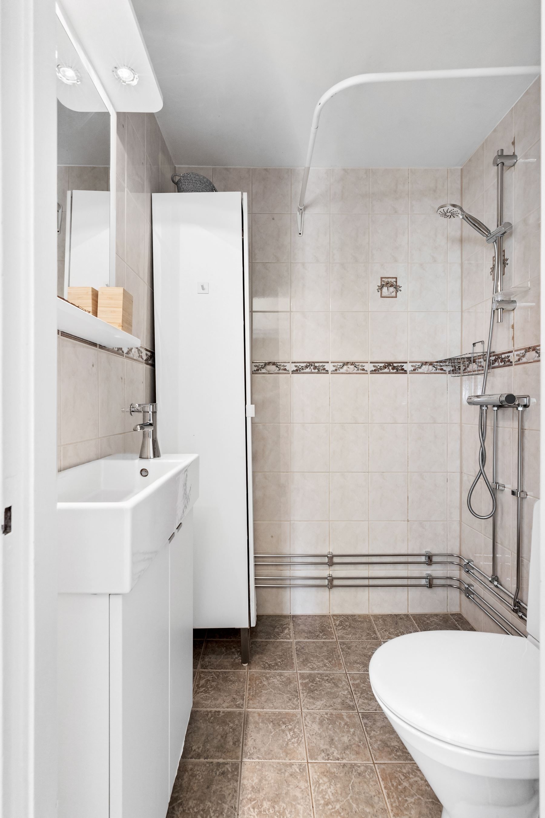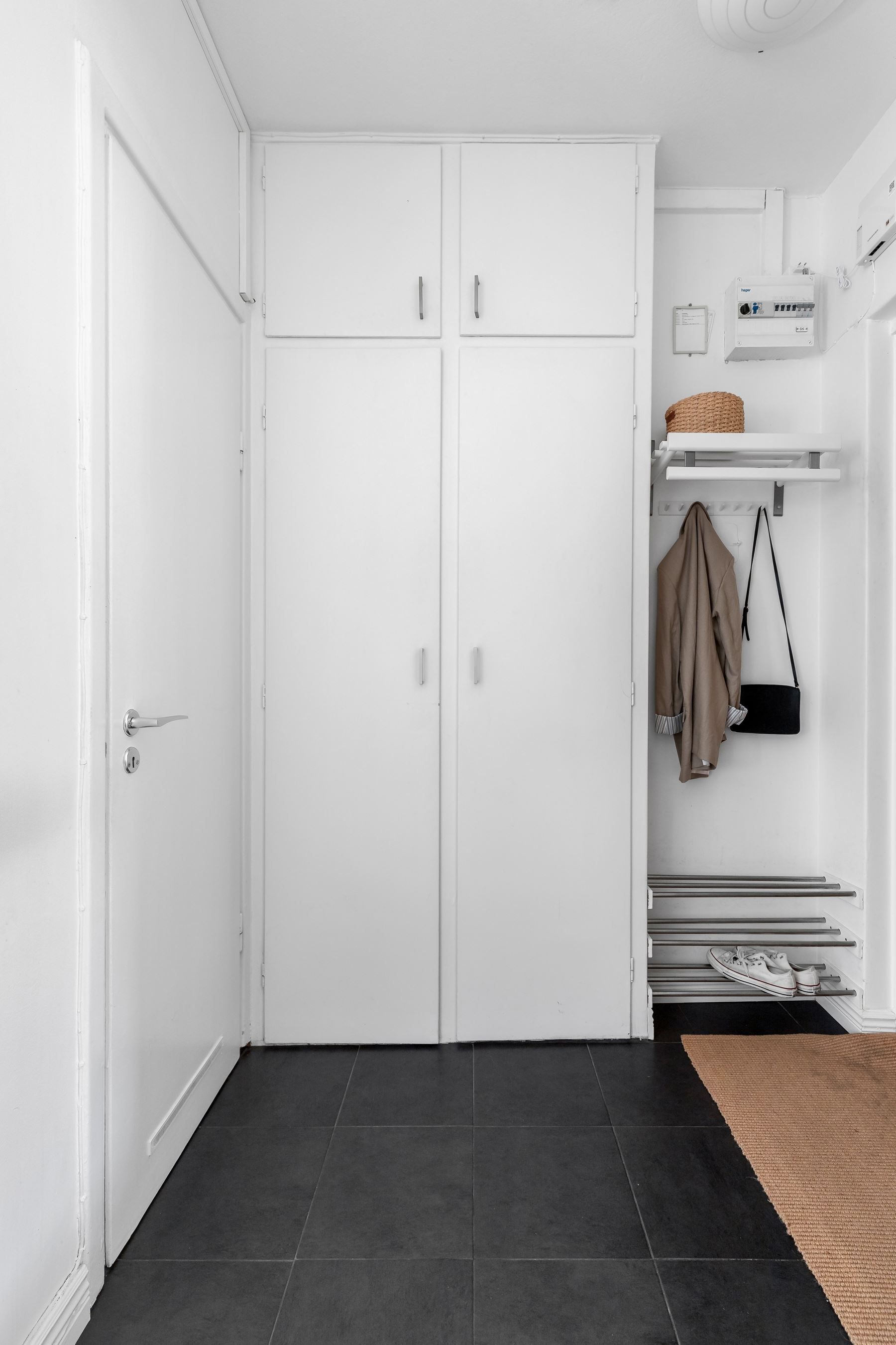 Hall med grått klinkergolv och platsbyggda vita garderober, hatthylla och skohylla. Från hallen når du det rymliga helkaklade badrummet (stambytt -02) med dusch, wc, handfat med praktisk förvaringskommod samt förvaringsskåp.