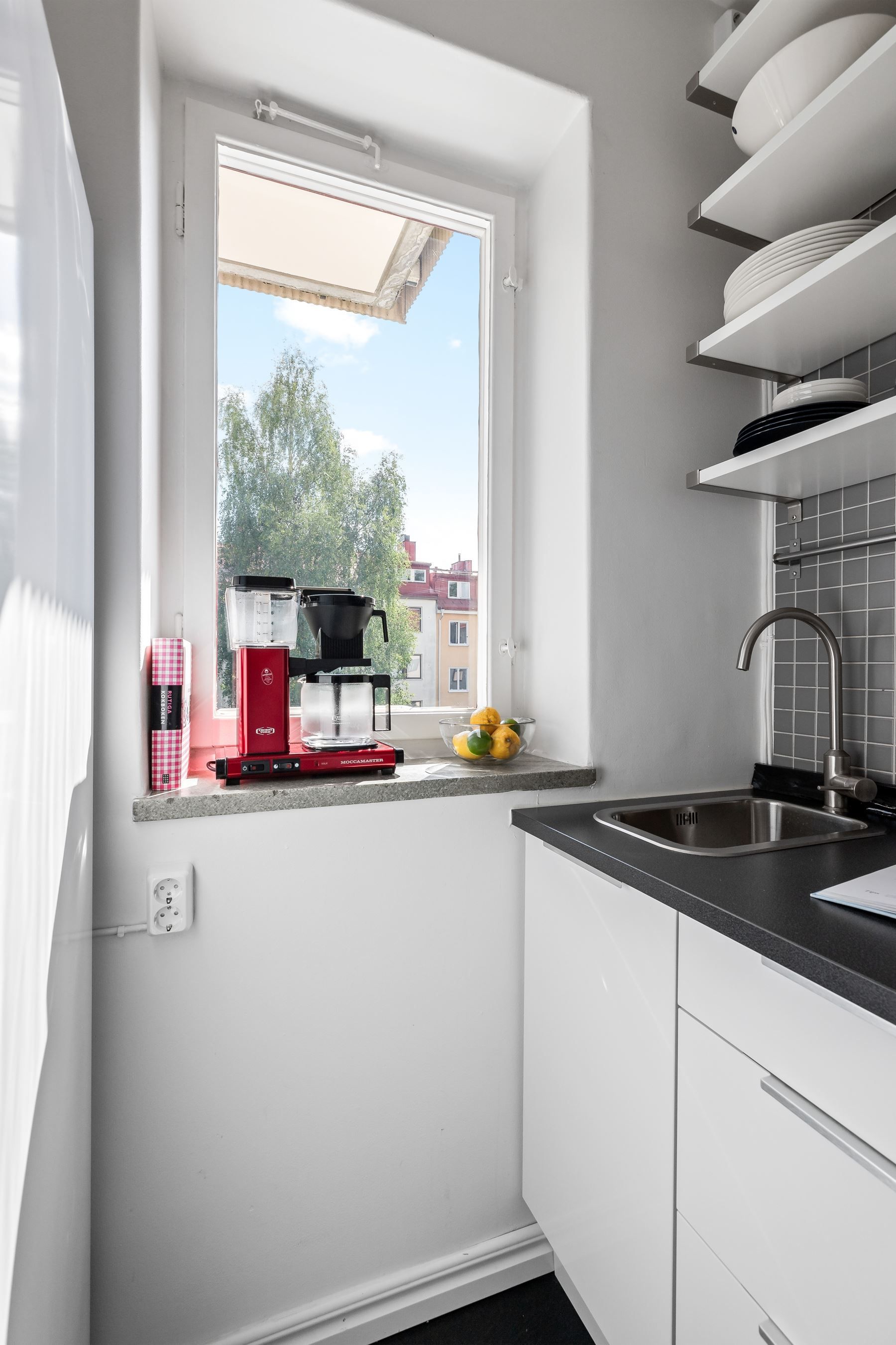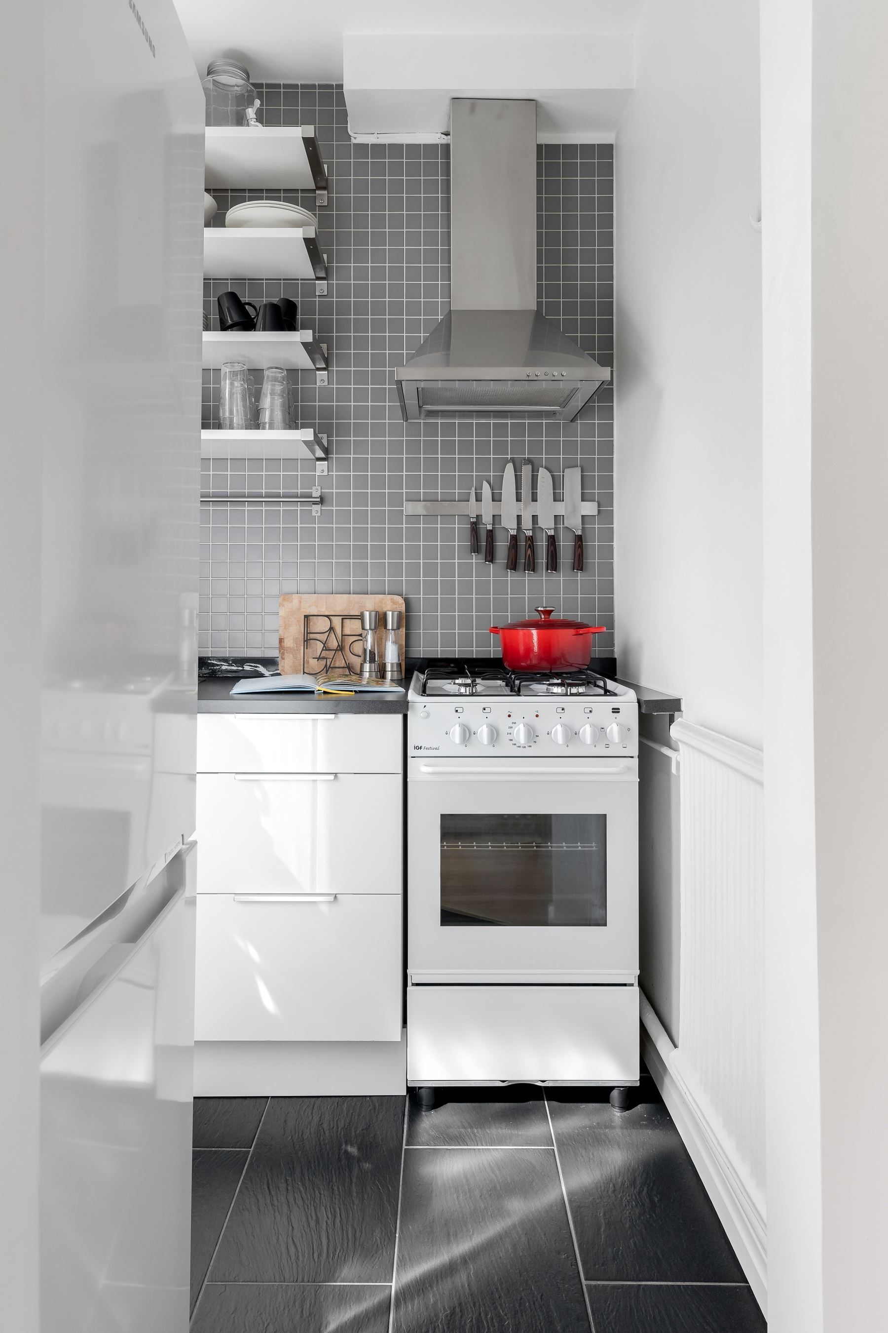 Kök med fönster som släpper in ljus! Mörkgrått klinker på golvet, vita luckor och gasspis för den matlagningsintresserade. Grått kakel hela vägen upp till taket för den rätta "bistrokänslan" samt fullstor kyl och frys.