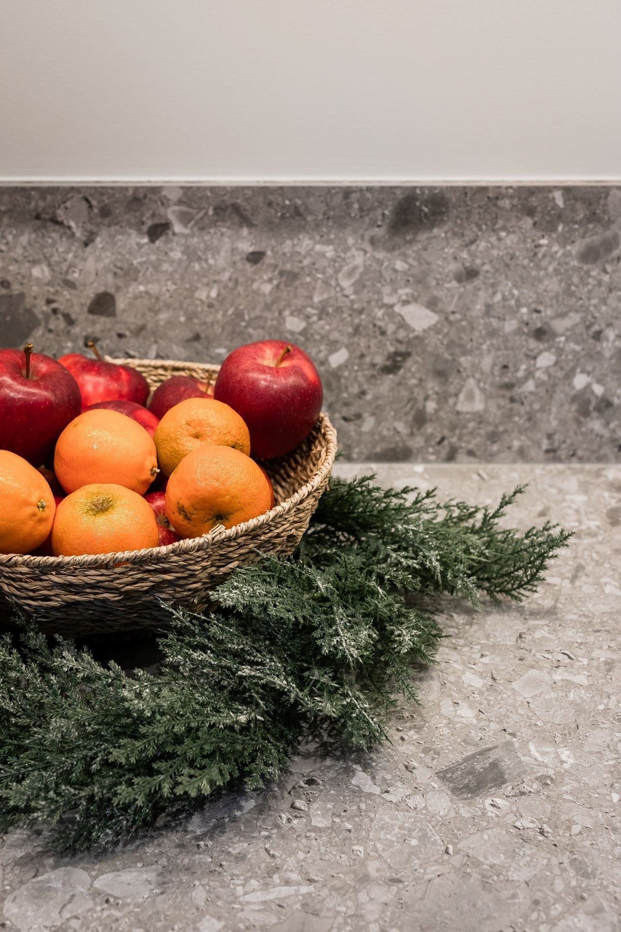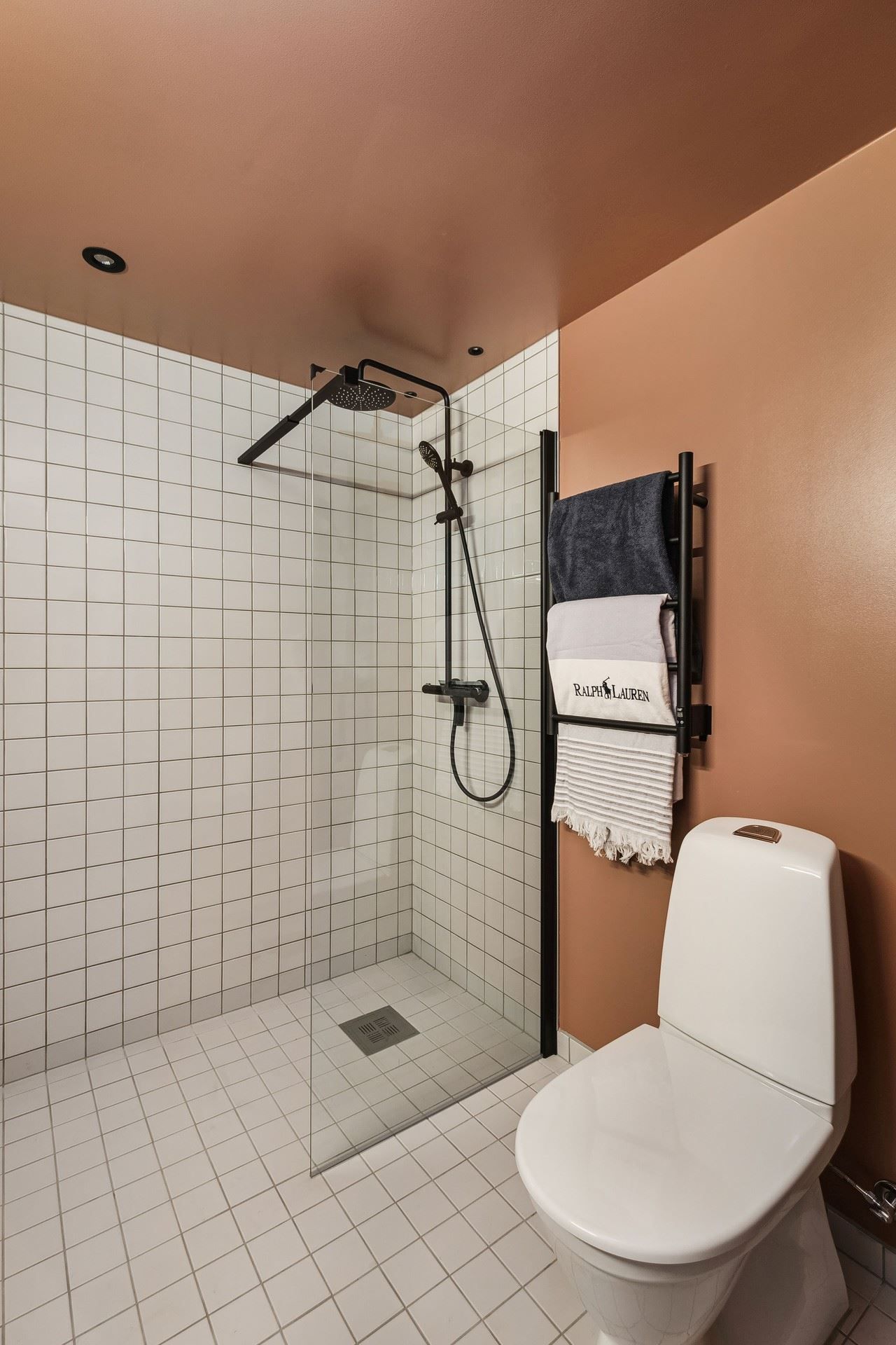 Allrummet på loftet är ett ställe att dra sig tillbaka på och koppla av efter en dag ute i backen. Här finns en mörkblå heltäckningsmatta och vitlaserad träpanel, kompletterat av takfönster som släpper in rikligt med dagsljus. Badrummen är en fröjd för ögat med sina rostrosa väggar, ljusgrå kakel och klinker samt svarta detaljer som skapar en harmonisk atmosfär.