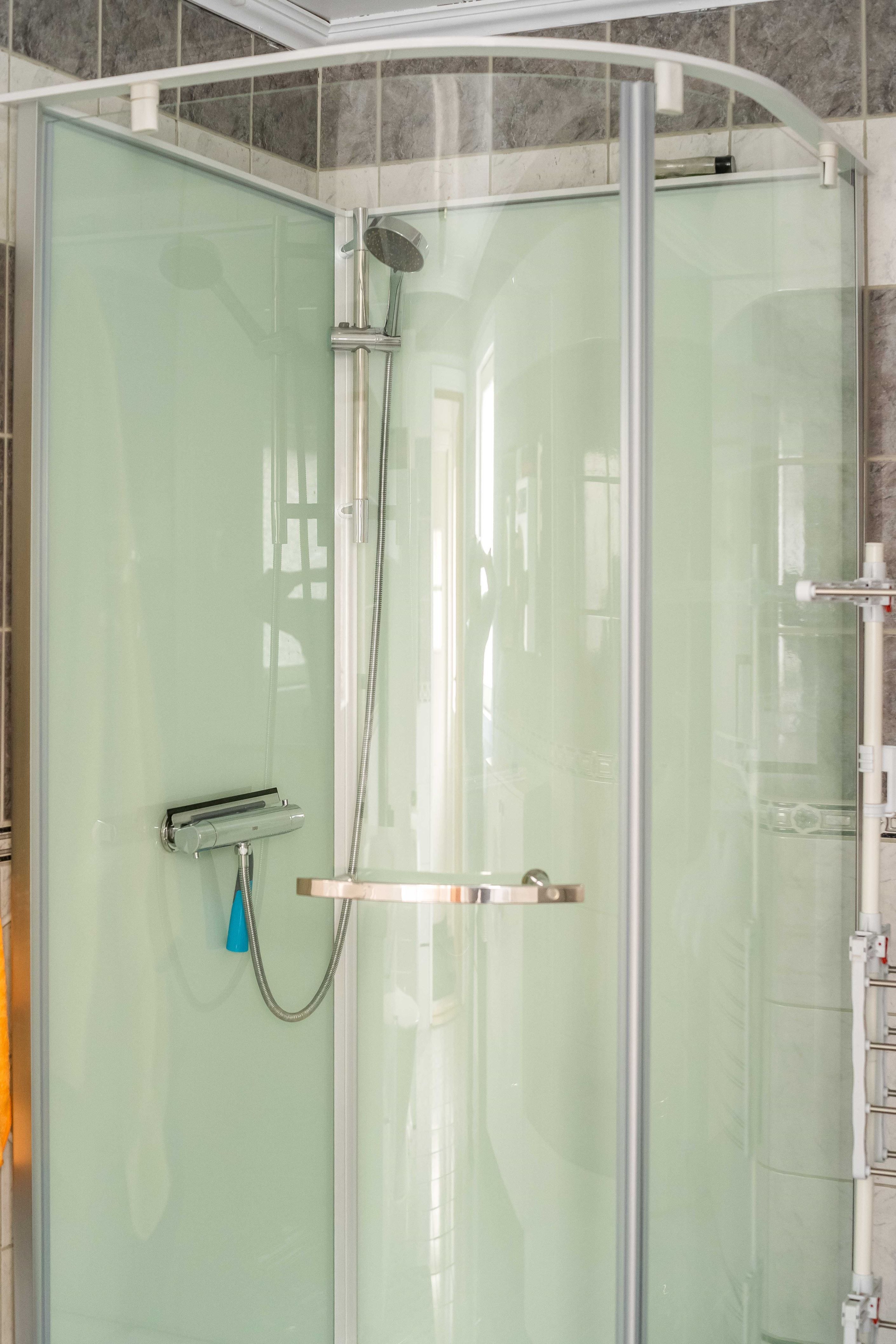 När du stiger in genom ytterdörren välkomnas du av en ljus och luftig hall med gott om plats för avhängning. Här finns skjutdörrsgarderober där du smidigt förvarar skor och ytterkläder. Rakt fram från hallen finns husets stora, helkaklade badrum. Här hittar du både en tvättmaskin och torktumlare, vilket gör det extra praktiskt. Duschkabinen i glas och de smakfulla kakelvalen ger en modern känsla, och de grå nyanserna skapar en tidlös och stilren atmosfär.