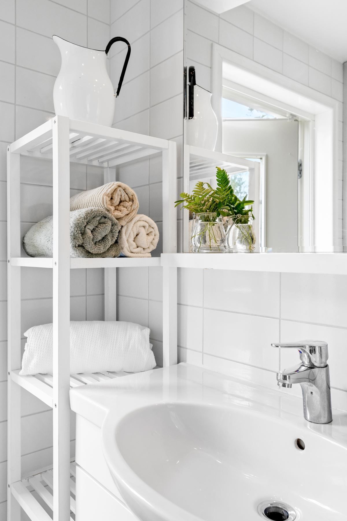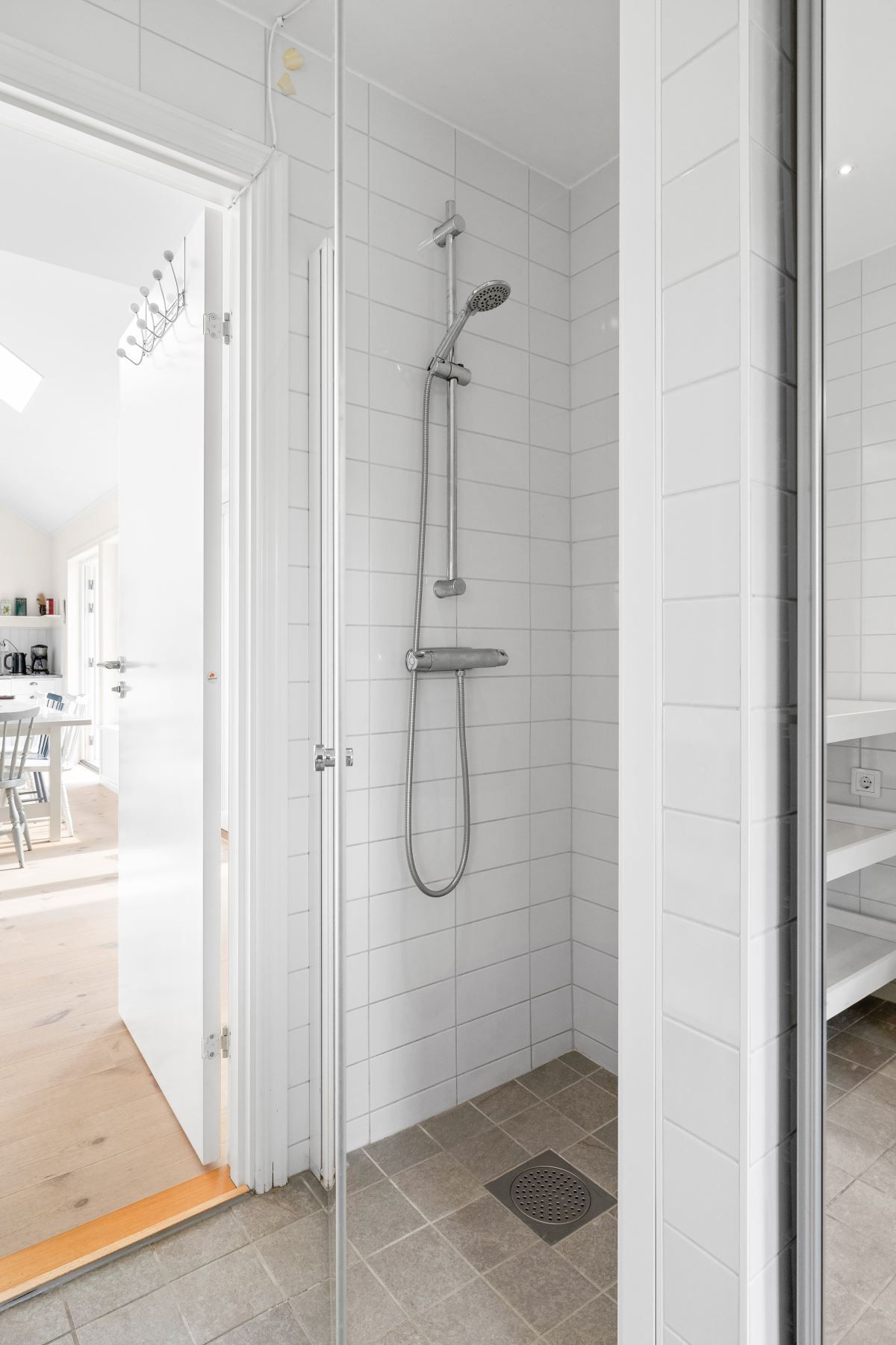 Du välkomnas in i huvudbyggnaden med en ljus och öppen hall med möjlighet för avhängning och ett anslutande förråd för extra förvaring. Vidare in i bostaden har du ett luftigt och öppet vardagsrum med ca 4 meter takhöjd som skapar en fantastisk rymd och atmosfär. Kök och matplats i öppen planlösning med dubbla utgångar till den soldränkta altanen. Tre bra sovrum varav ett med skjutdörrsgarderober och ett helkaklat badrum med dusch och groventré. En trappa upp nås det härliga loftet som kan nyttjas som ett allrum eller stort sovrum. Genomtänkt med det charmiga ovala fönstret mot entréplanet för flödande ljusinsläpp och ett fönster med utsikt mot skogen.