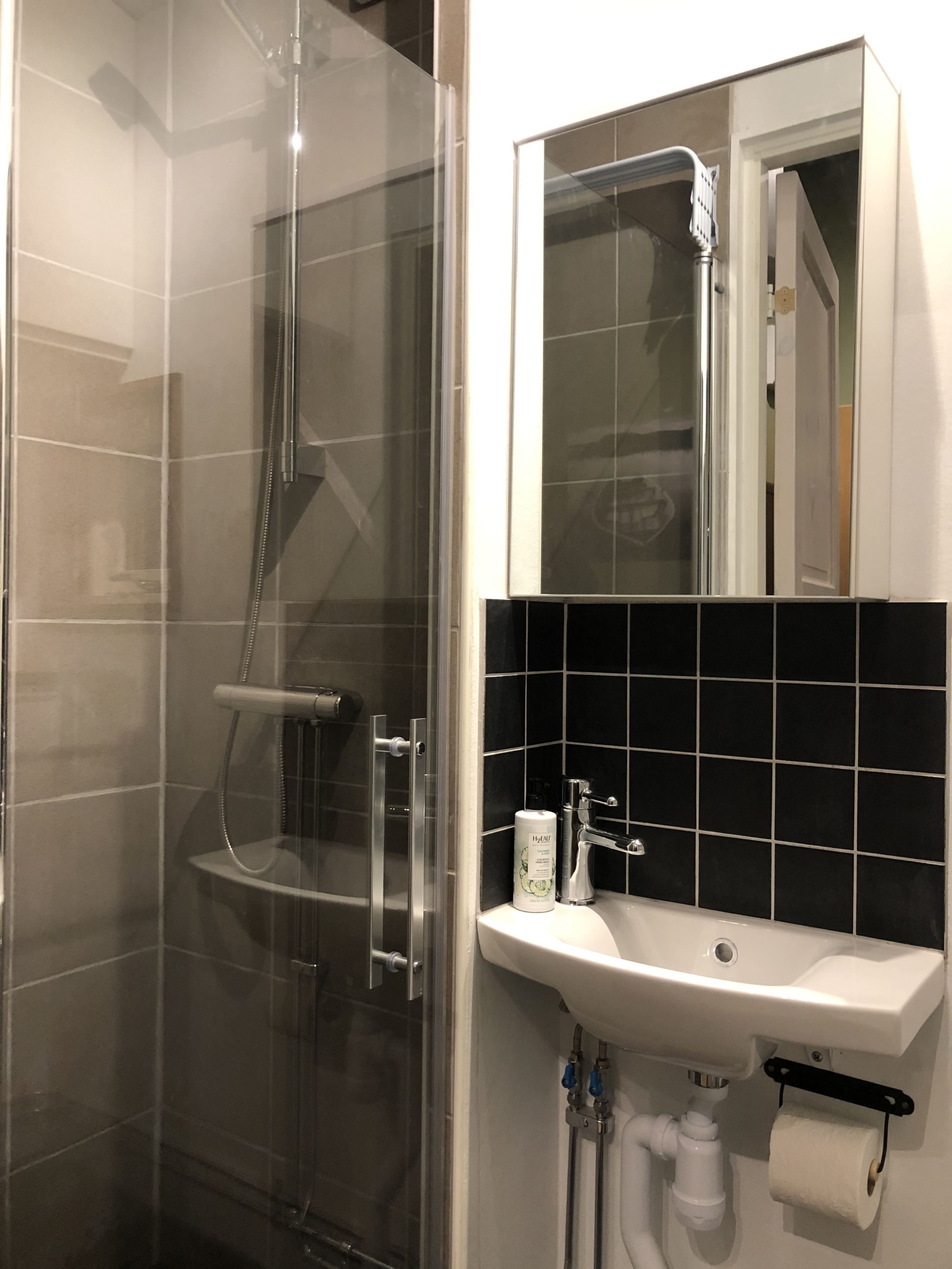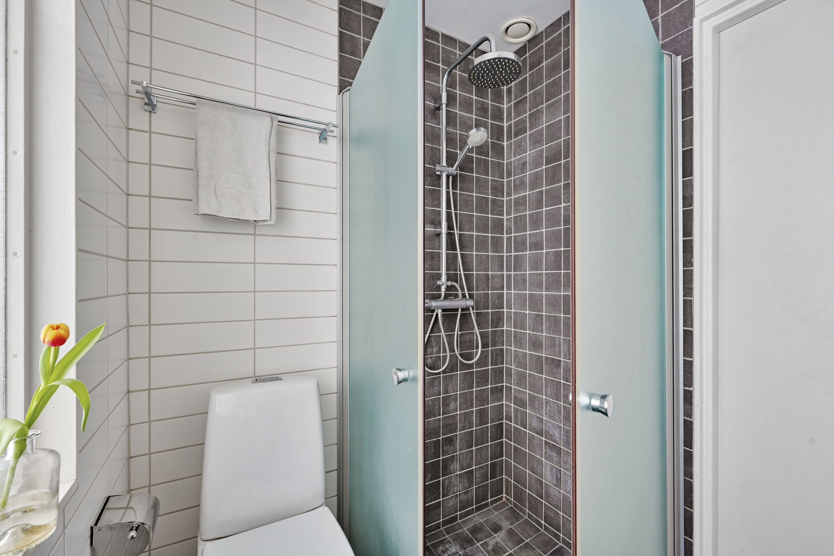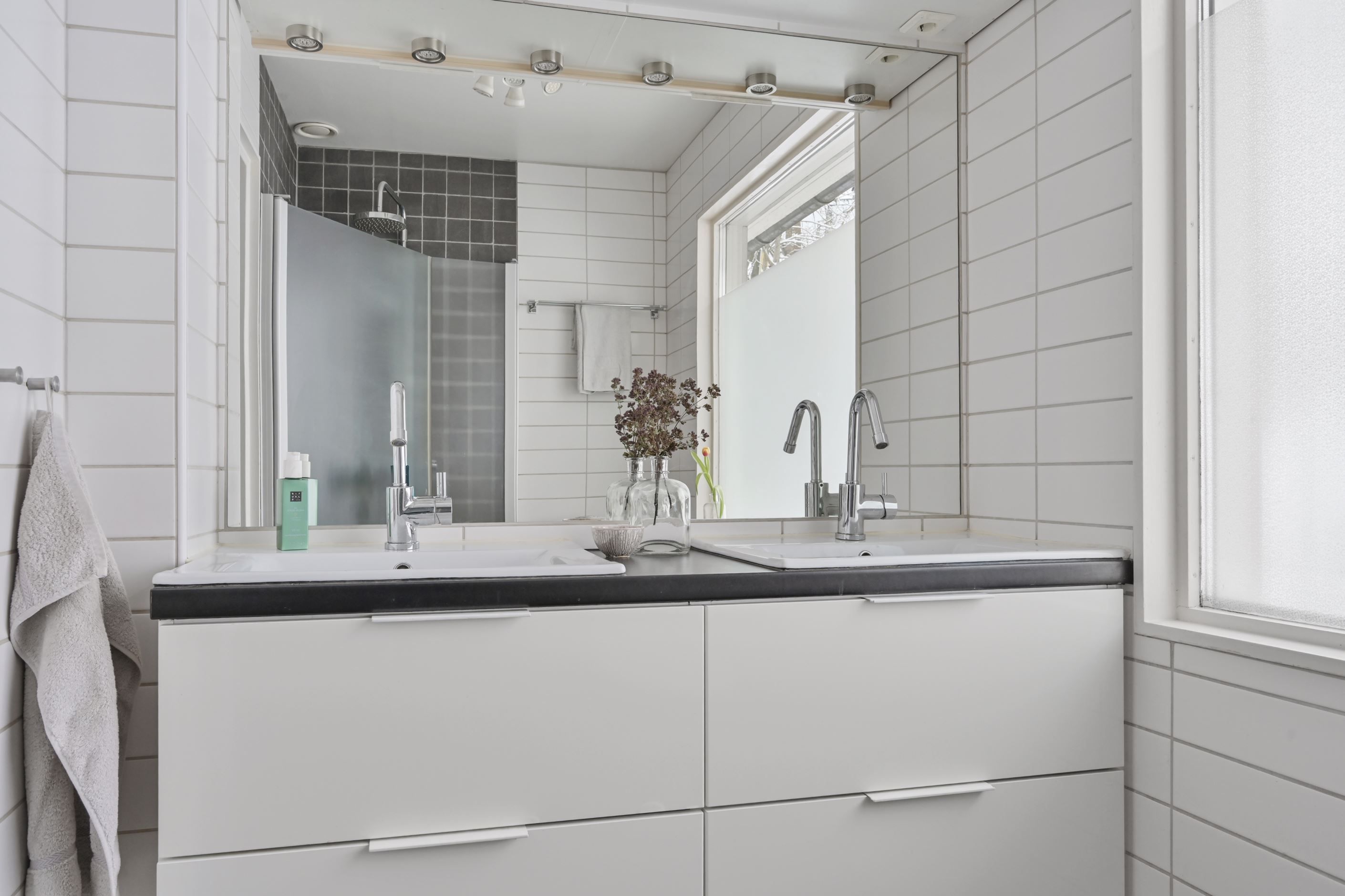Det helkaklade badrummet på övre plan är utrustat med dusch, dubbelhandfat och wc. Ett frostat fönster ger fint ljusinsläpp samtidigt som insynen begränsas.