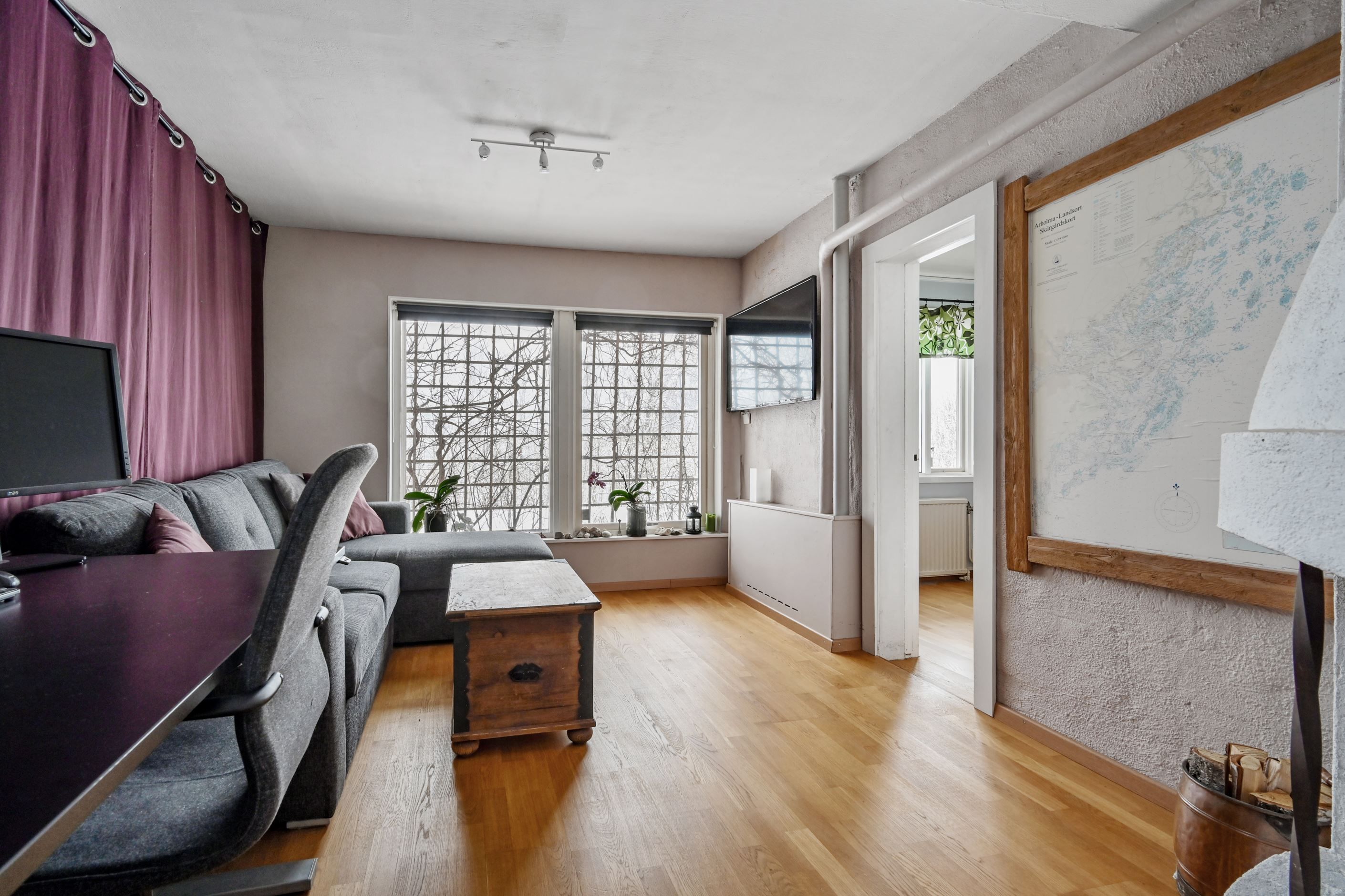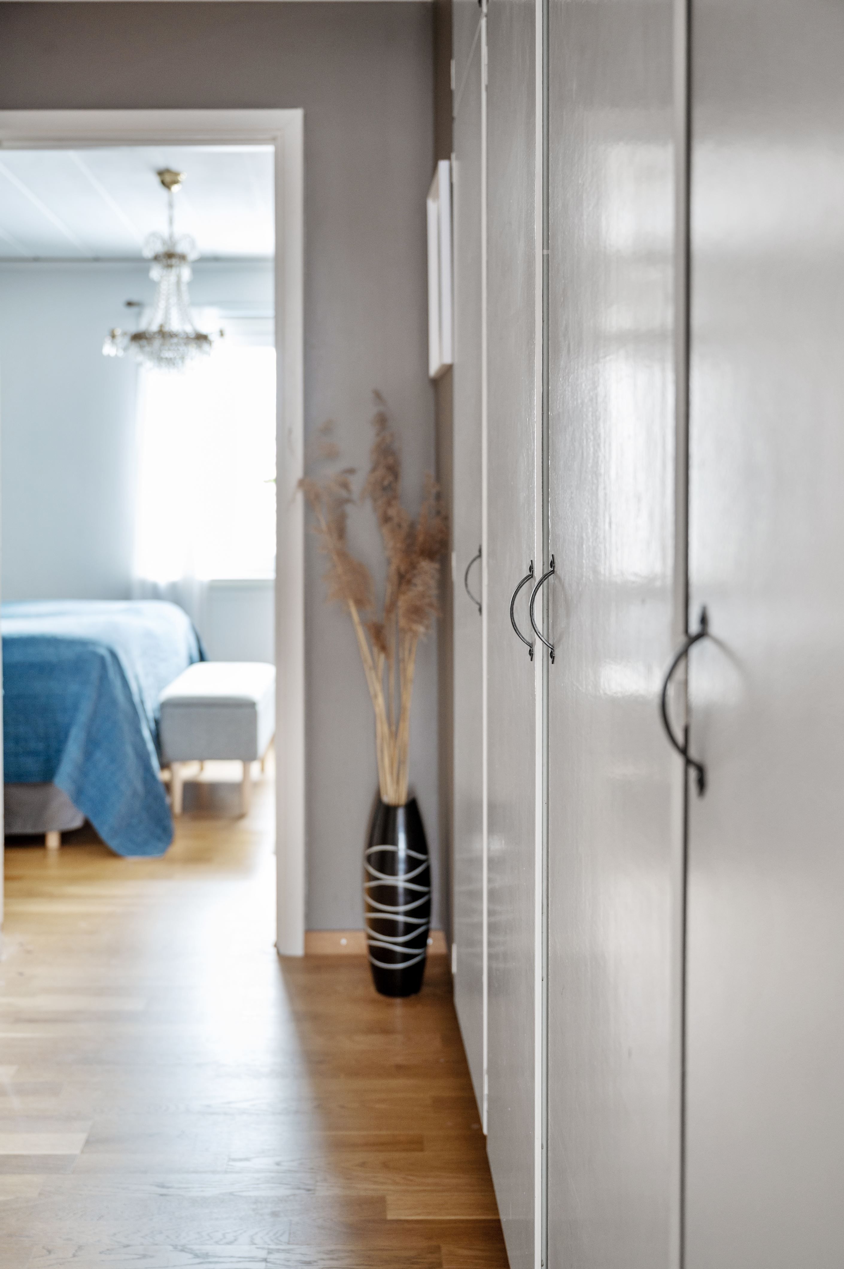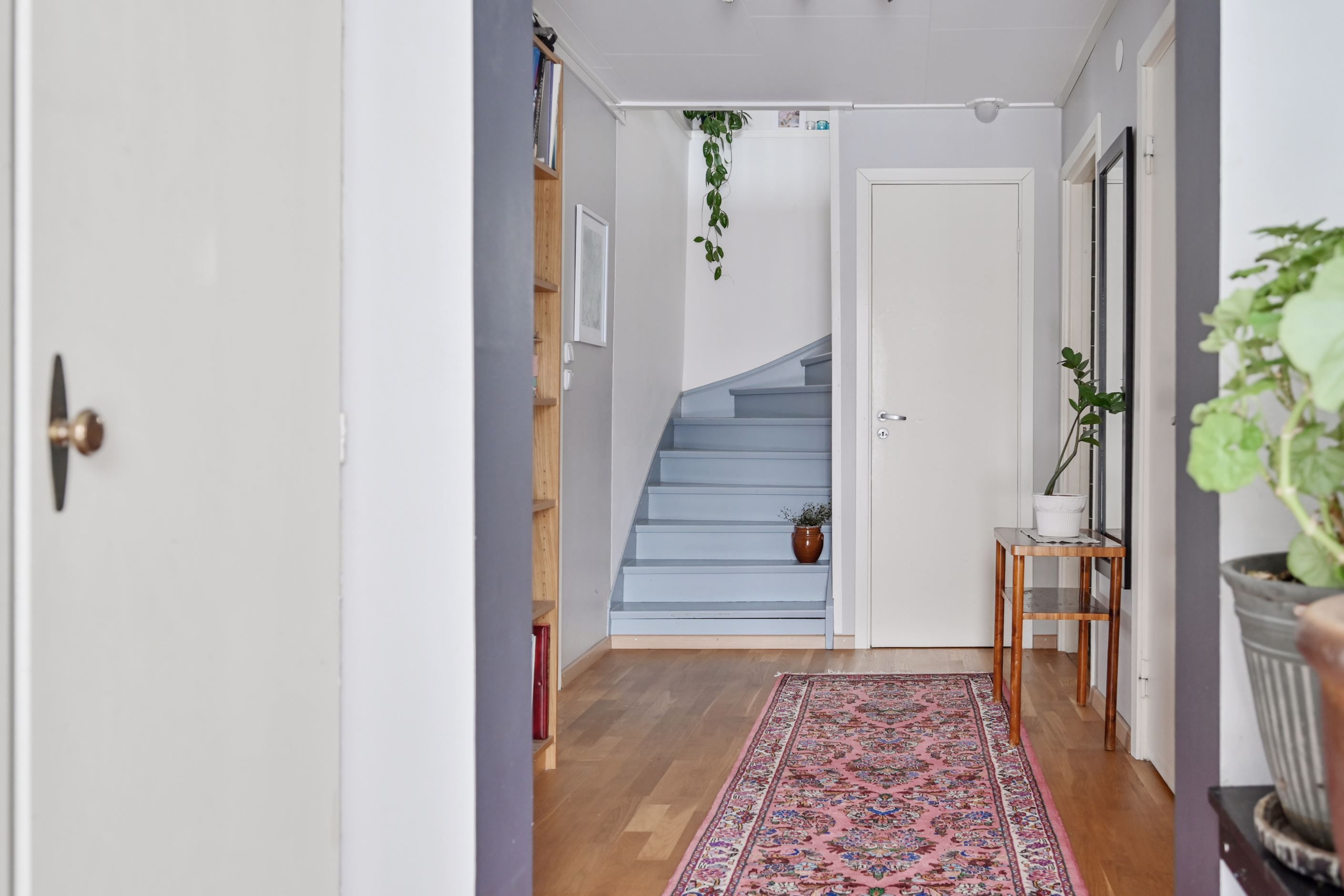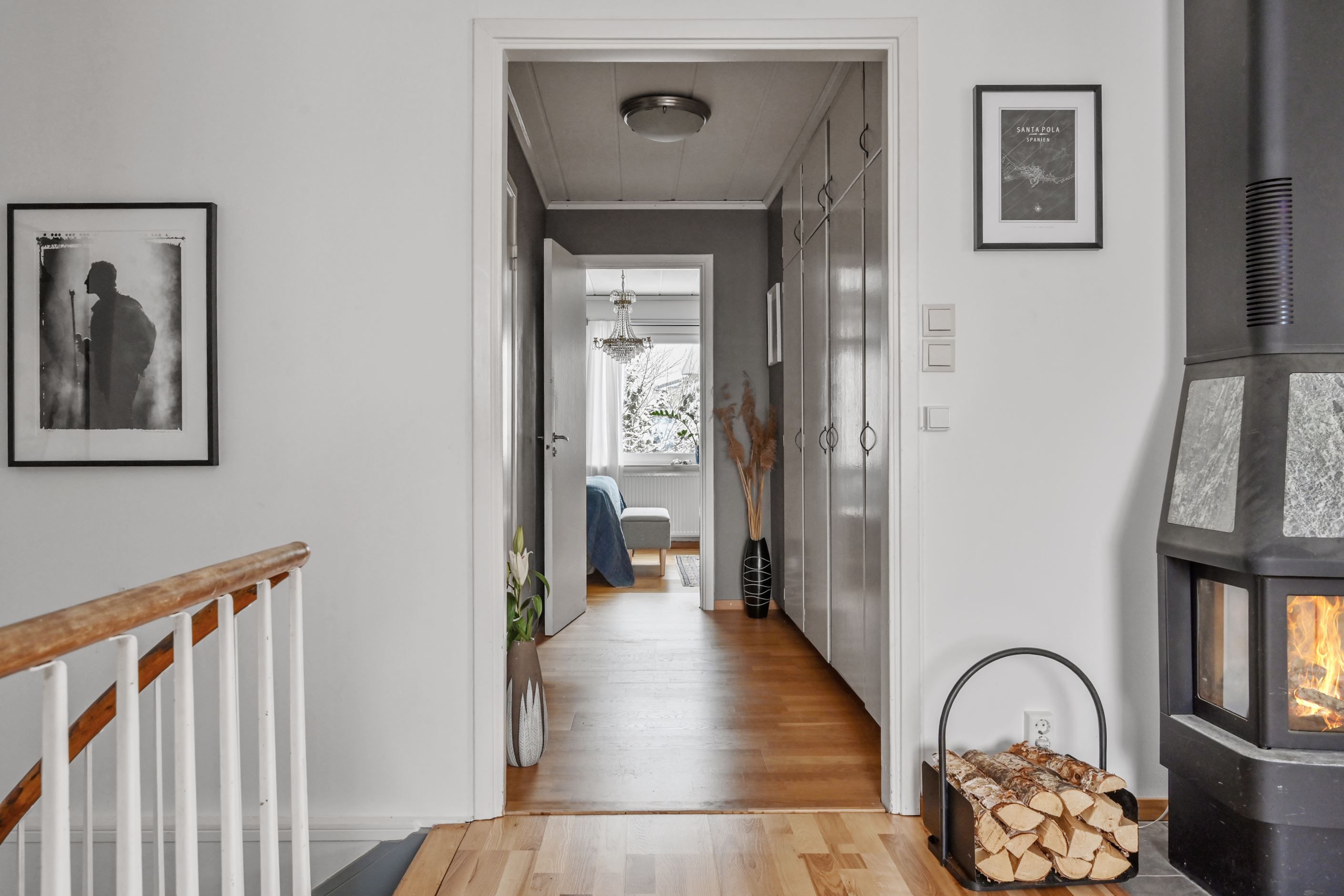 Väl innanför ytterdörren möts man av en välkomnande hall med klinkergolv. Direkt till vänster ligger ett av entréplanets sovrum. I anslutning finns en helkaklad gäst-wc. Till höger nås ytterligare två sovrum, varav ett idag disponeras som sällskapsrum med öppen spis med insats – en trivsam plats för kvällar med familj och vänner.