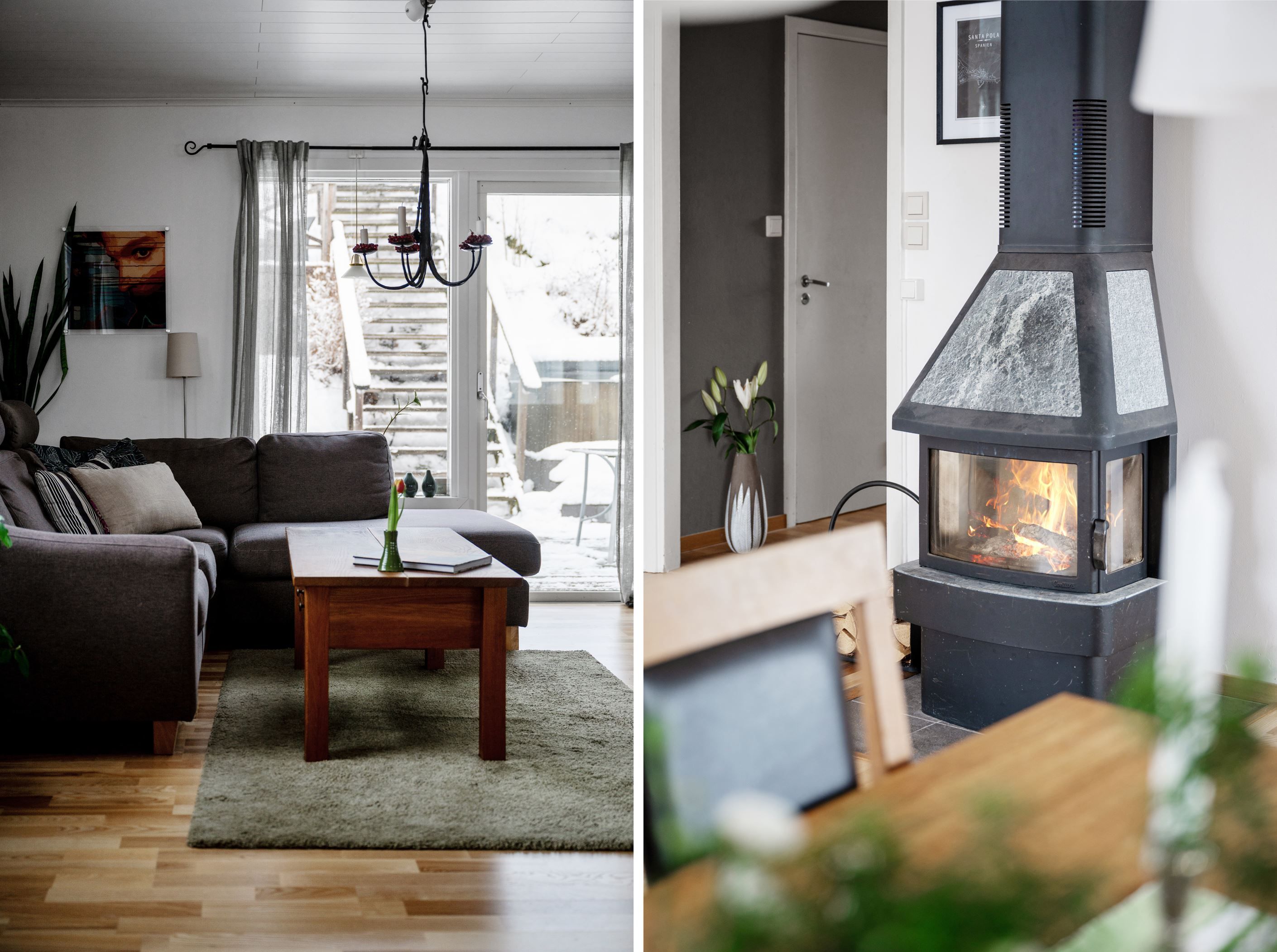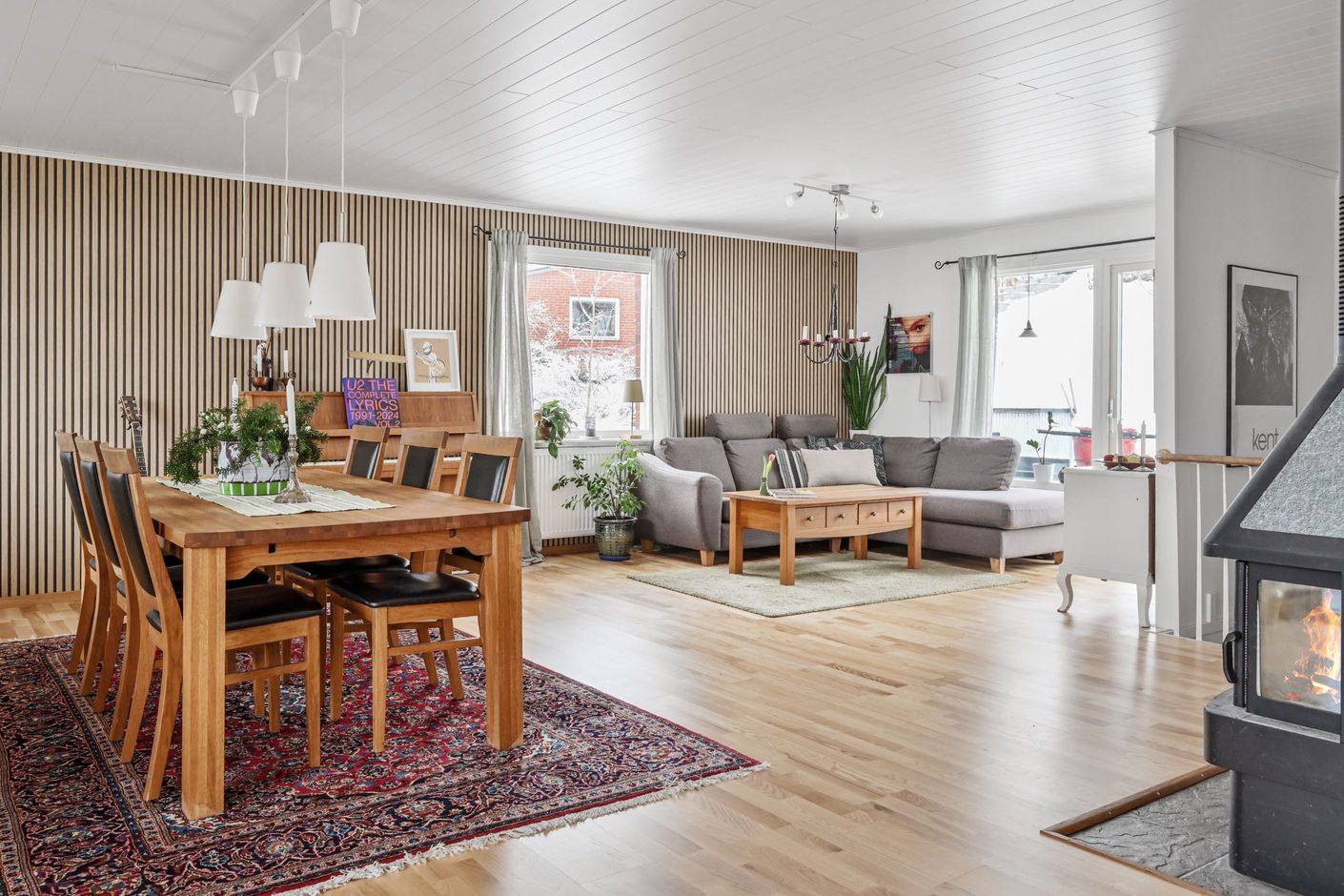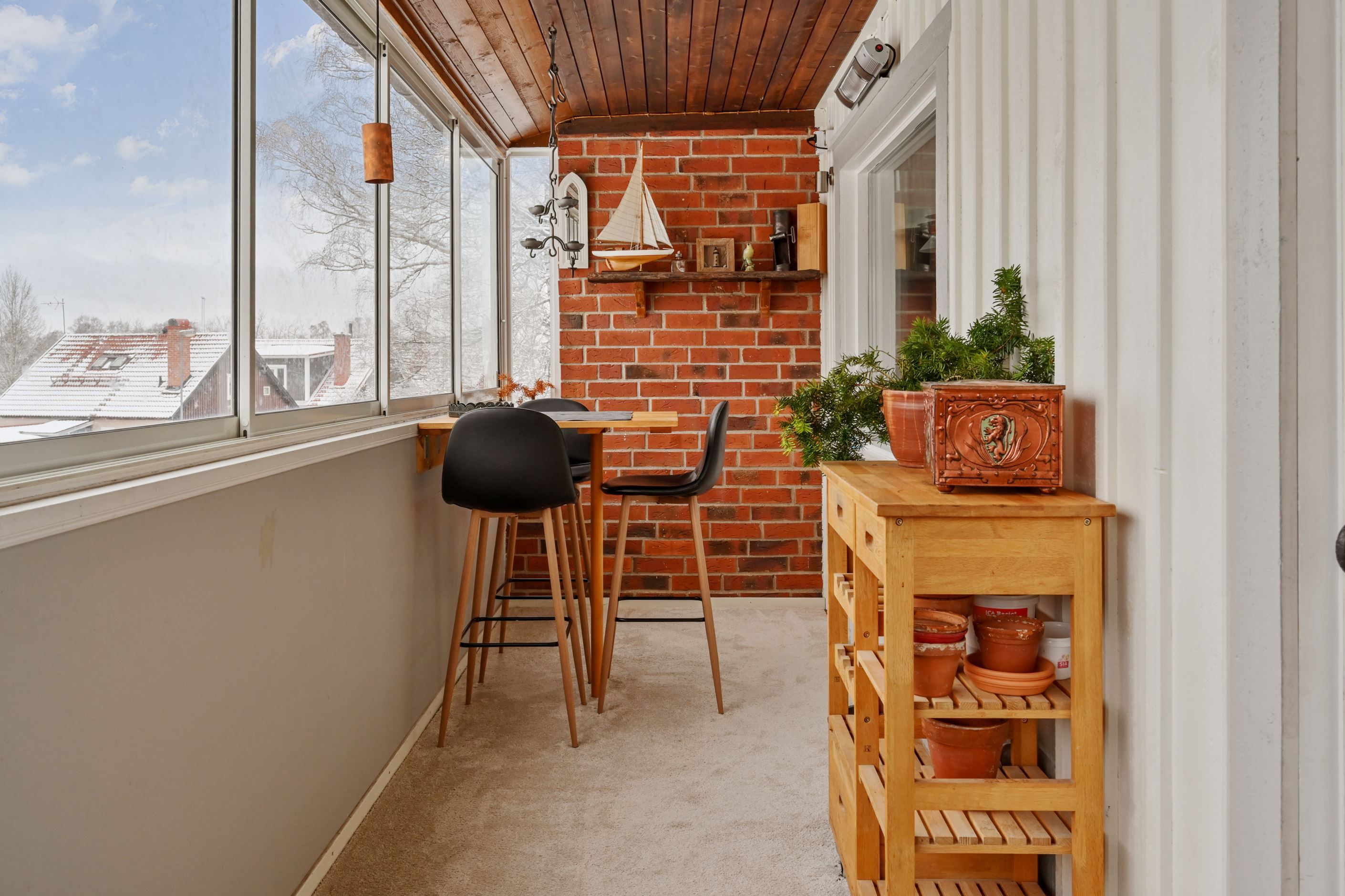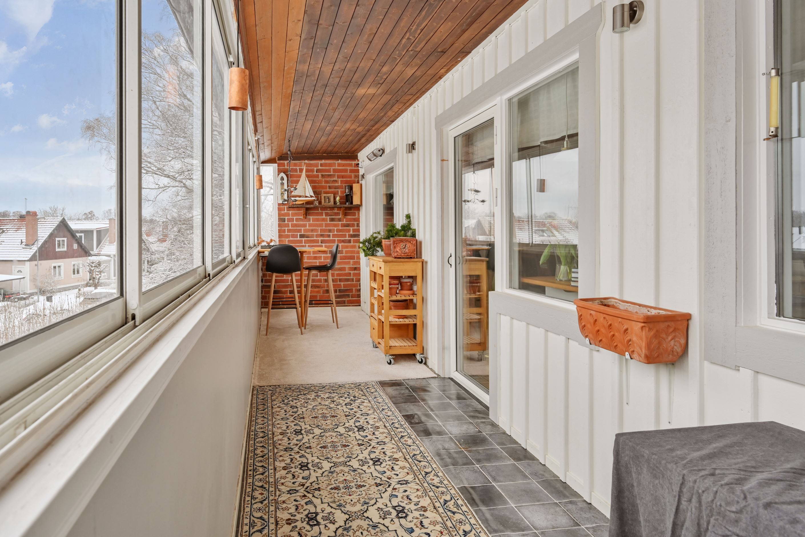 På övre plan öppnar huset upp sig i ett rymligt och ljust vardagsrum med stora fönsterpartier och fint ljusinsläpp. Här finns plats för både stor soffgrupp och matbord. Braskamin bidrar med både värme och atmosfär. Från vardagsrummet nås en stor inglasad balkong med gott om plats för både matgrupp och loungemöbler, samt ytterligare terrass i skyddat läge.
