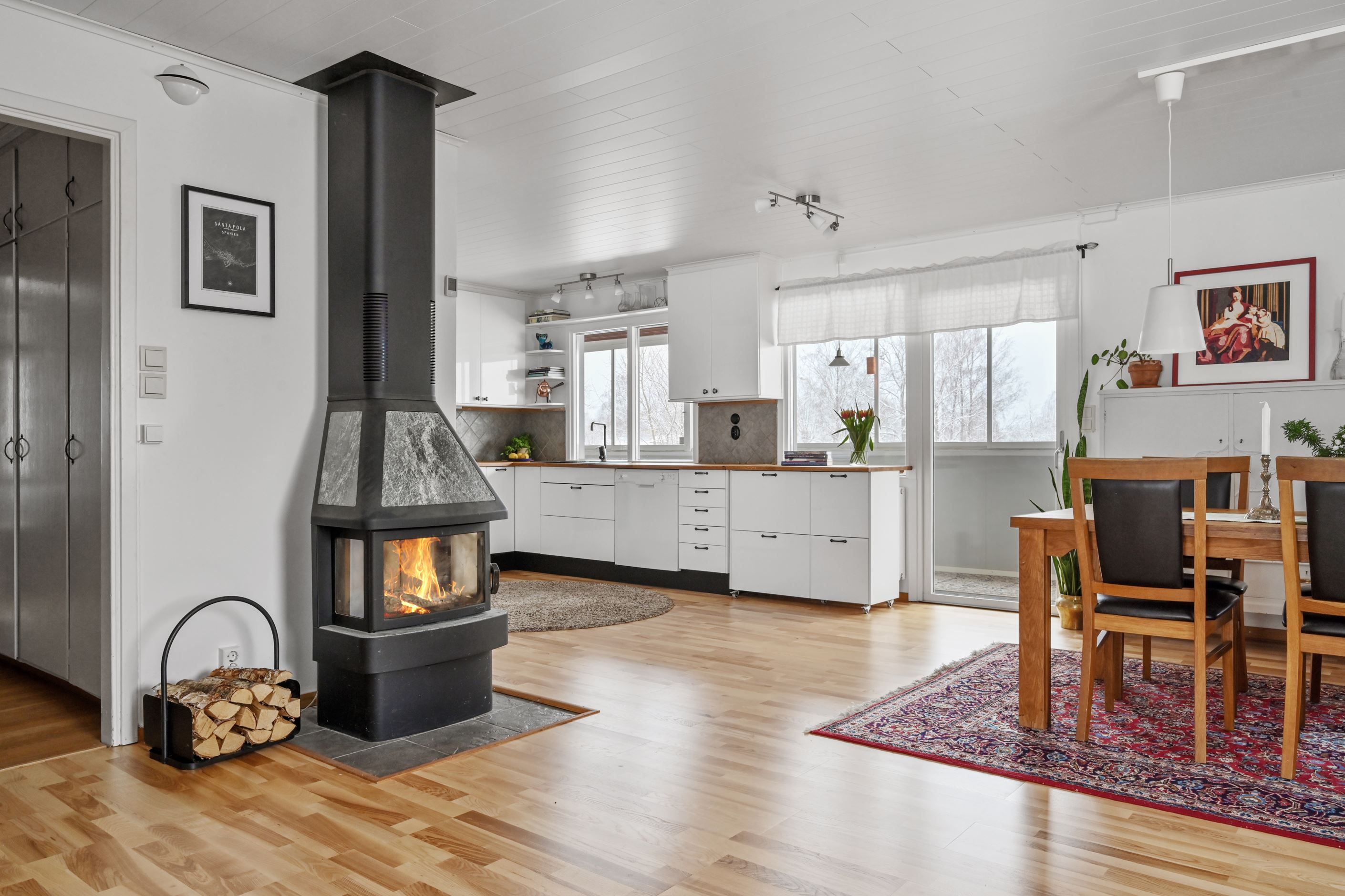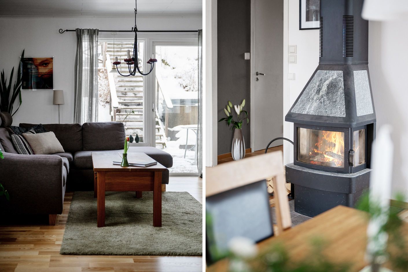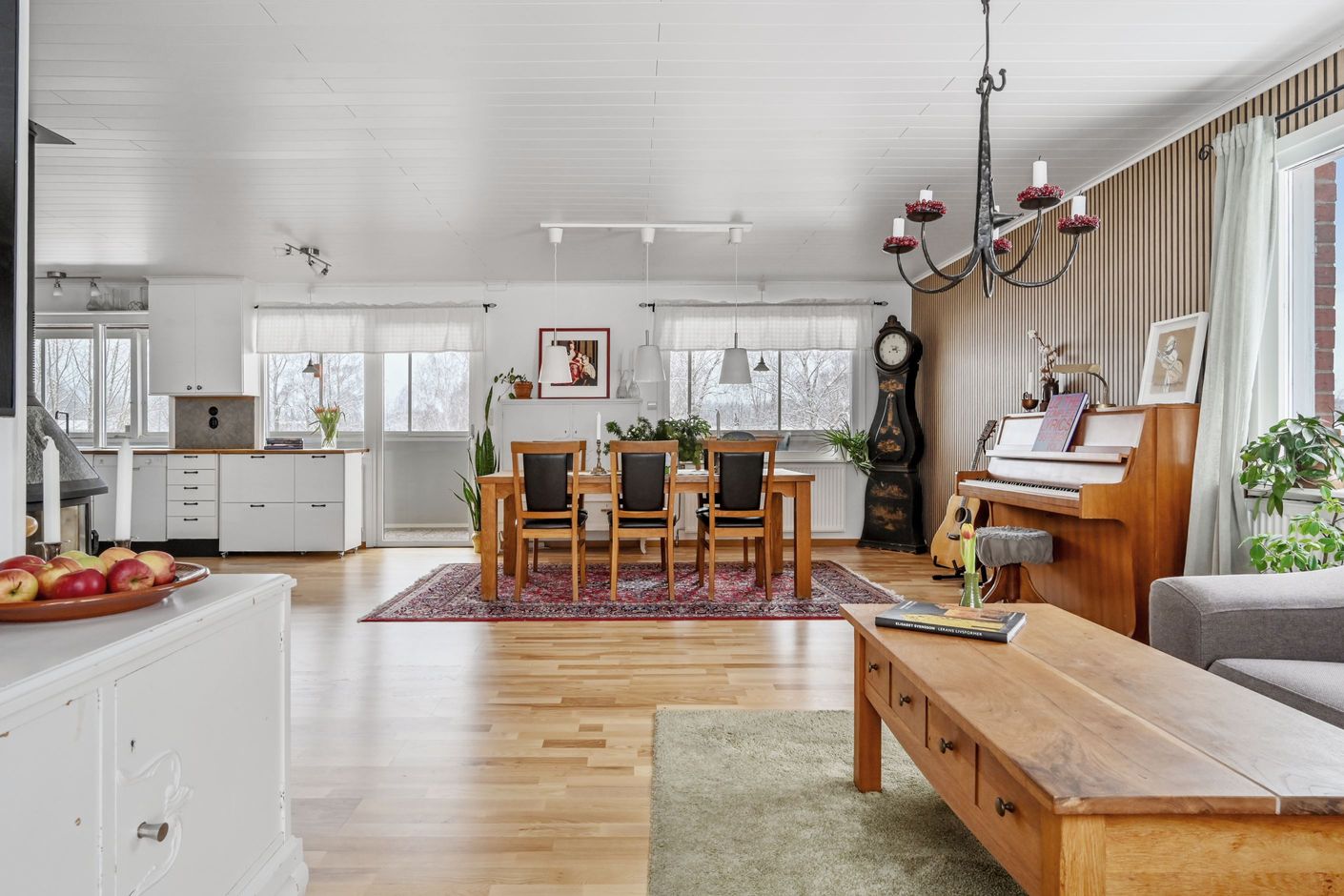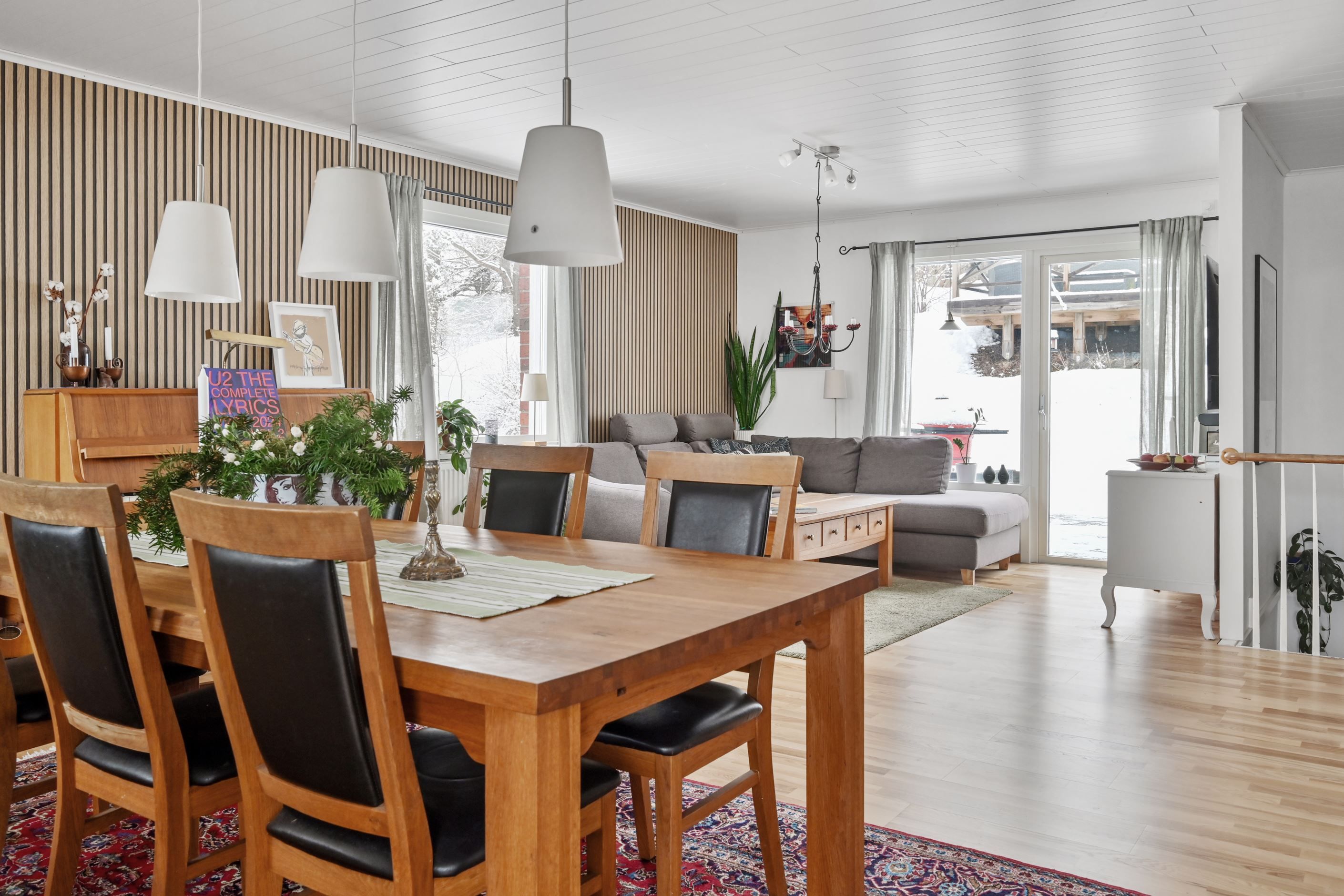 På övre plan öppnar huset upp sig i ett rymligt och ljust vardagsrum med stora fönsterpartier och fint ljusinsläpp. Här finns plats för både stor soffgrupp och matbord. Braskamin bidrar med både värme och atmosfär. Från vardagsrummet nås en stor inglasad balkong med gott om plats för både matgrupp och loungemöbler, samt ytterligare terrass i skyddat läge.