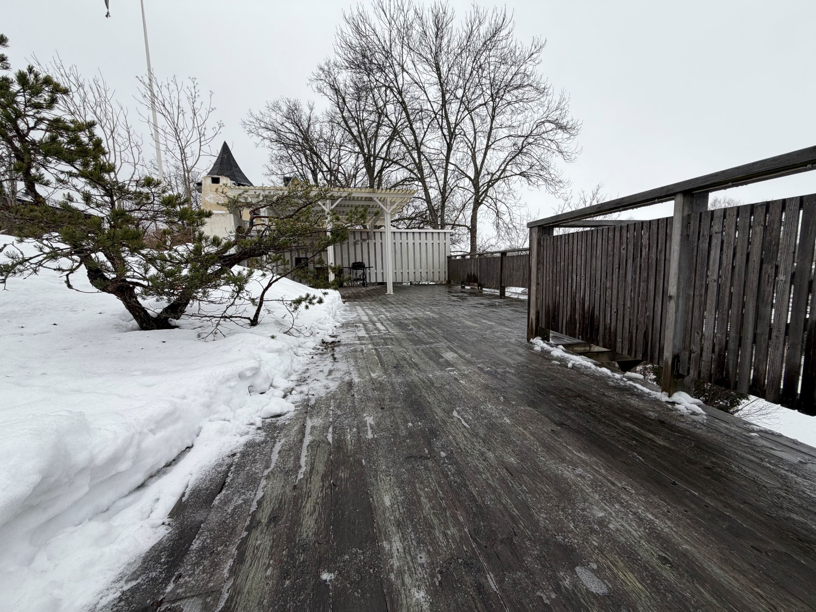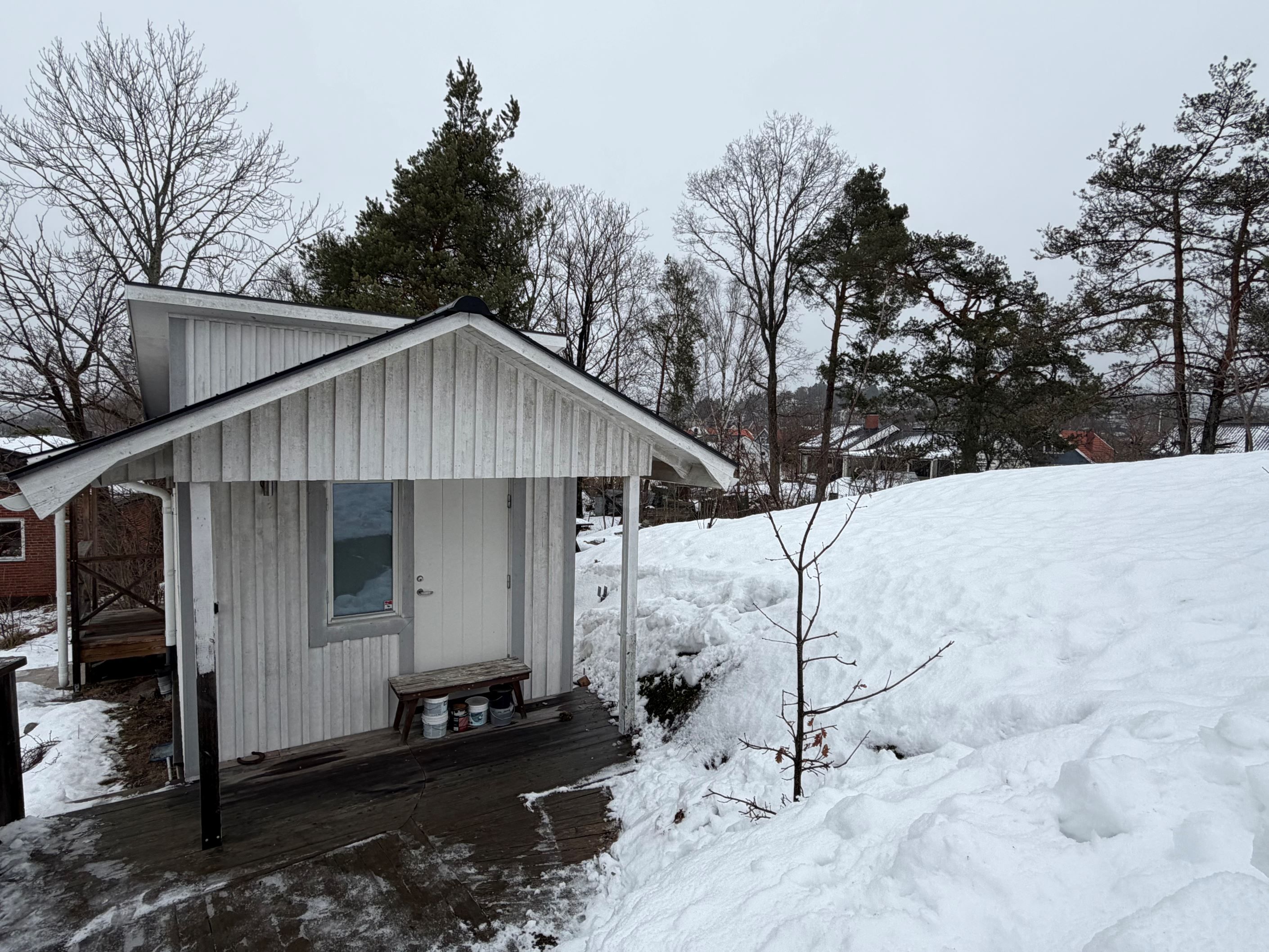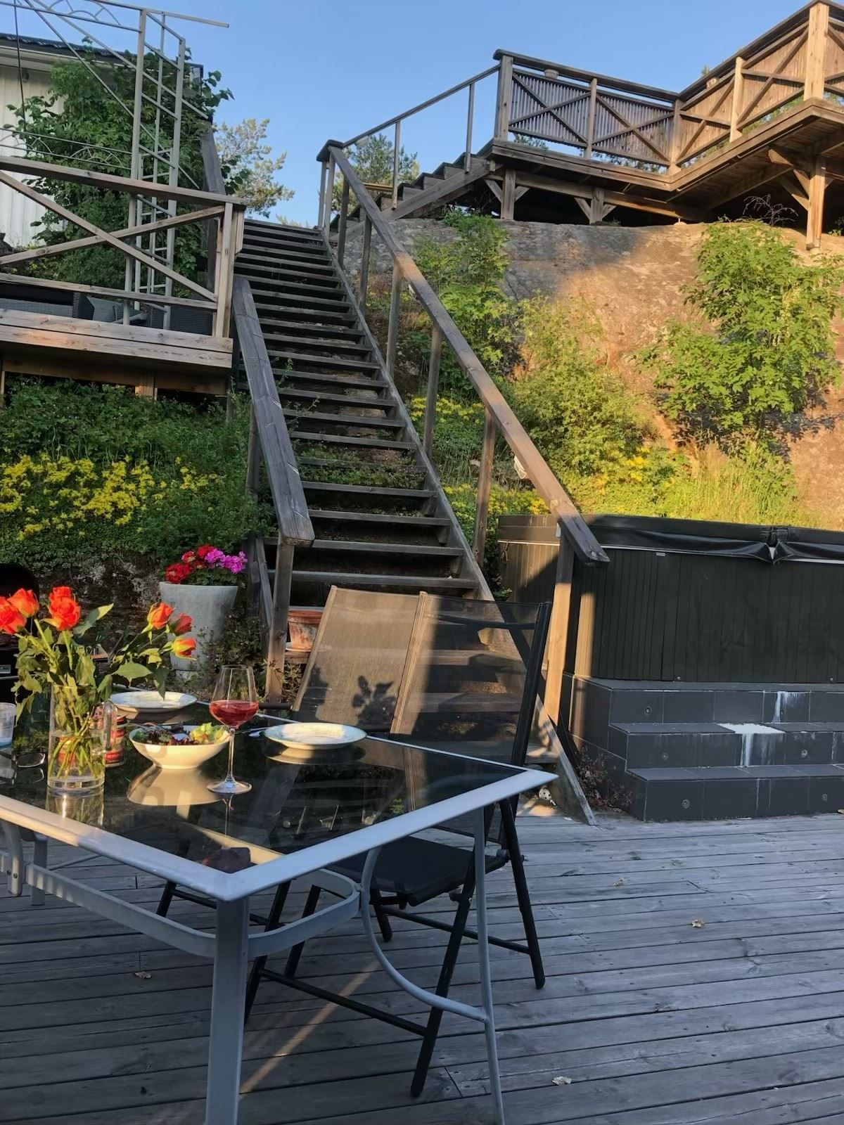 Tomten om generösa 1 749 kvm är delvis sluttande och smakfullt terrasserad med flera uteplatser i olika nivåer. Här finns gott om plats för både lek, odling och sociala tillställningar. På tomten finns även ett komplett Attefallshus om 25 kvm med pentry och badrum – idealiskt för uthyrning, tonårsboende, generationsboende eller egen verksamhet.