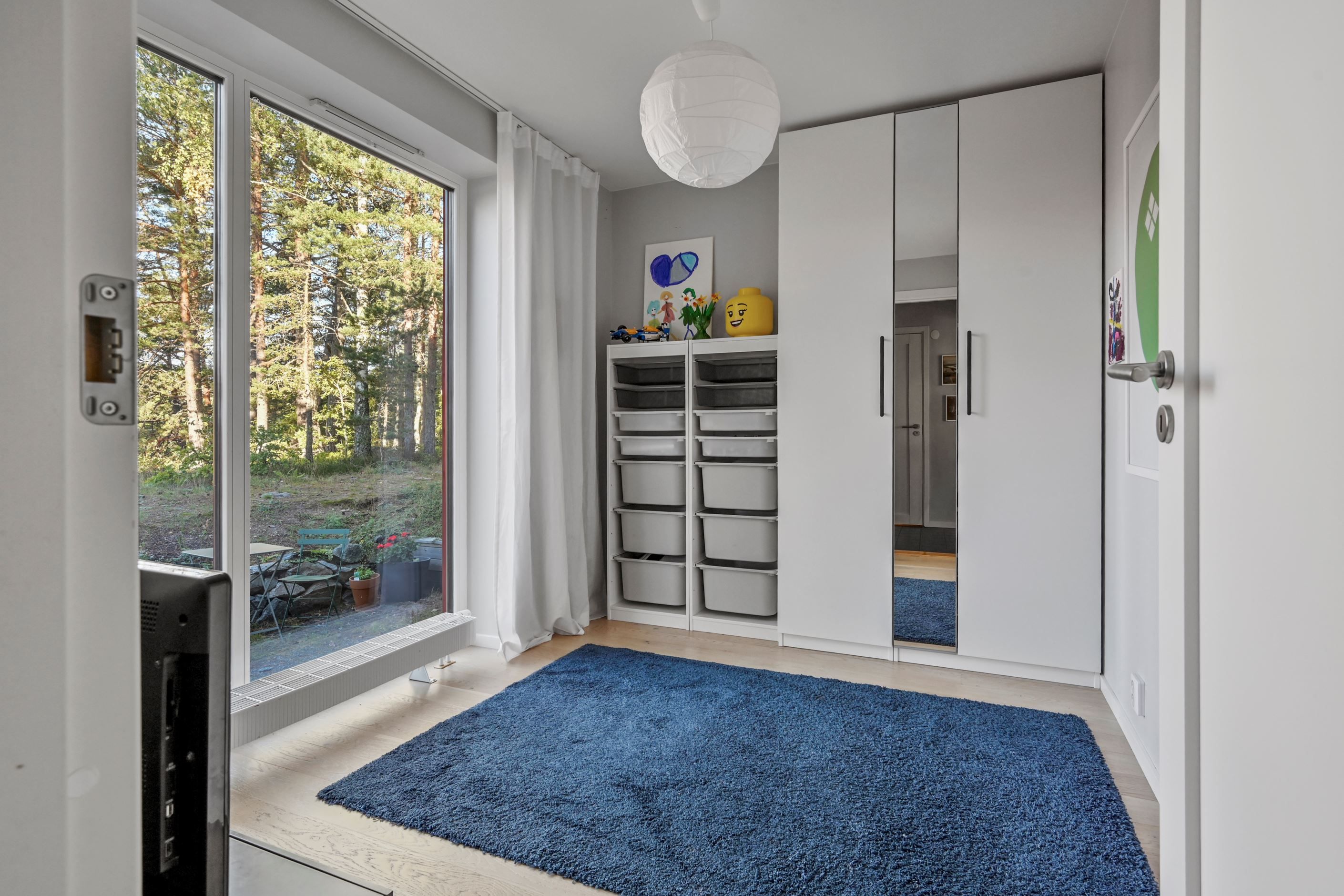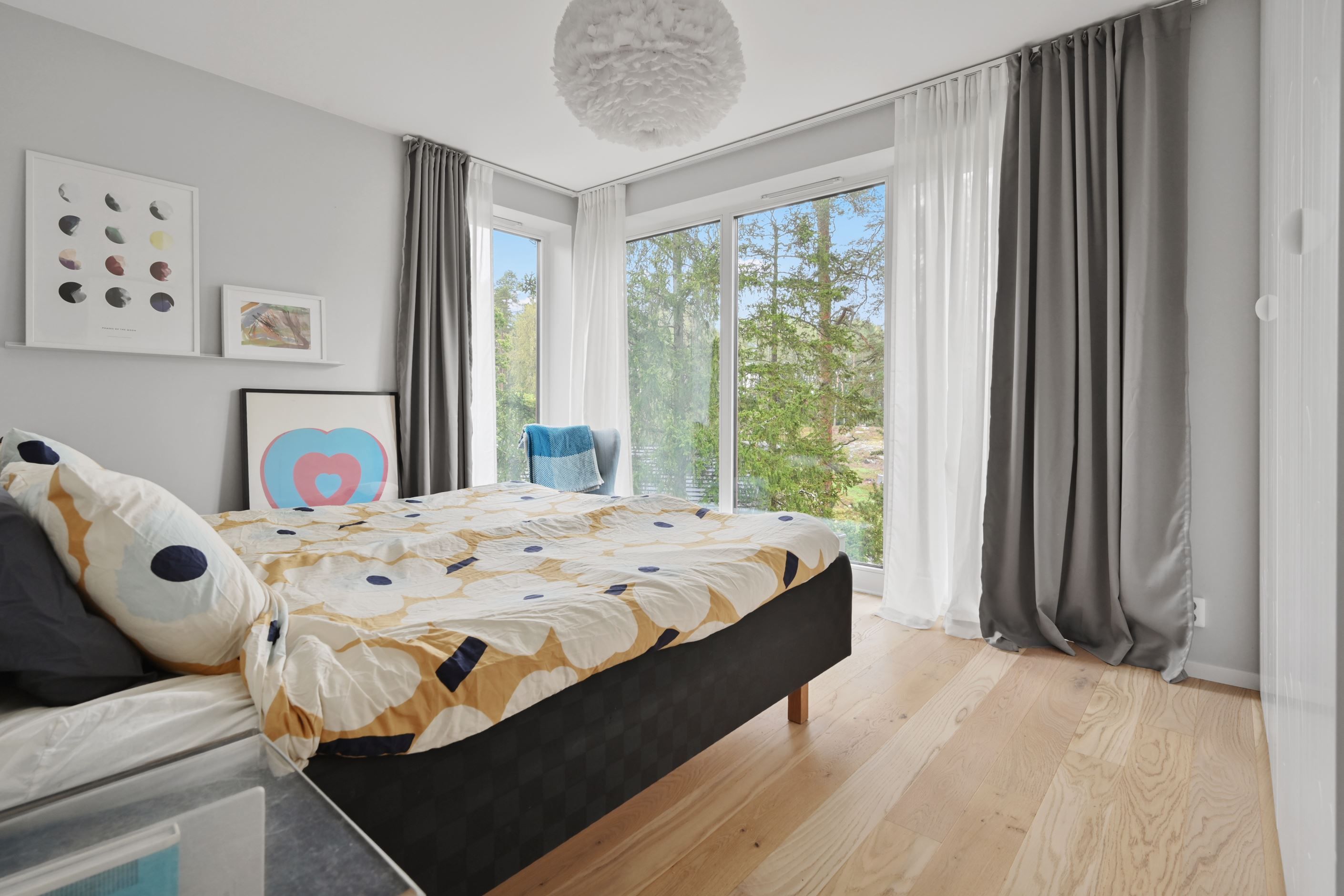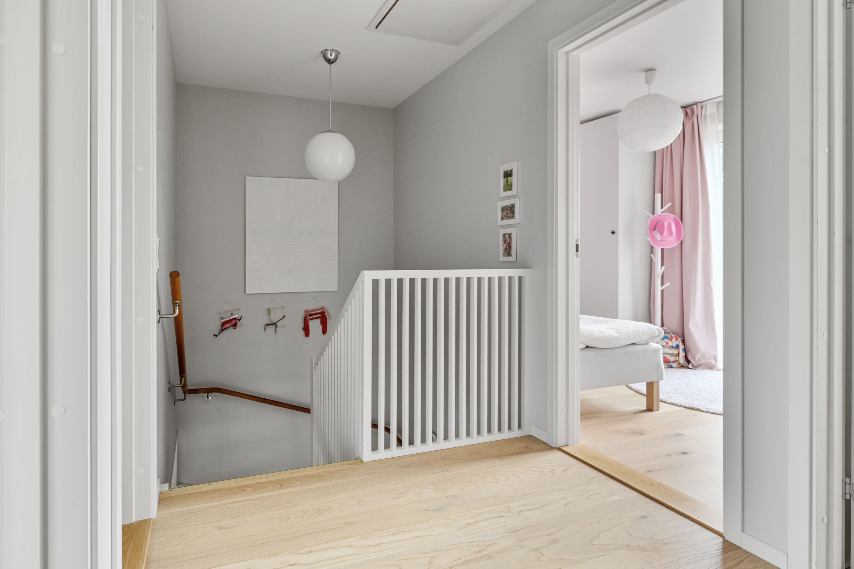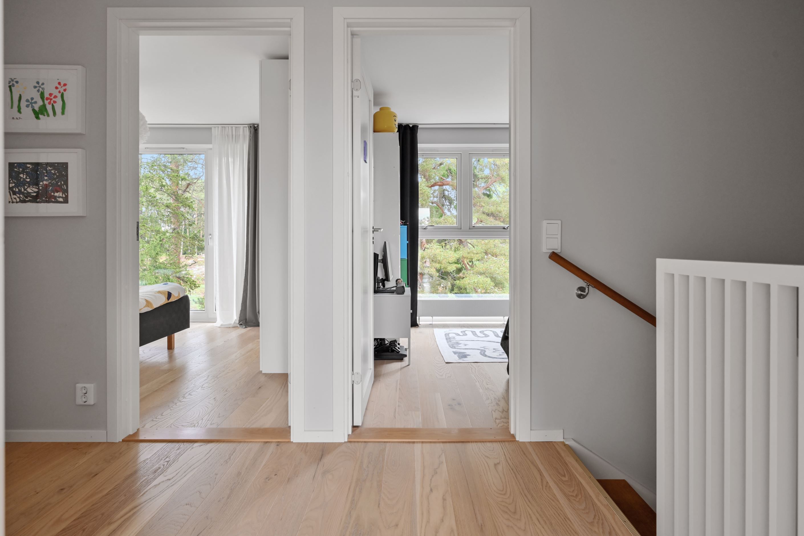 Övre plan erbjuder fyra välplanerade sovrum där hela familjen får plats. Master bedroom är generöst tilltaget med plats för dubbelsäng och möblering, medan övriga rum ger utrymme för säng, skrivbord och förvaring. Samtliga sovrum har mycket fint ljusinsläpp, tack vare de stora fönsterpartierna. Det övre badrummet är stilrent och bekvämt utrustat med badkar, wc, kommod, spegel med belysning, golvvärme, handdukstork och ett fönster som ger både ljus och utsikt – till och med från badkaret.