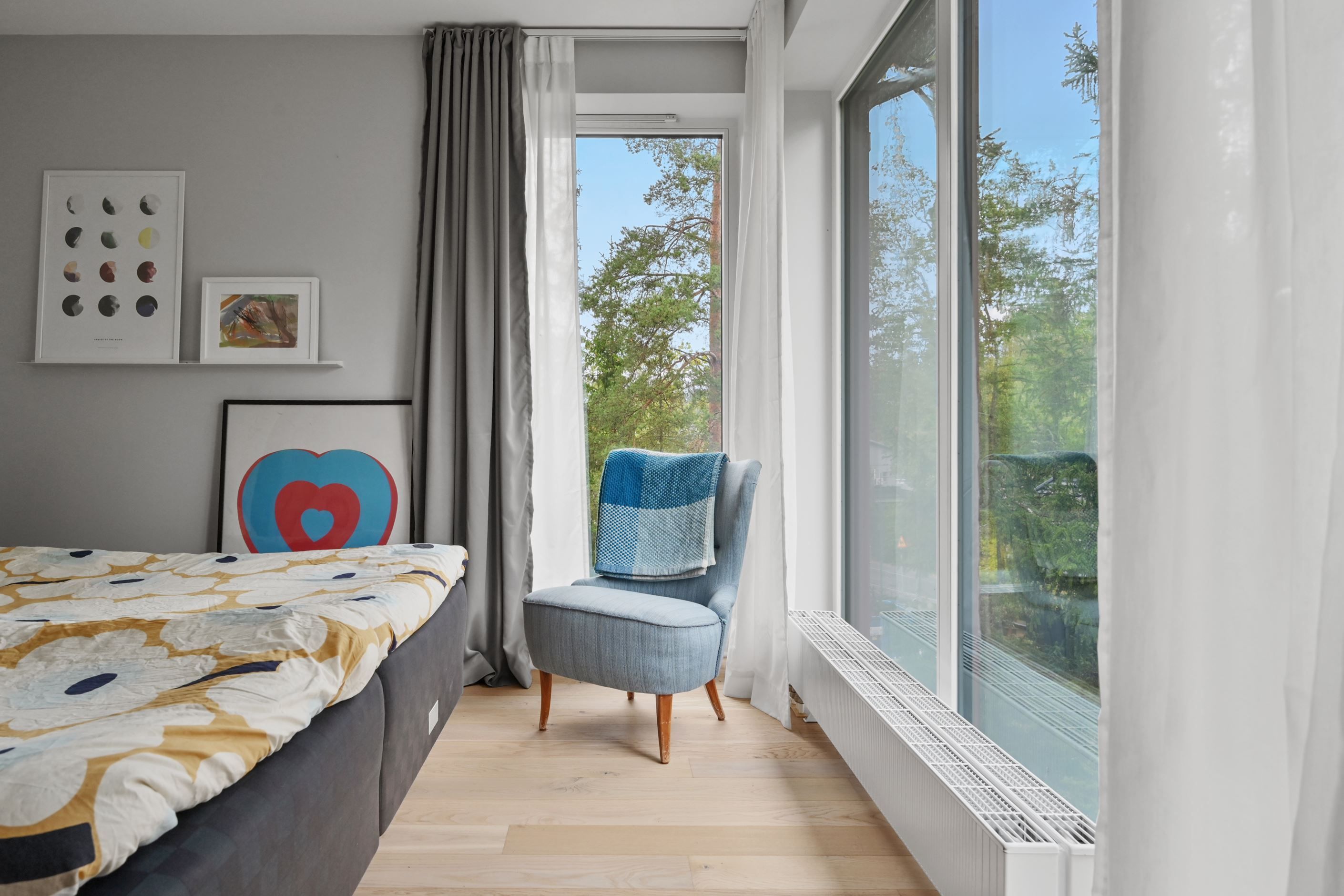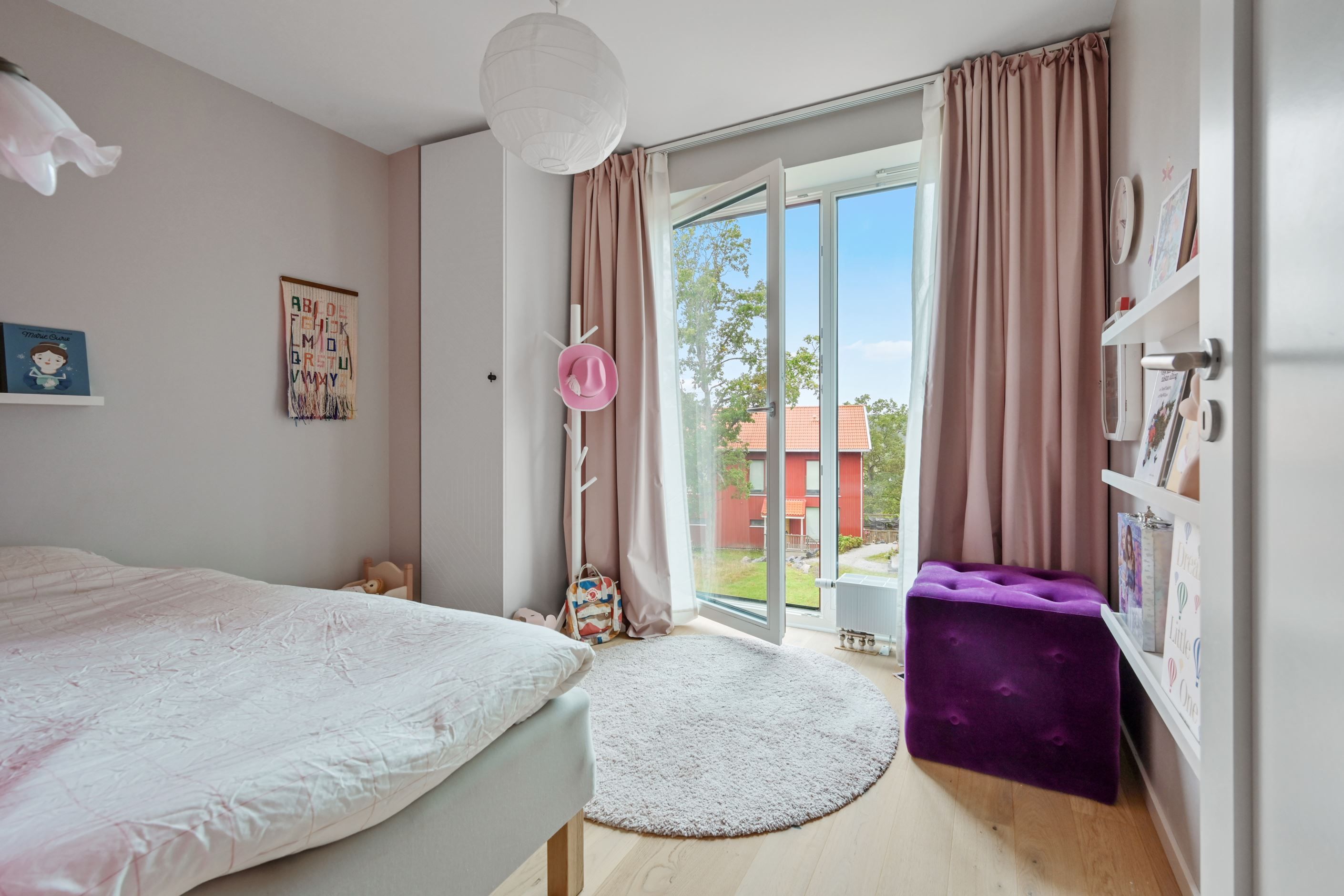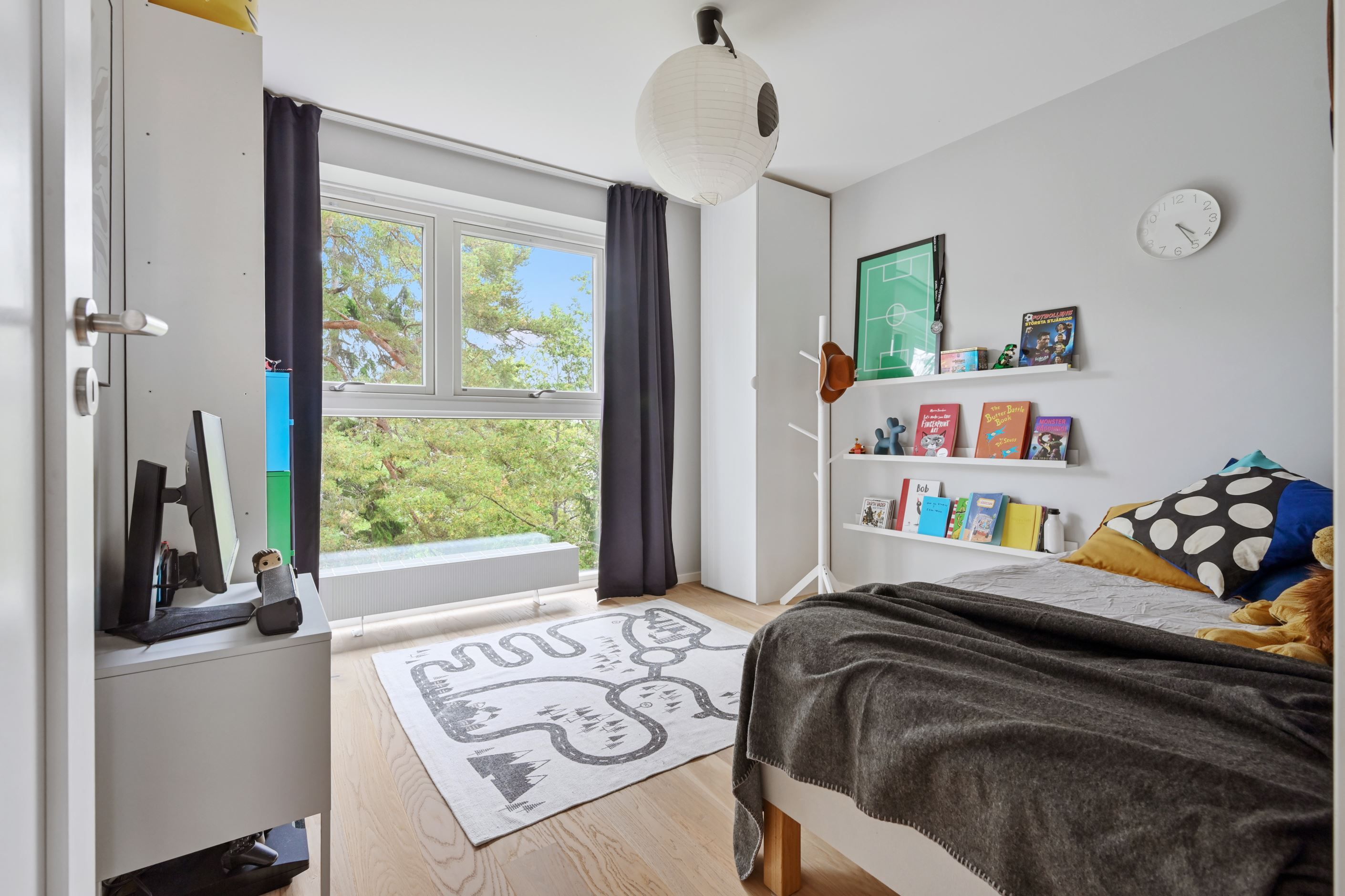 Övre plan erbjuder fyra välplanerade sovrum där hela familjen får plats. Master bedroom är generöst tilltaget med plats för dubbelsäng och möblering, medan övriga rum ger utrymme för säng, skrivbord och förvaring. Samtliga sovrum har mycket fint ljusinsläpp, tack vare de stora fönsterpartierna. Det övre badrummet är stilrent och bekvämt utrustat med badkar, wc, kommod, spegel med belysning, golvvärme, handdukstork och ett fönster som ger både ljus och utsikt – till och med från badkaret.