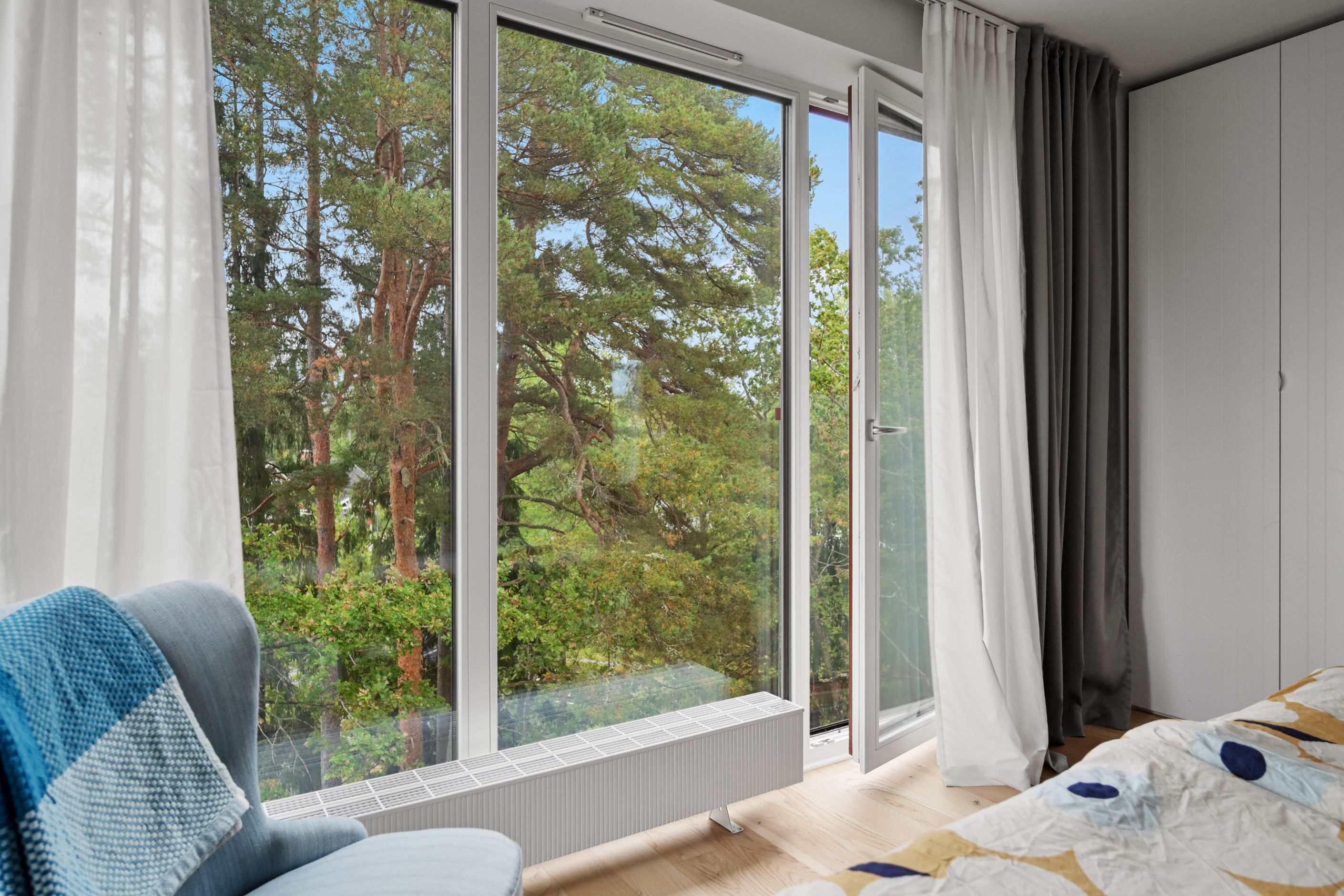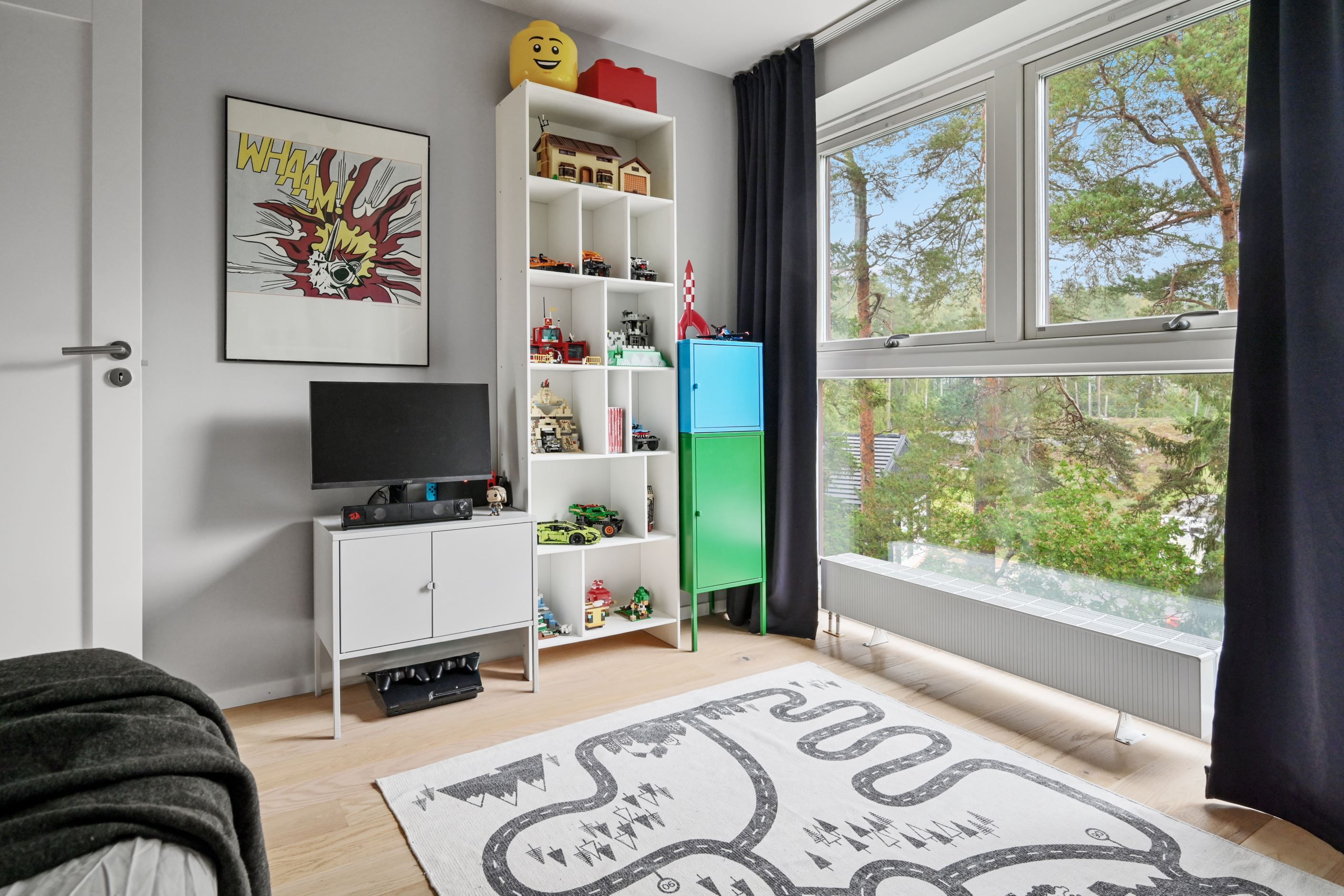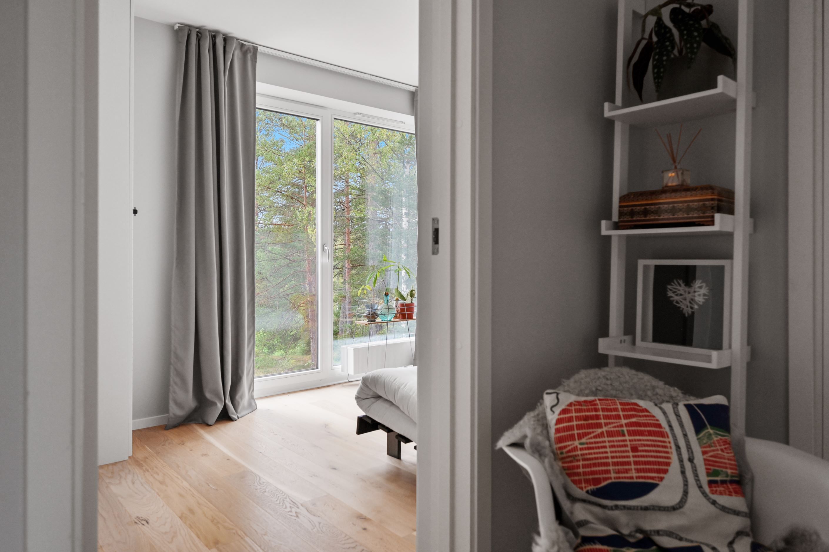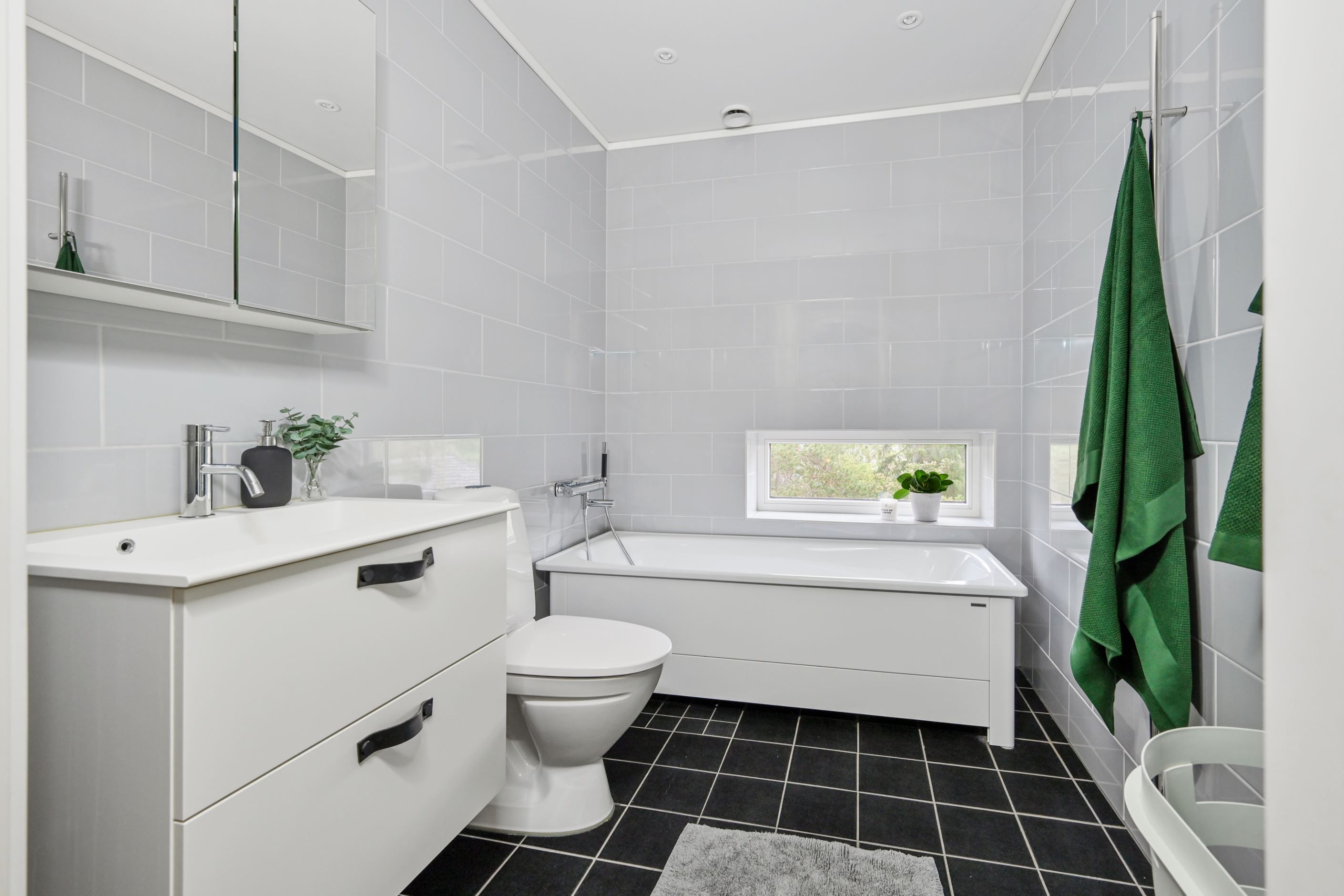 Övre plan erbjuder fyra välplanerade sovrum där hela familjen får plats. Master bedroom är generöst tilltaget med plats för dubbelsäng och möblering, medan övriga rum ger utrymme för säng, skrivbord och förvaring. Samtliga sovrum har mycket fint ljusinsläpp, tack vare de stora fönsterpartierna. Det övre badrummet är stilrent och bekvämt utrustat med badkar, wc, kommod, spegel med belysning, golvvärme, handdukstork och ett fönster som ger både ljus och utsikt – till och med från badkaret.