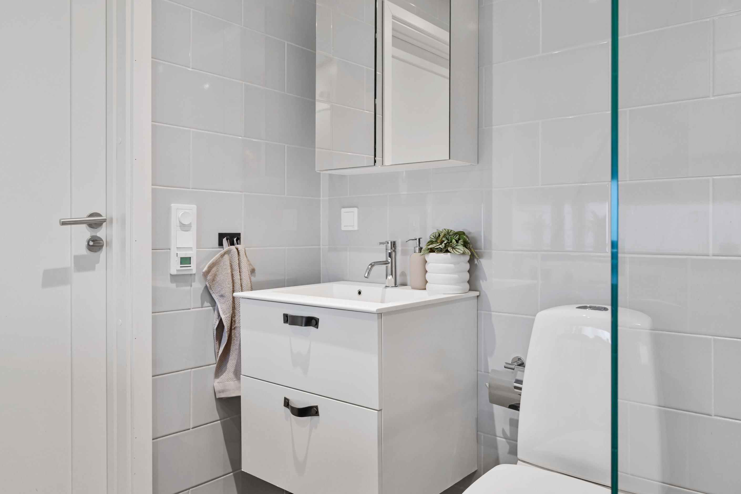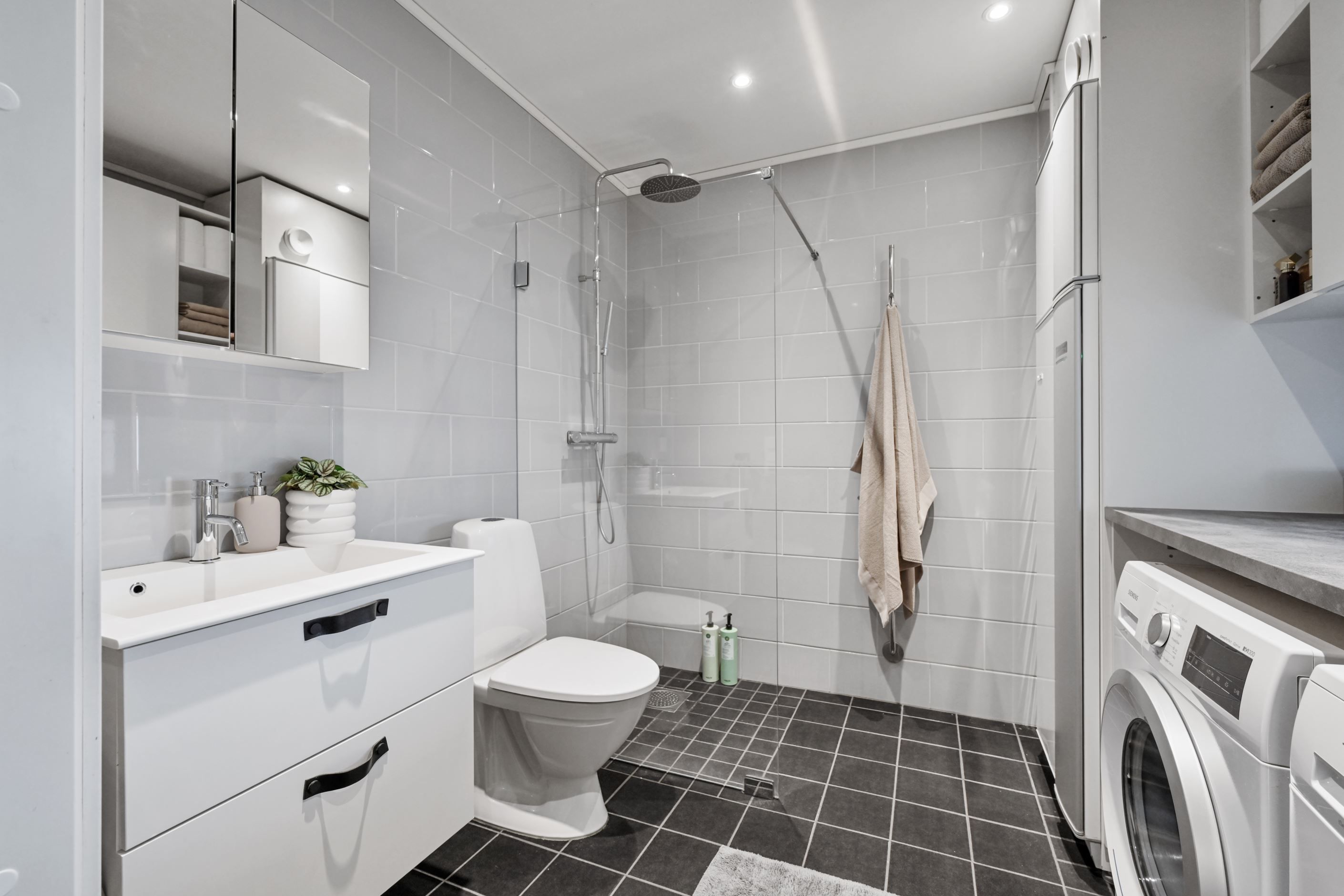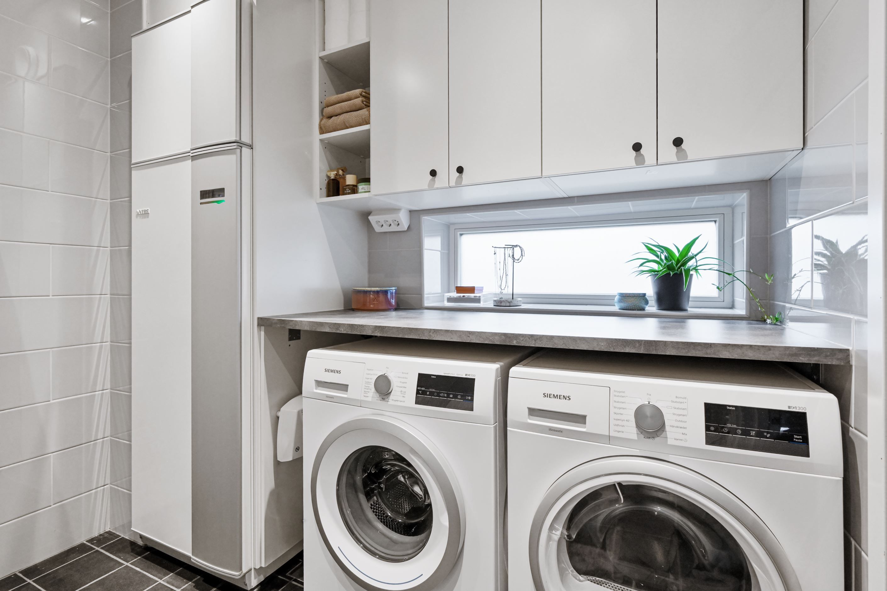 Till höger om hallen finner du ett helkaklat badrum med både duschhörna med tak- och handdusch, kommod, spegelskåp och en välutrustad tvättdel med arbetsbänk, förvaring, tvättmaskin och torktumlare.