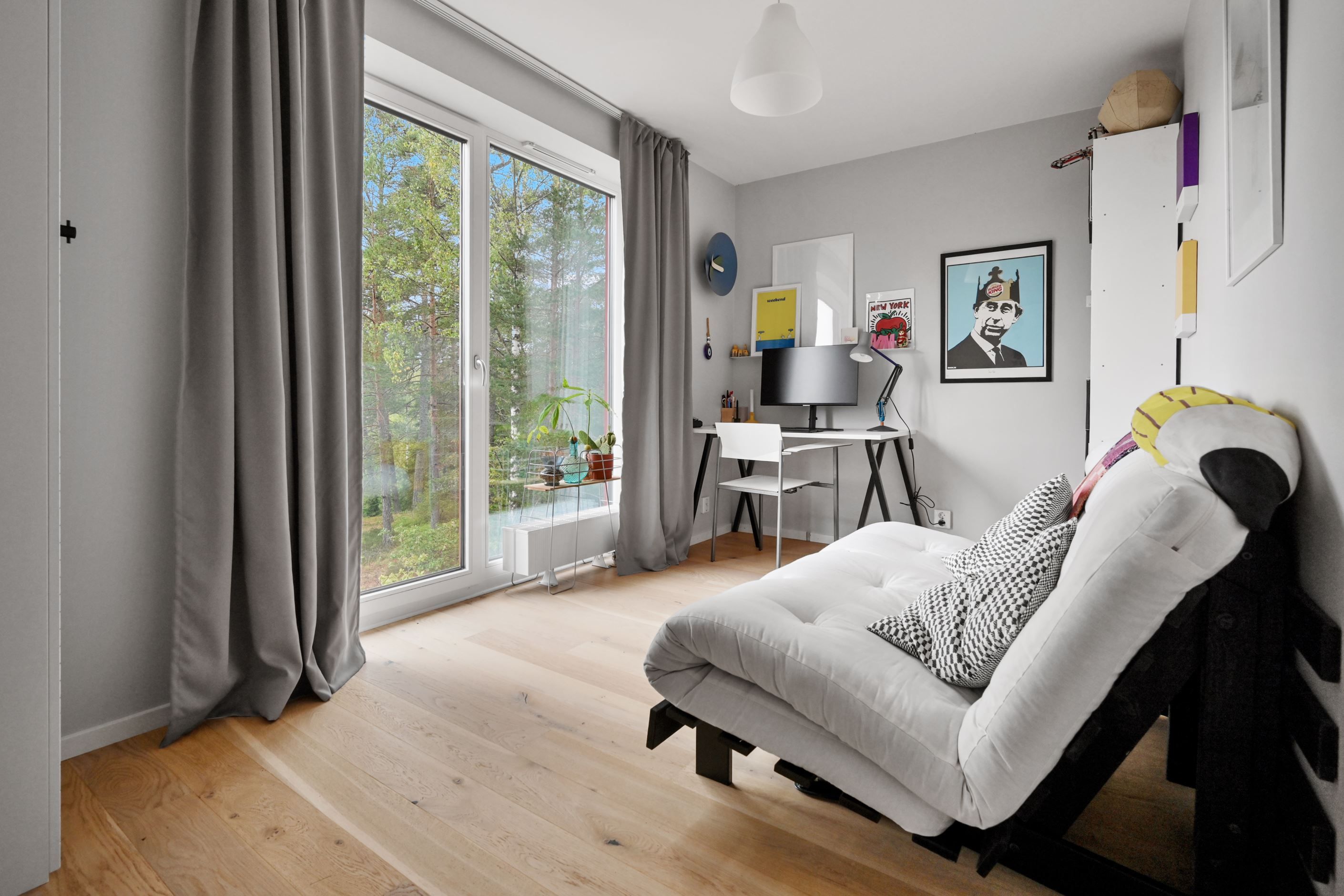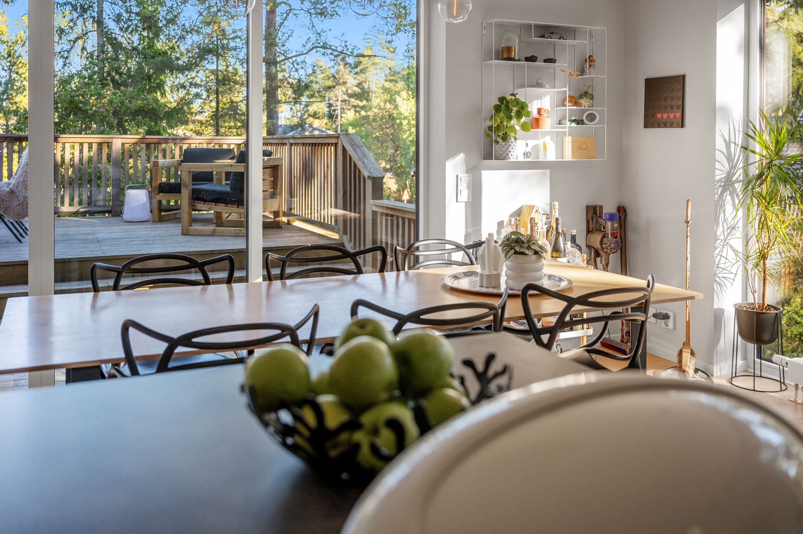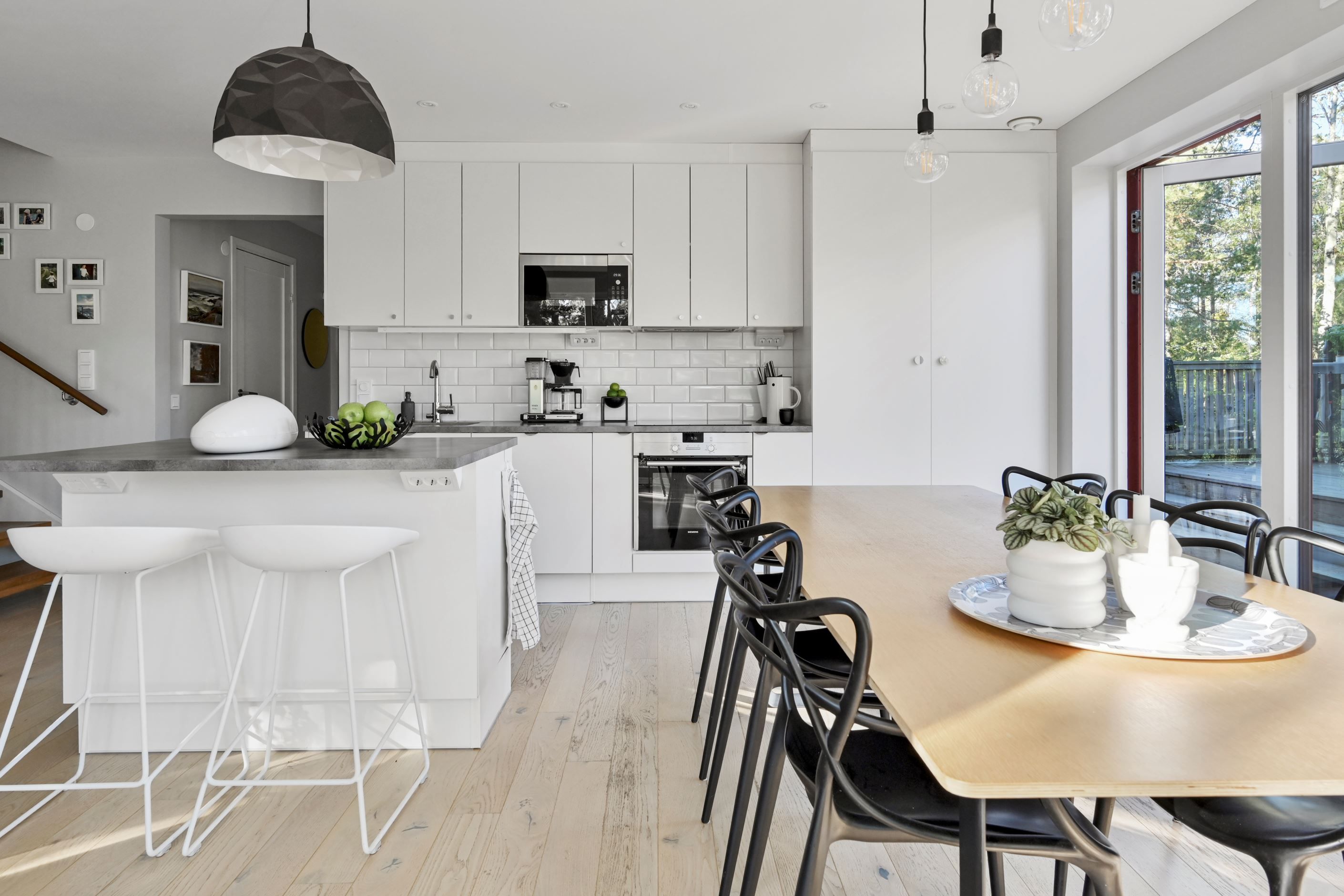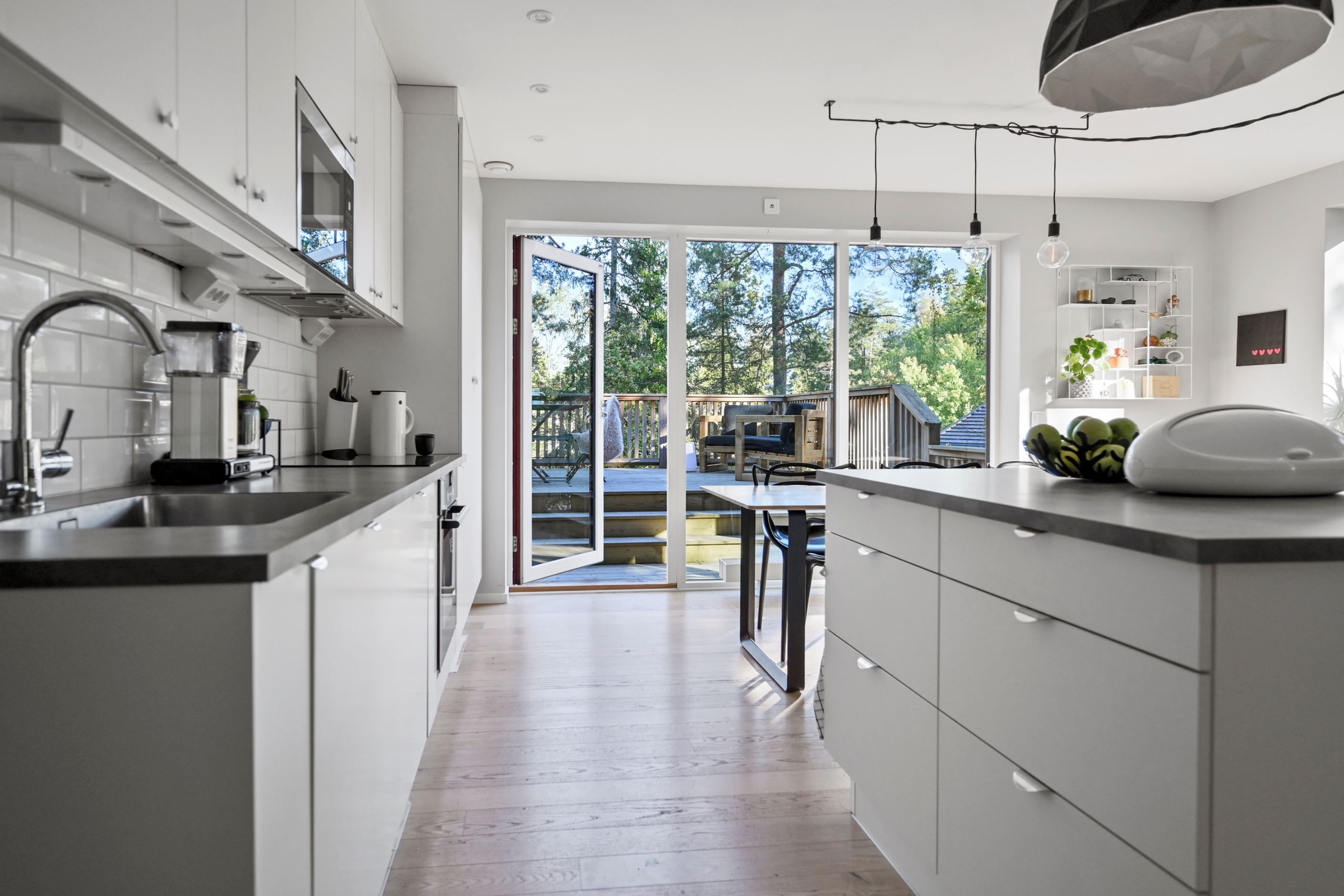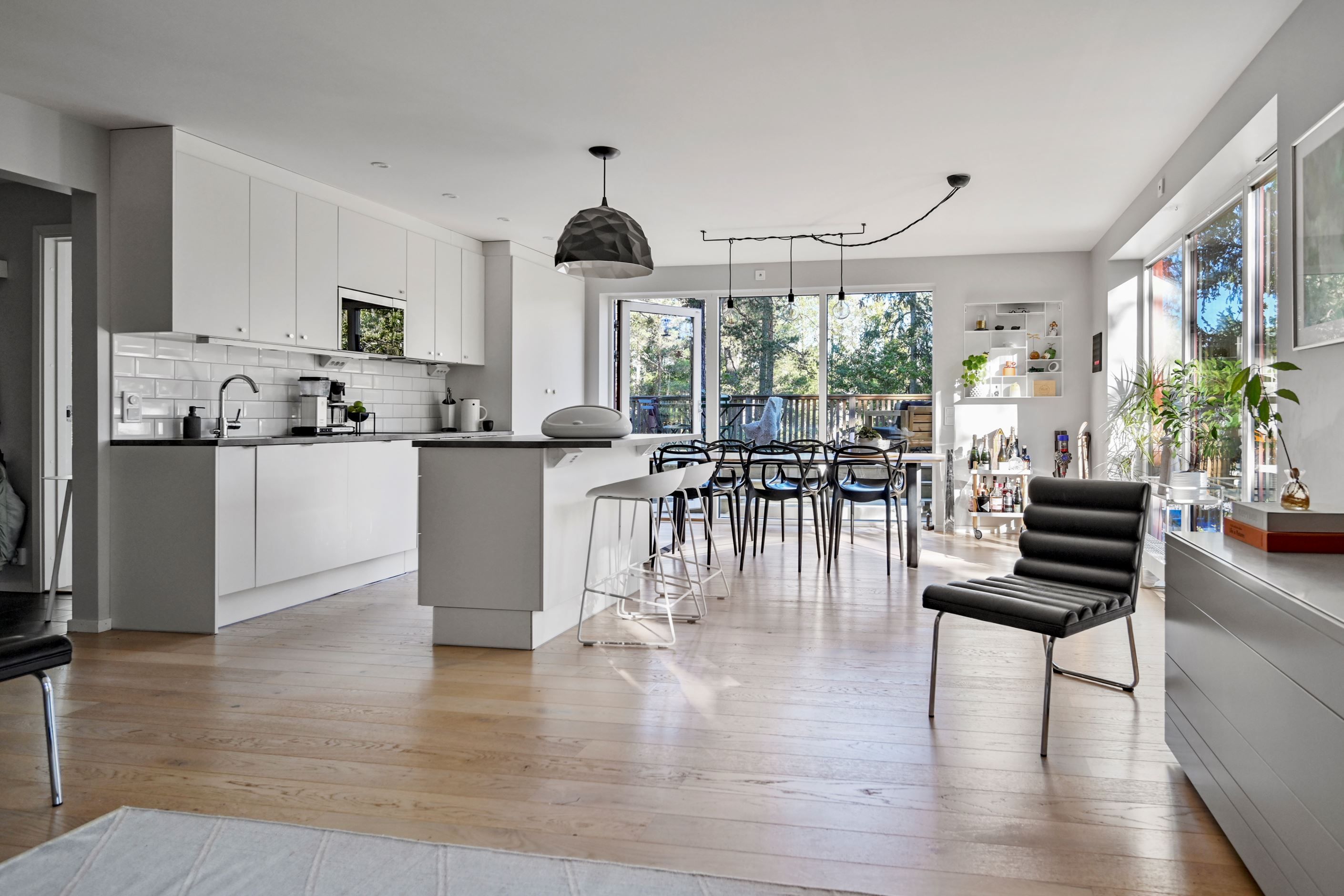 Den öppna planlösningen mellan kök och vardagsrum skapar en självklar samlingspunkt för både vardag och fest. Stora fönsterpartier ramar in utsikten över området och släpper in rikligt med dagsljus. Köket är stilrent med vita luckor, fullstor kyl och frys, gott om arbetsytor och en inbjudande köksö med bardel – en naturlig plats för samtal och umgänge. Från köket kliver du rakt ut på den stora altanen i högt läge, där du kan njuta av grillkvällar, morgonkaffe och gott om sol.