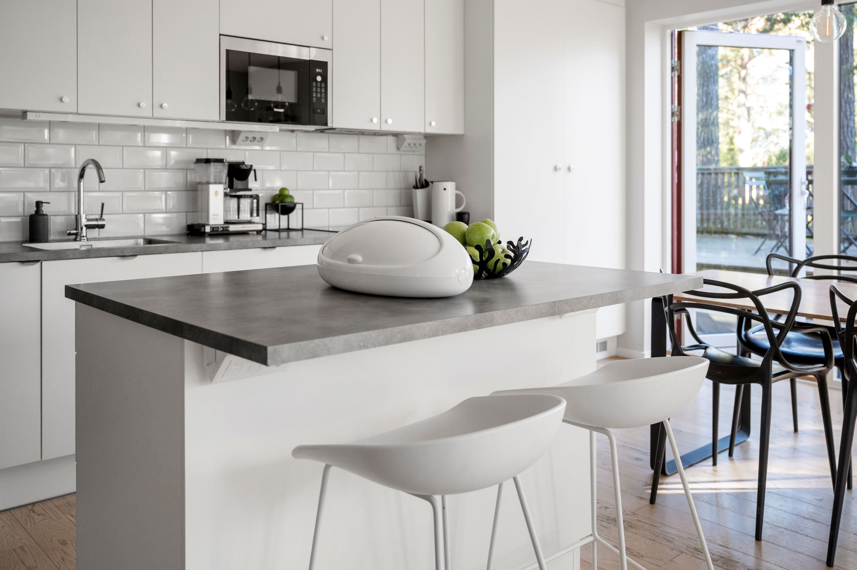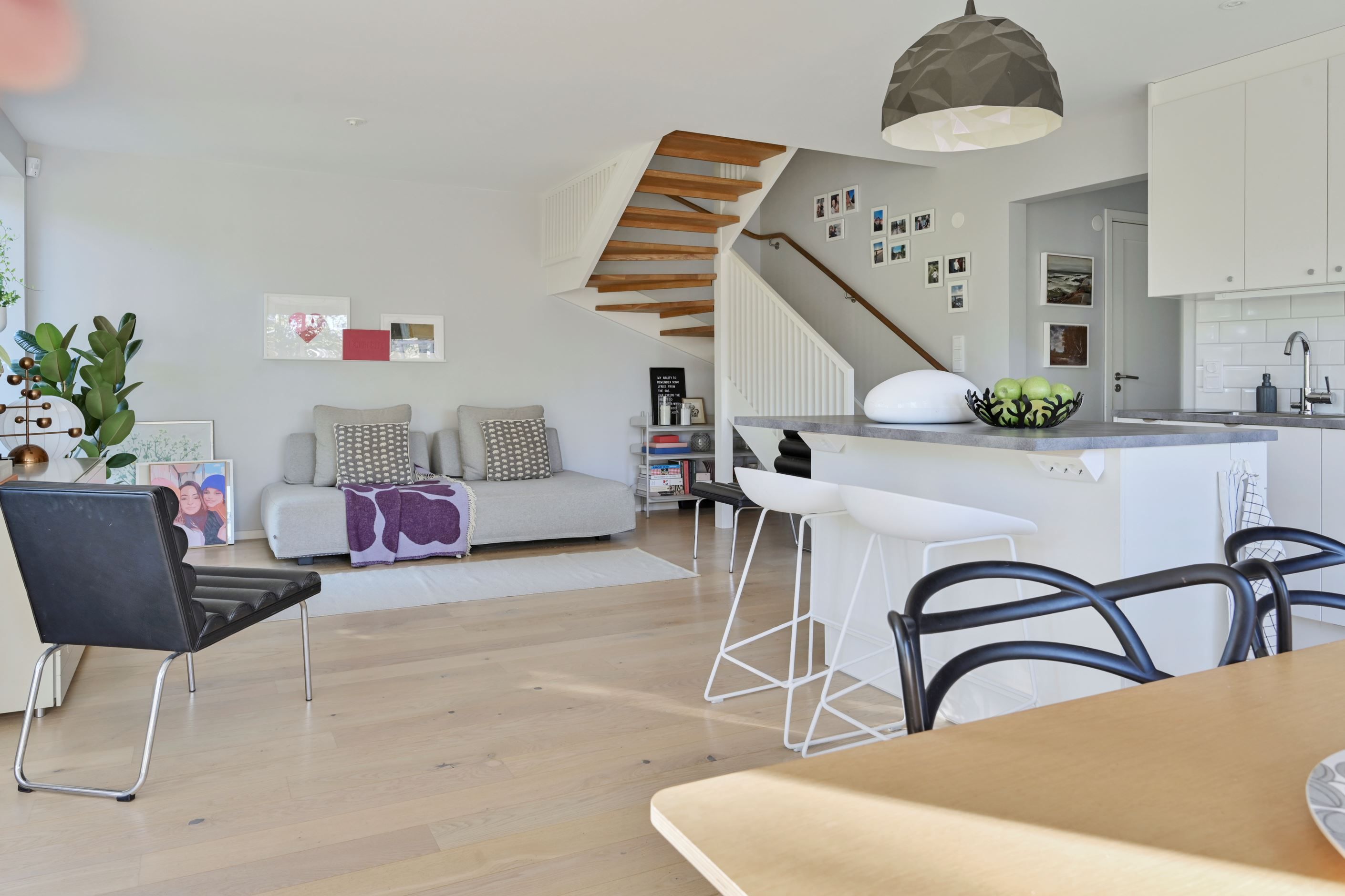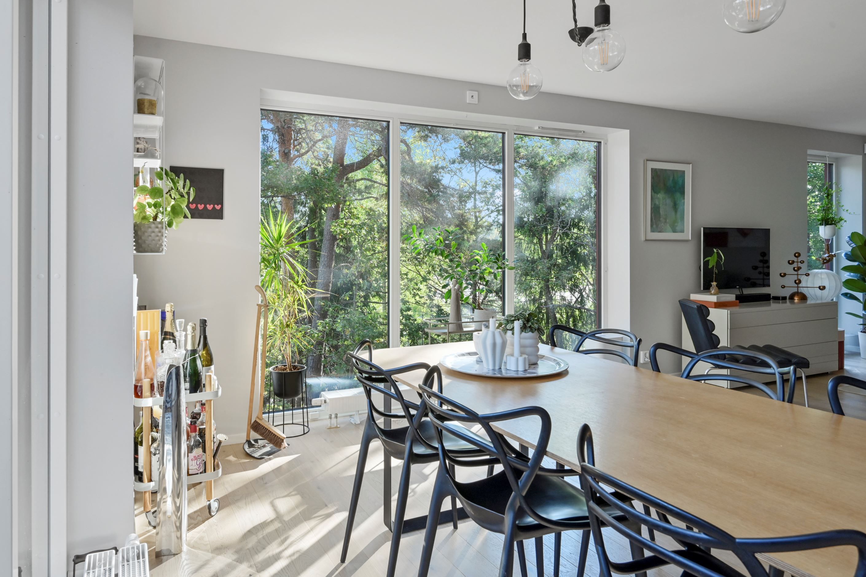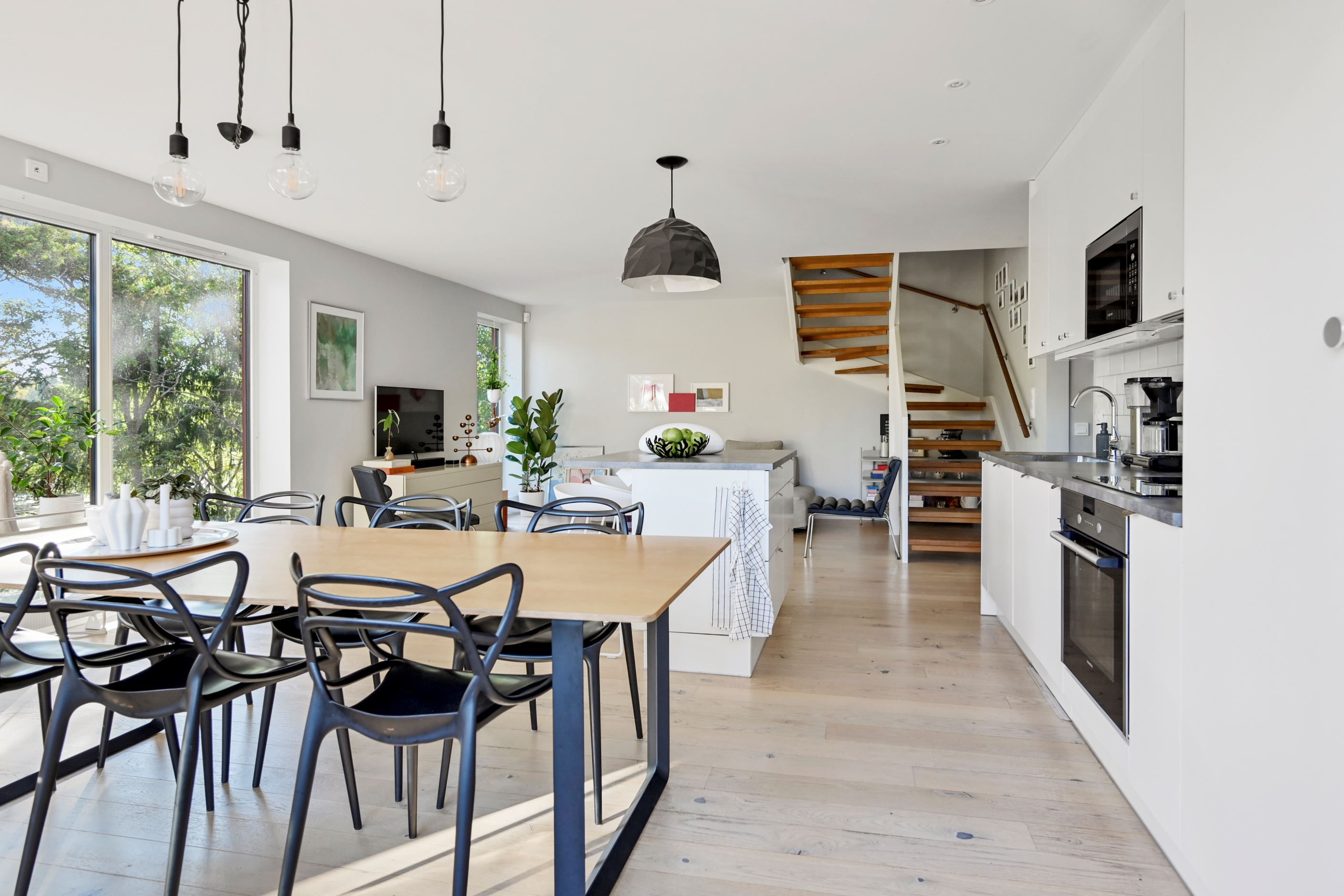 Den öppna planlösningen mellan kök och vardagsrum skapar en självklar samlingspunkt för både vardag och fest. Stora fönsterpartier ramar in utsikten över området och släpper in rikligt med dagsljus. Köket är stilrent med vita luckor, fullstor kyl och frys, gott om arbetsytor och en inbjudande köksö med bardel – en naturlig plats för samtal och umgänge. Från köket kliver du rakt ut på den stora altanen i högt läge, där du kan njuta av grillkvällar, morgonkaffe och gott om sol.