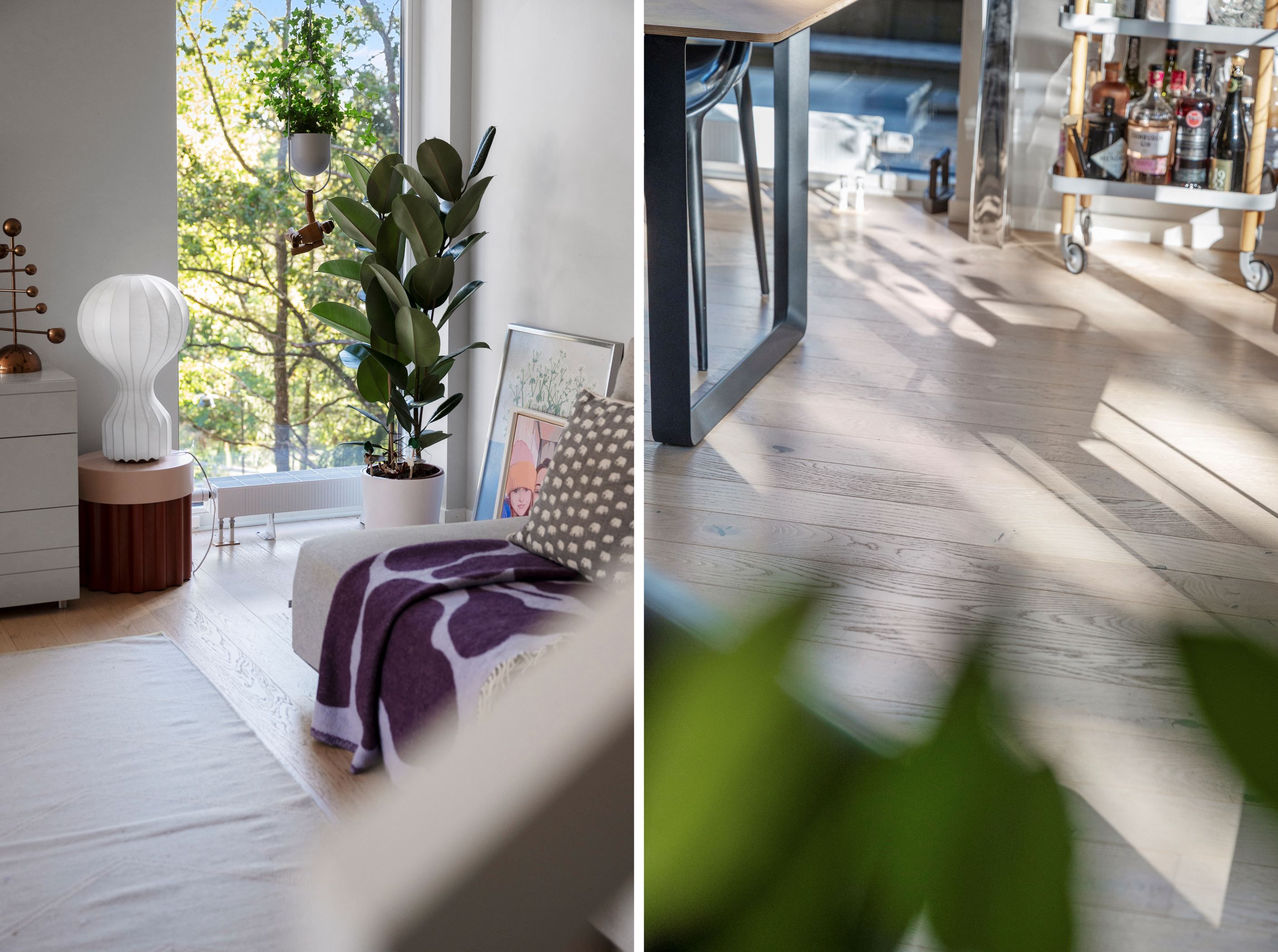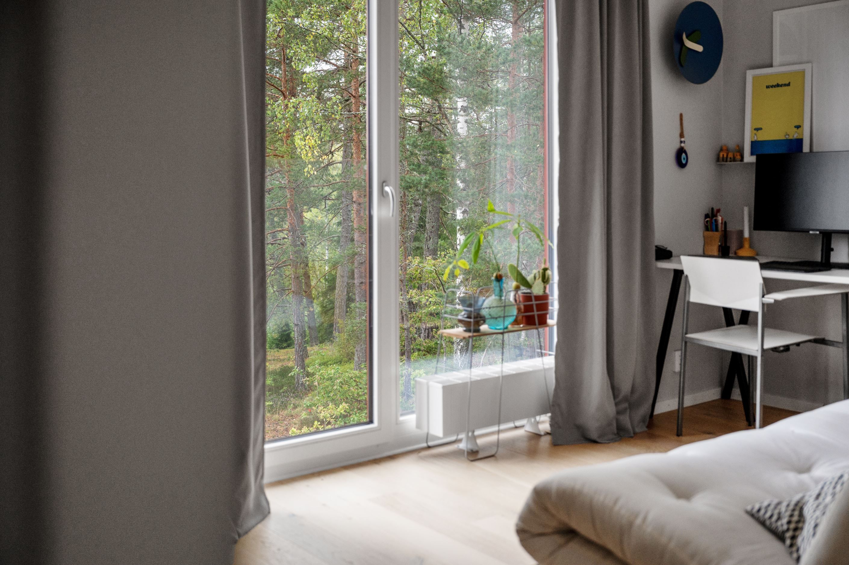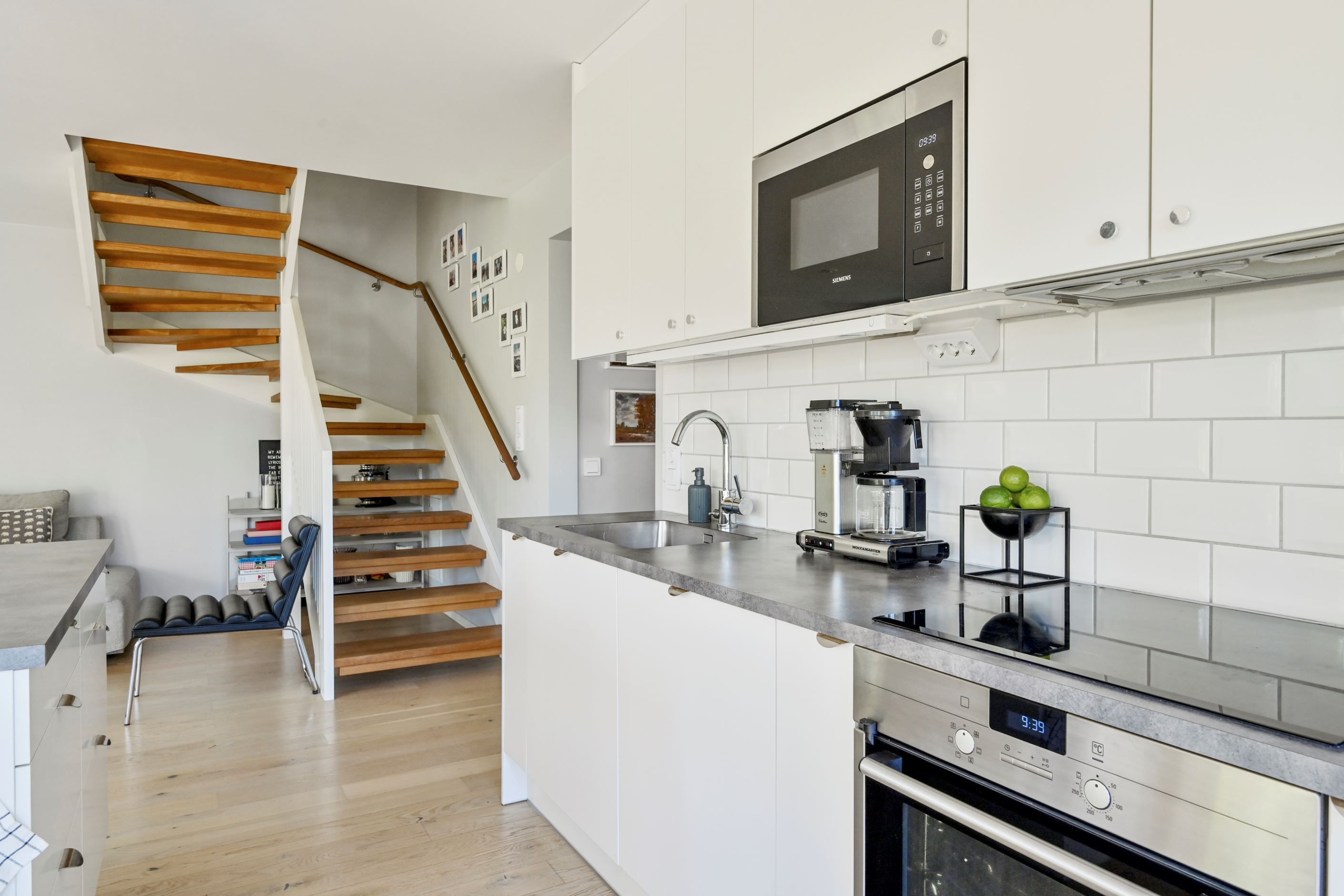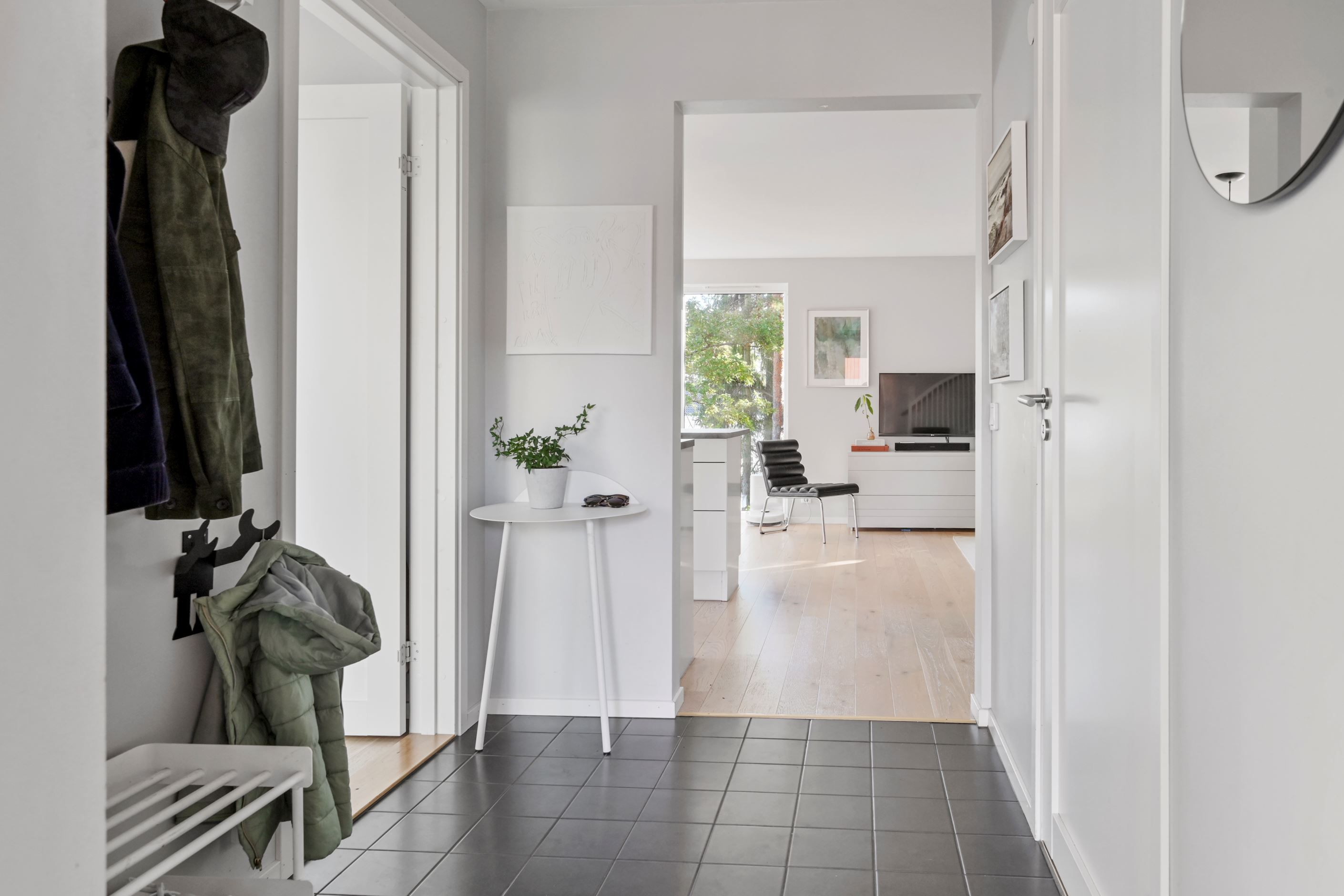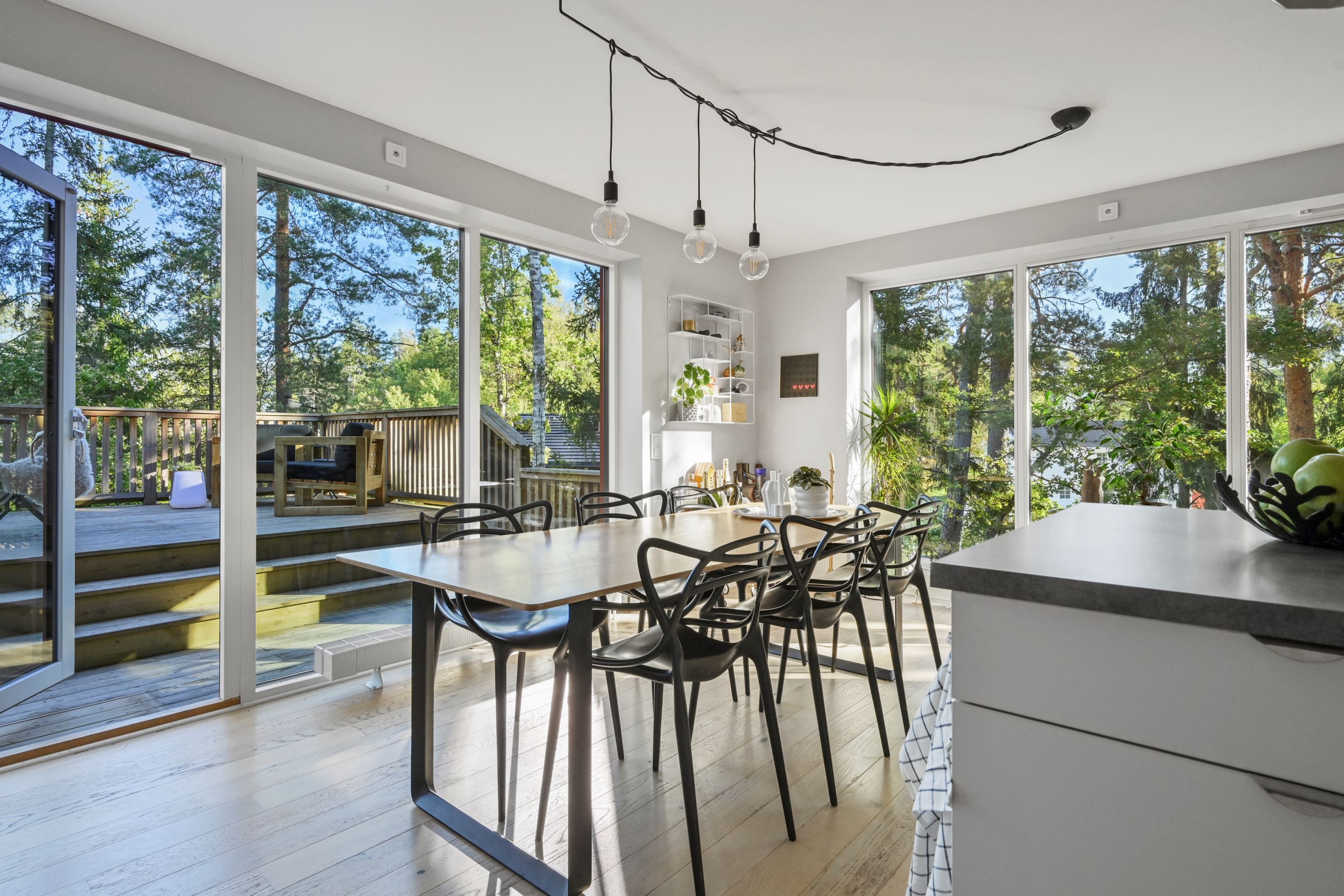 Den öppna planlösningen mellan kök och vardagsrum skapar en självklar samlingspunkt för både vardag och fest. Stora fönsterpartier ramar in utsikten över området och släpper in rikligt med dagsljus. Köket är stilrent med vita luckor, fullstor kyl och frys, gott om arbetsytor och en inbjudande köksö med bardel – en naturlig plats för samtal och umgänge. Från köket kliver du rakt ut på den stora altanen i högt läge, där du kan njuta av grillkvällar, morgonkaffe och gott om sol.