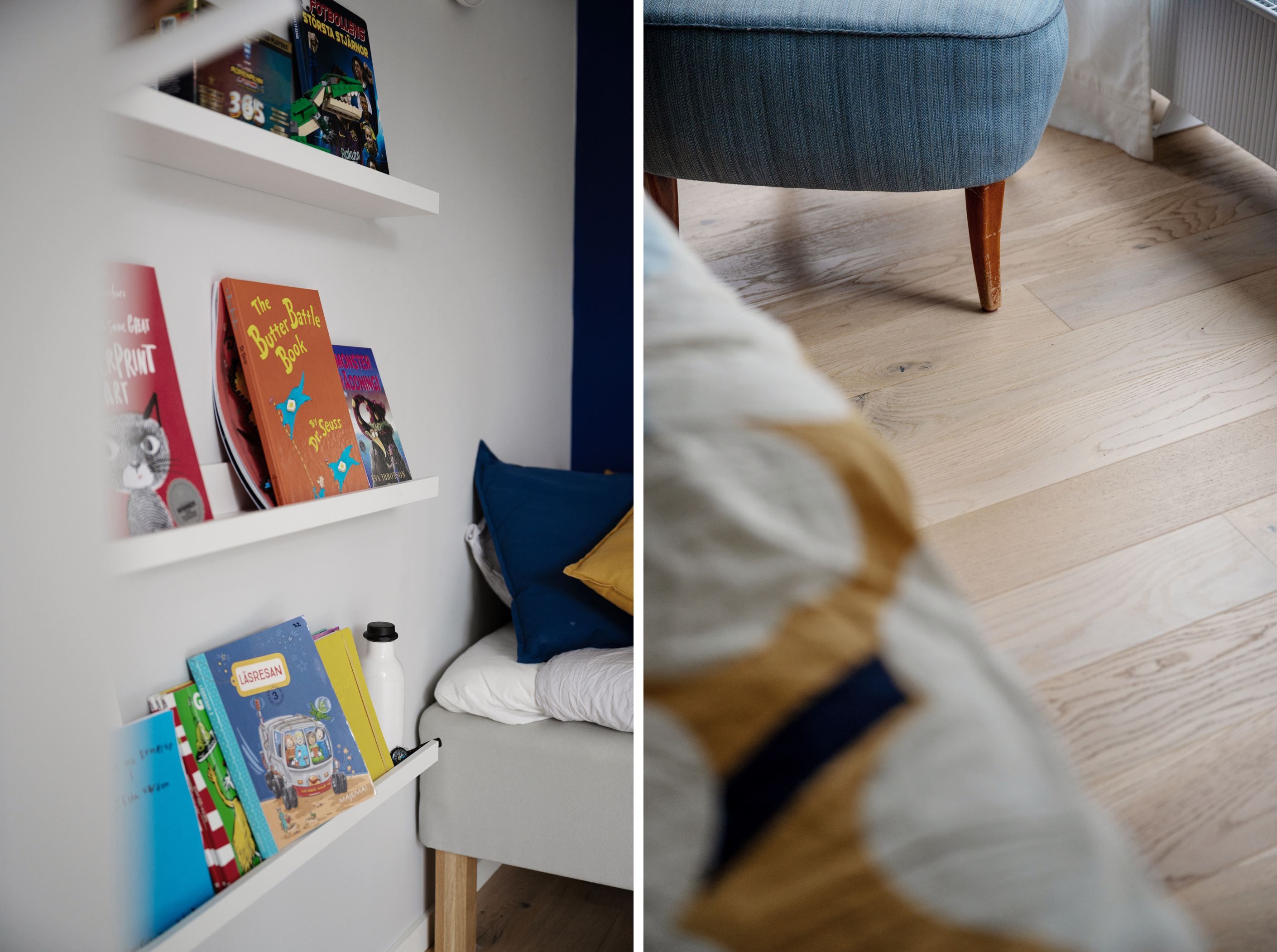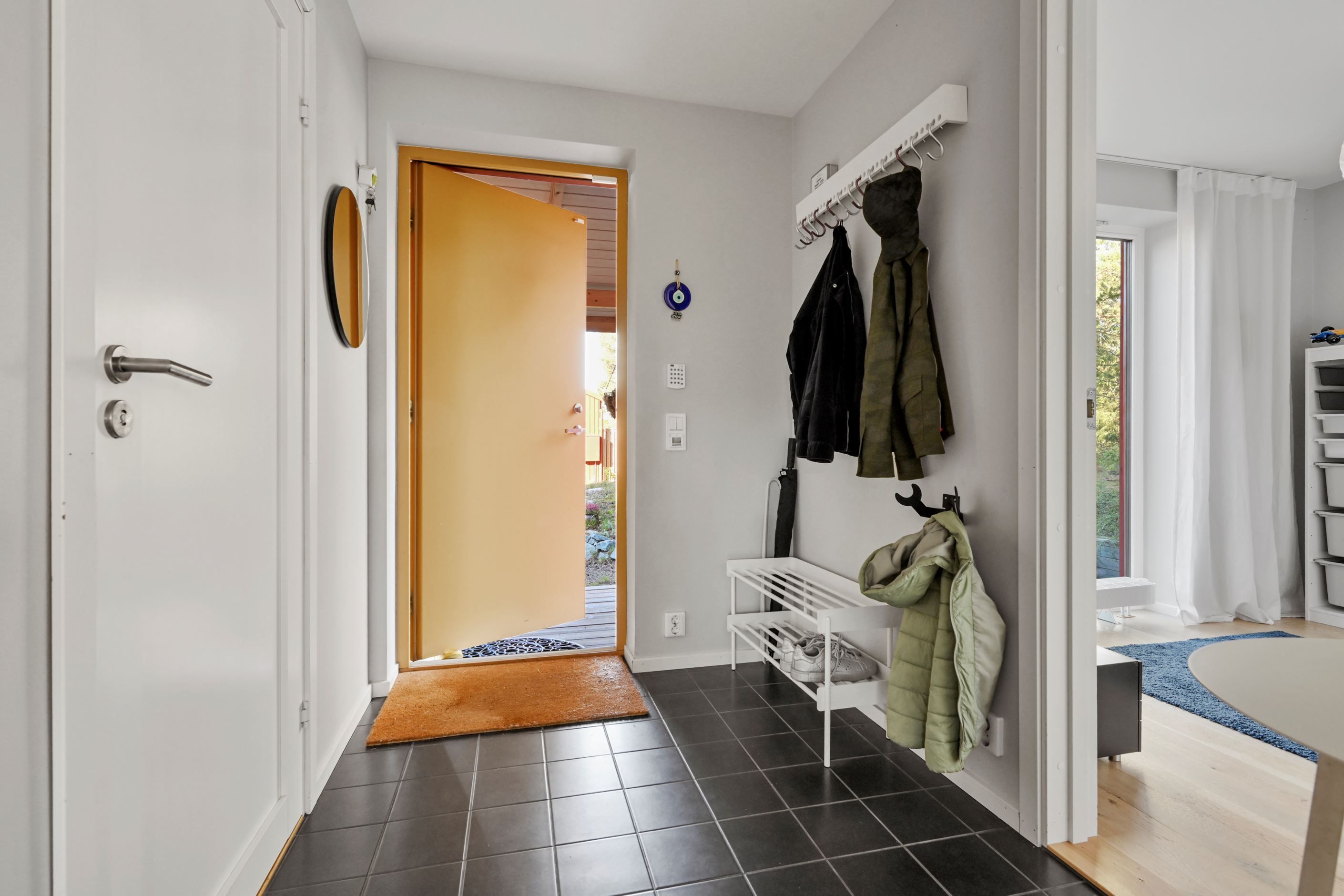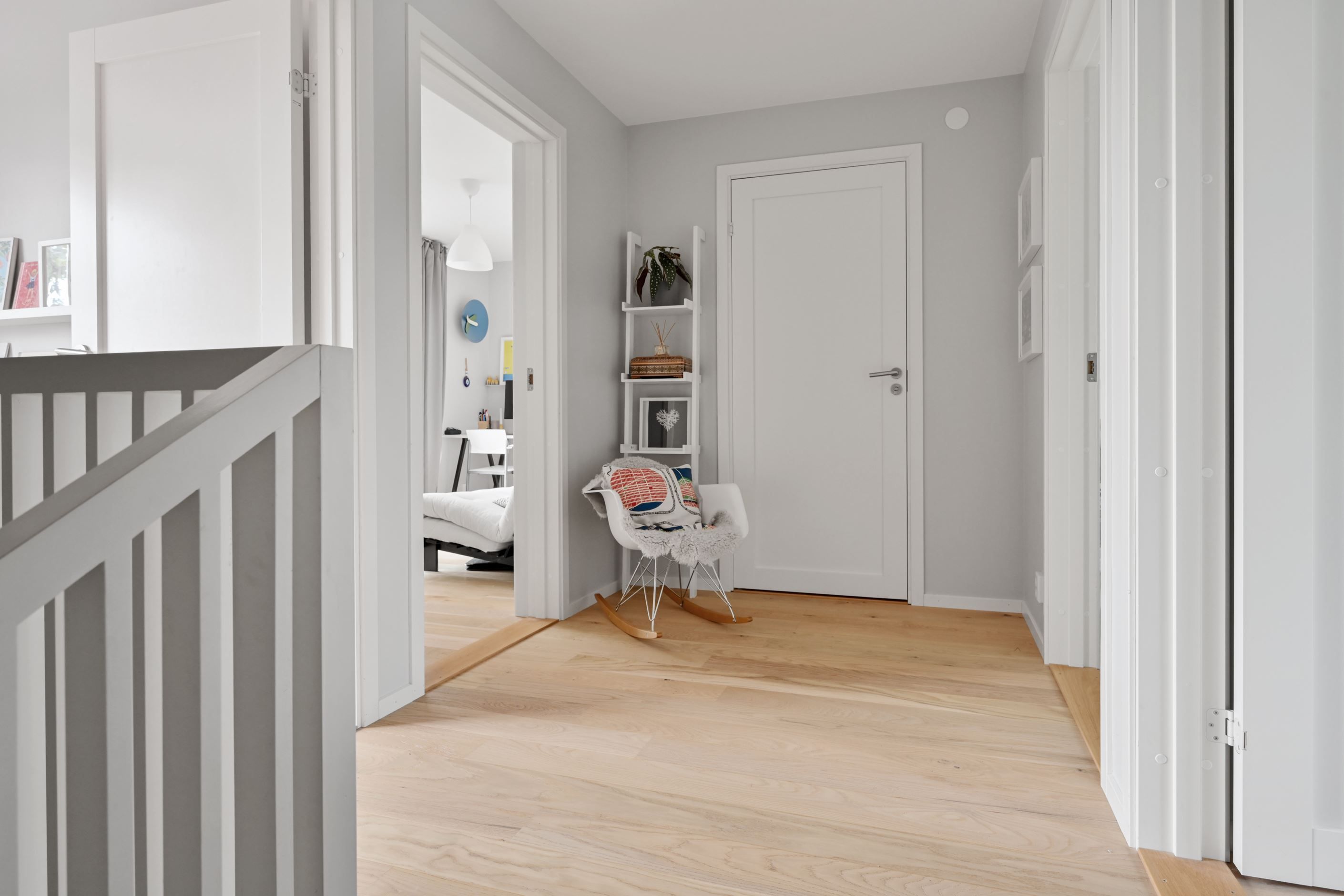Redan i hallen möts du av en praktisk hall, med funktionellt klinkergolv, samt gott om plats för ytterkläder och förvaring – inklusive ett praktiskt utrymme under trappan. Direkt till vänster ligger ett av hemmets fem sovrum – ett perfekt barnrum, gästrum eller hemmakontor, med generösa fönsterpartier som bjuder in ljuset.