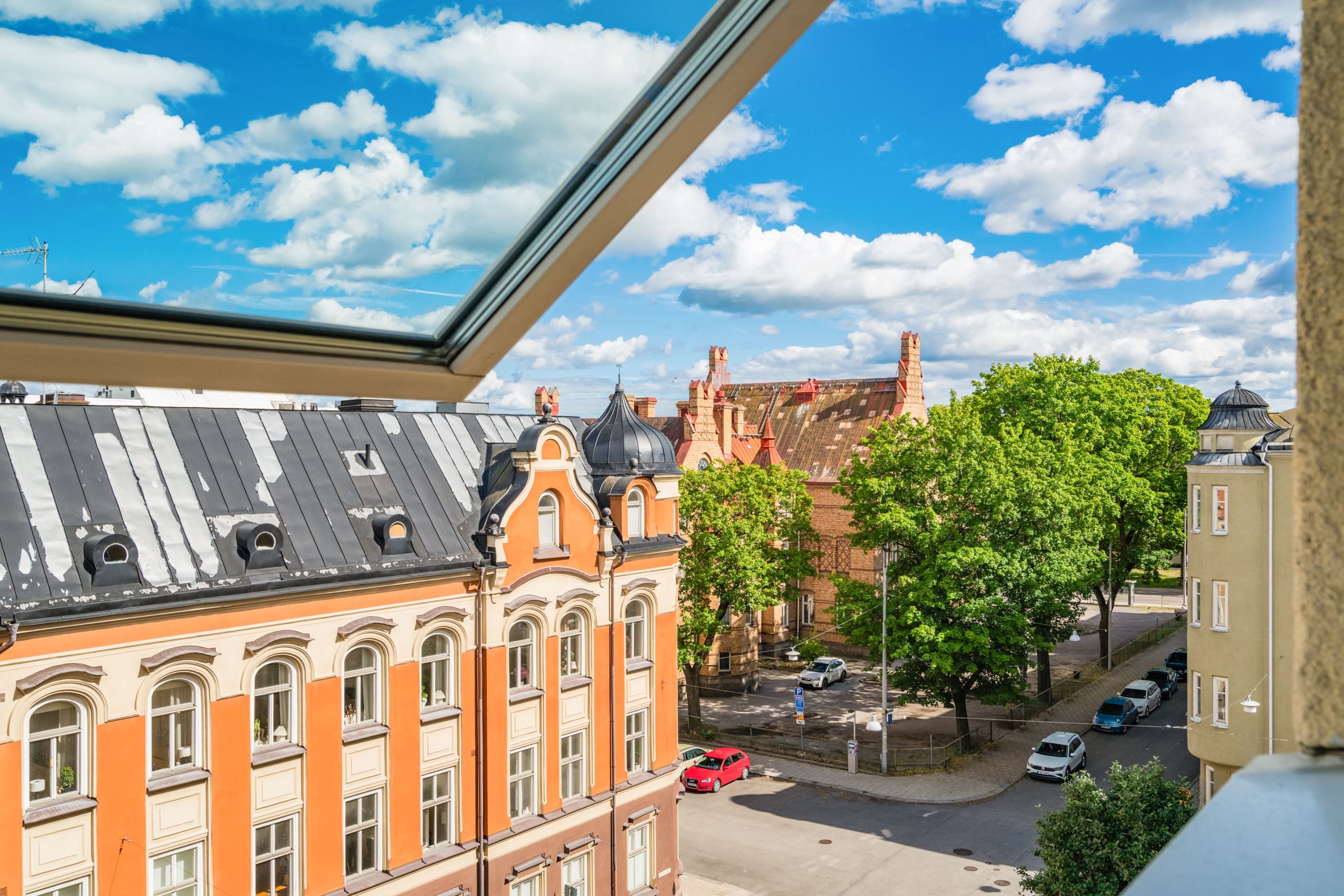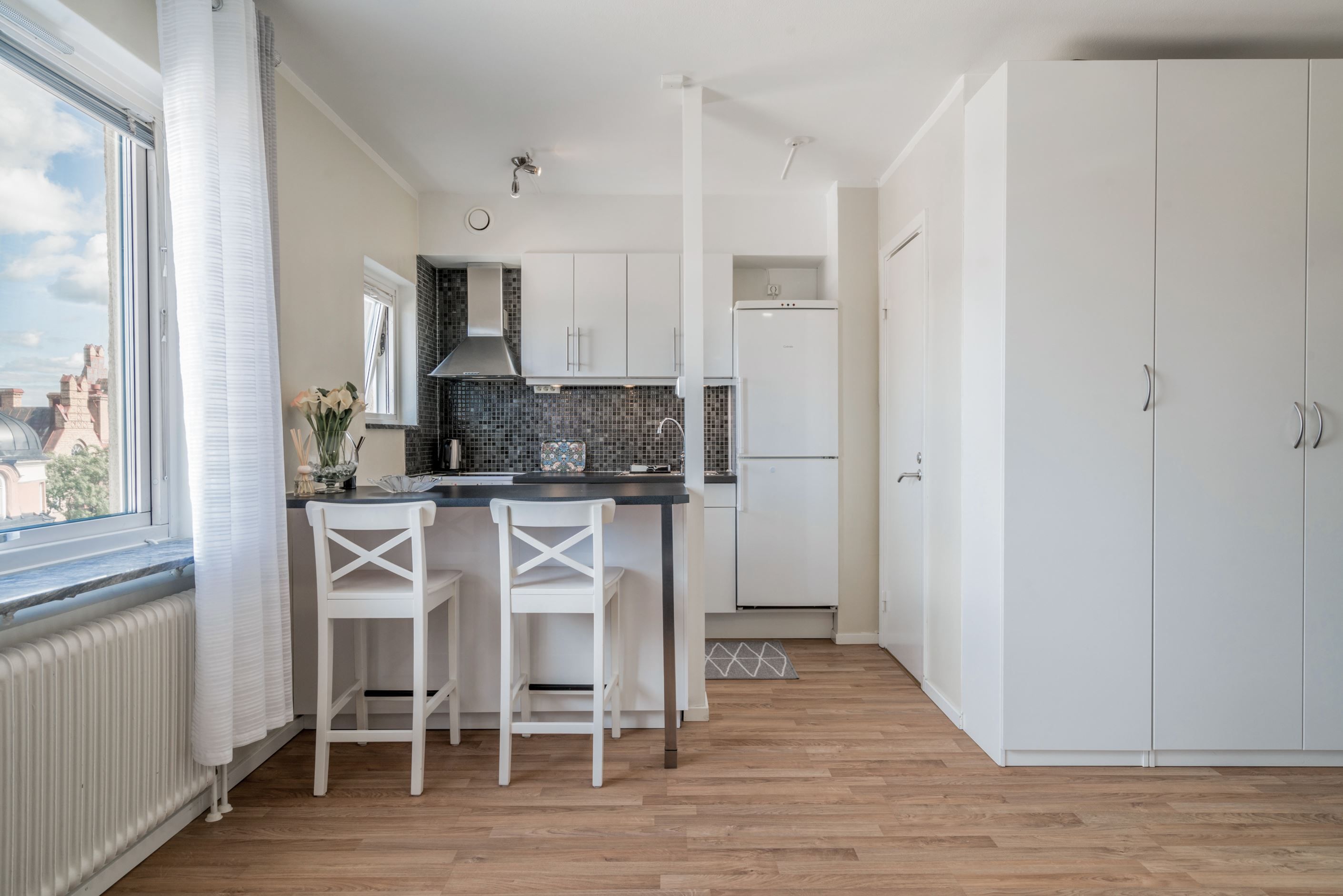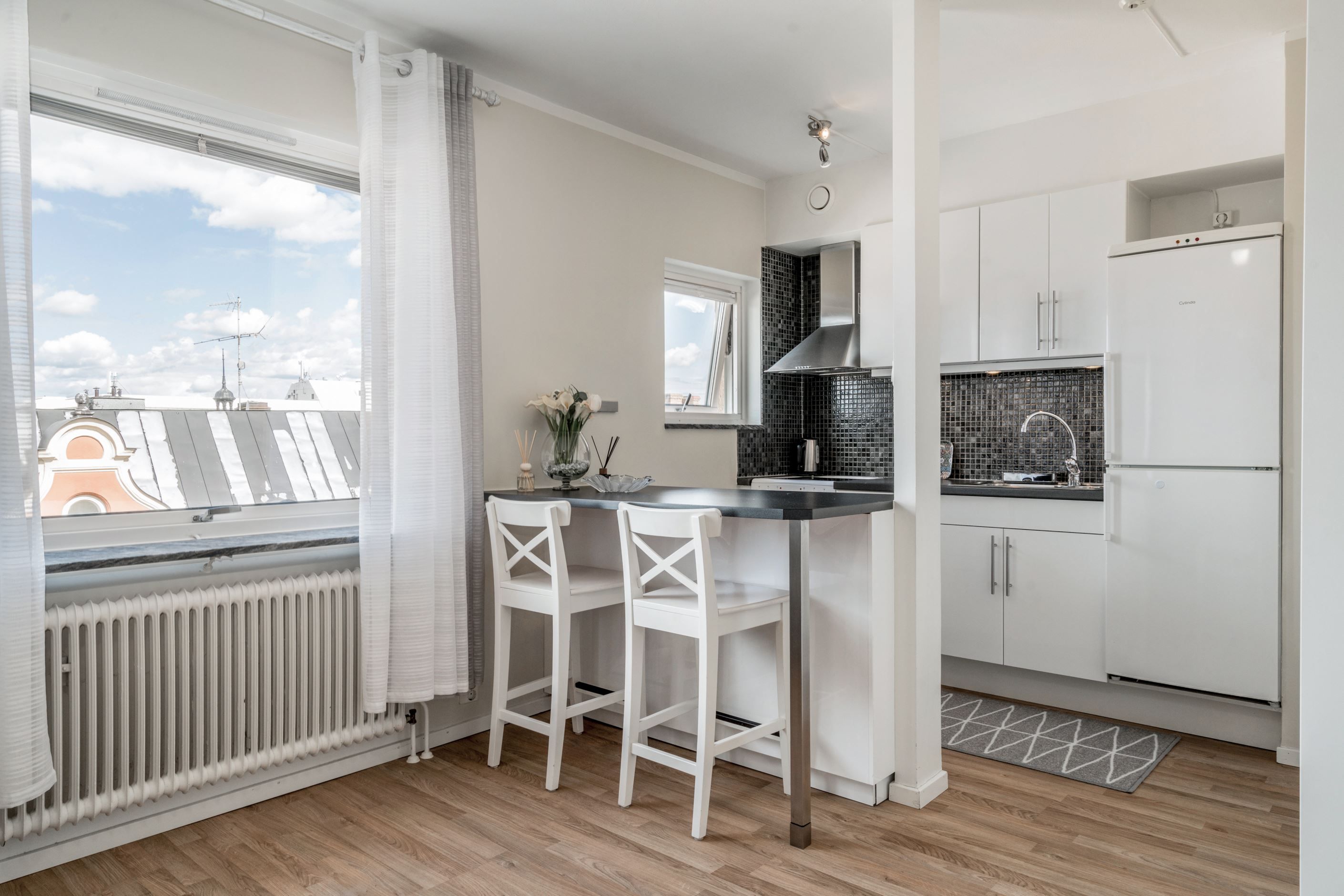 På våning 5 av 6 kan du njuta av ett härligt ljusinsläpp och en trevlig utsikt över stadens takåsar. Lägenheten erbjuder ett rymligt rum med plats för både säng, soffa och matplats samt stora fönster som släpper in gott om naturligt ljus. Det praktiska köket har gott om förvaringsutrymmen och är utrustat med alla nödvändiga vitvaror.