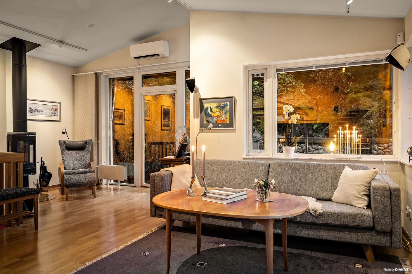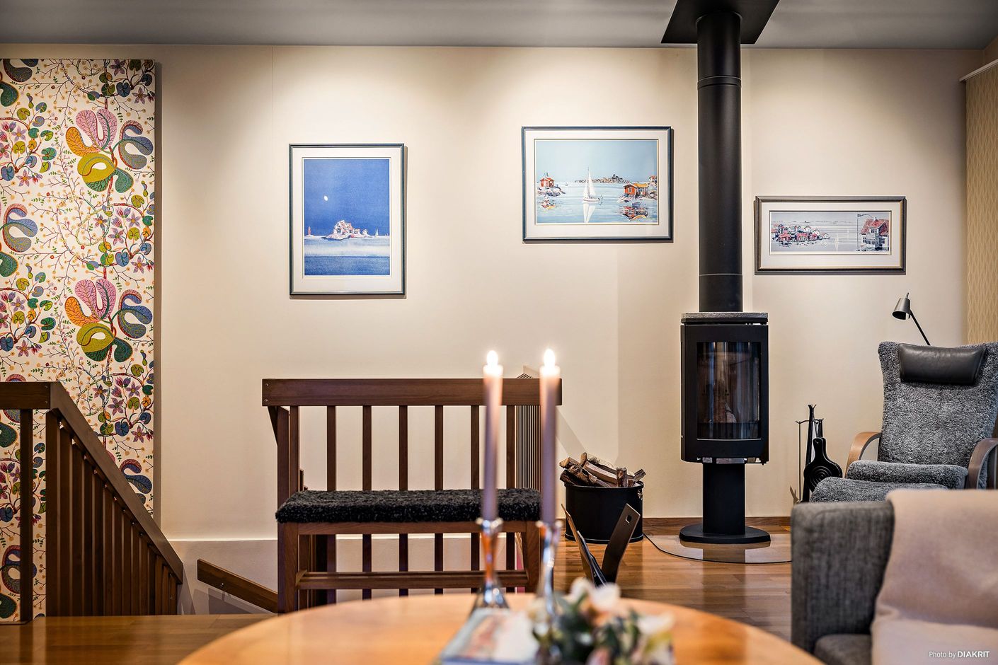 Via trappan når du övervåningen, där ljuset flödar genom de stora fönstren. Här möts du av ett generöst vardagsrum med braskamin, perfekt för mysiga kvällar. Från vardagsrummet når du den fina altanen med plats för både loungemöbler, odlingar och umgänge – en härlig förlängning av bostaden med skogen som närmsta utsikt. På detta plan finns dessutom två bra sovrum, ett helkaklat badrum och en rymlig klädkammare.