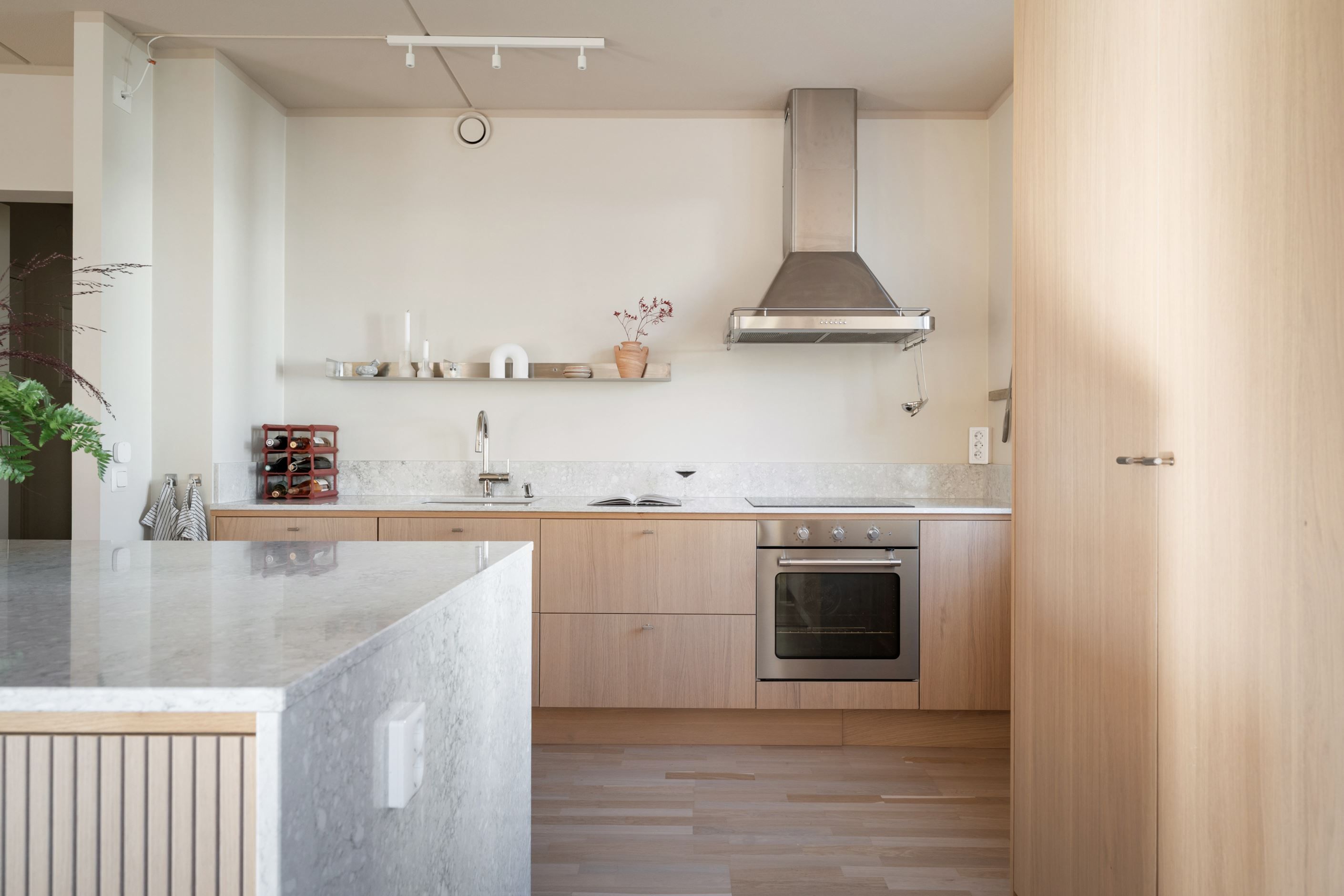 Kök och vardagsrum samspelar i en öppen och social planlösning med gott om plats för både stora middagar och avkopplande kvällar. Det stilrena köket är utrustat med en stor köksö och bänkskiva i sten, och härifrån når du den trivsamma balkongen med utsikt ner mot älven. Balkongen kan dessutom glasas in för dig som önskar förlänga utesäsongen.