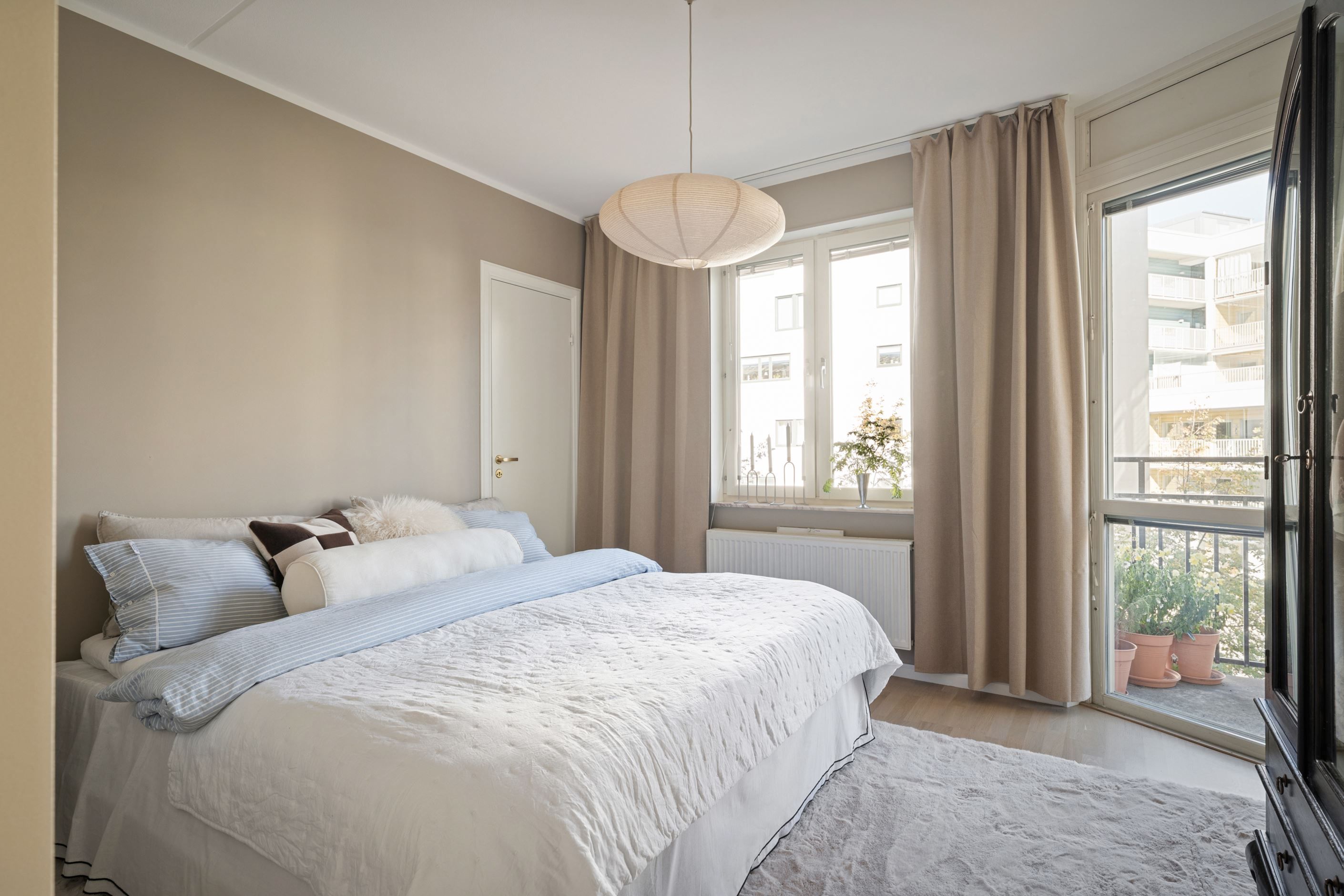 Bostaden rymmer två rymliga sovrum, båda med utgång till en mindre balkong. Det ena sovrummet erbjuder även en praktisk klädkammare. Det helkaklade badrummet är modernt utformat och har en smidig tvättavdelning. Hallen har gott om garderober och en platsbyggd bänk.