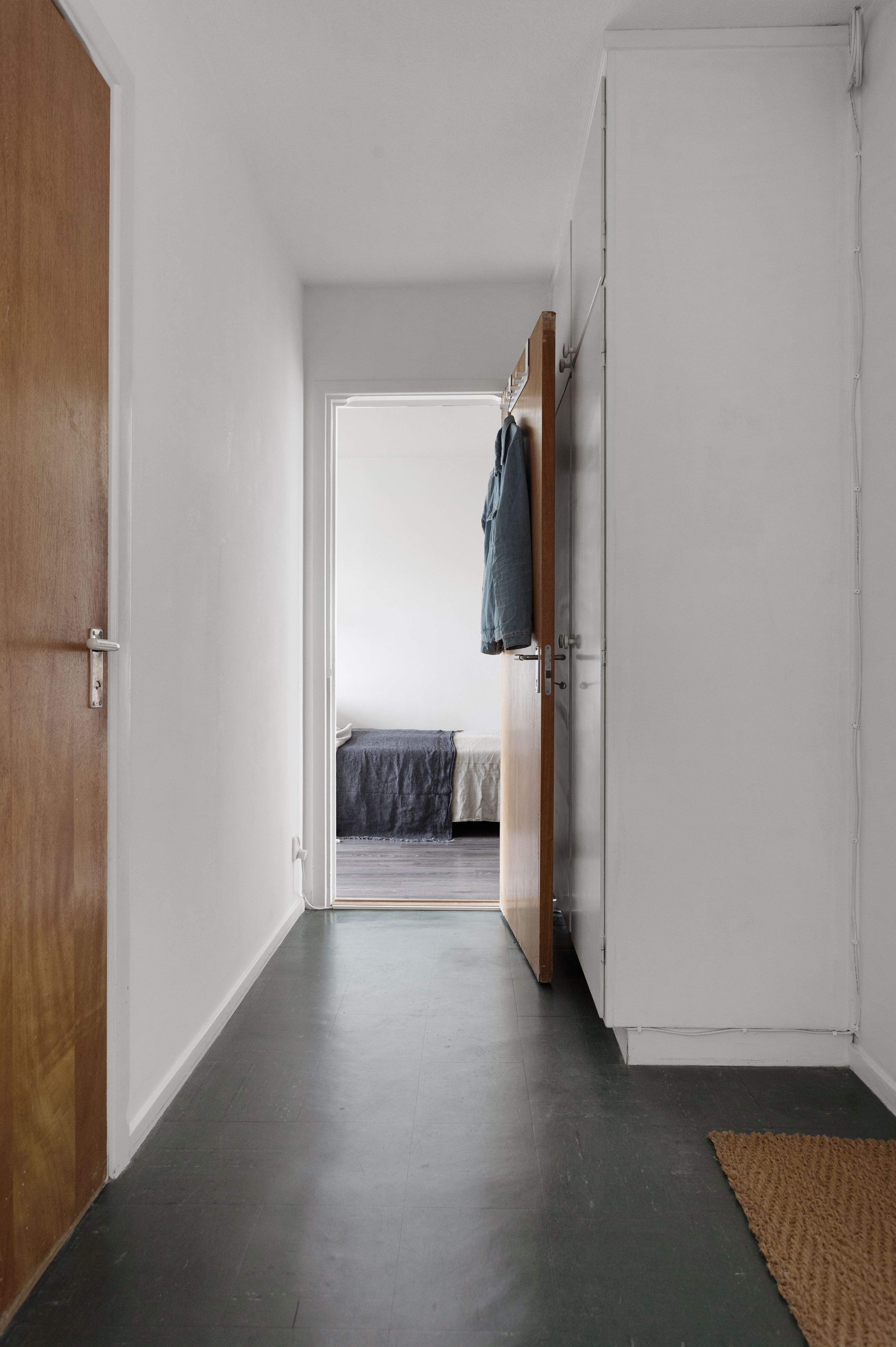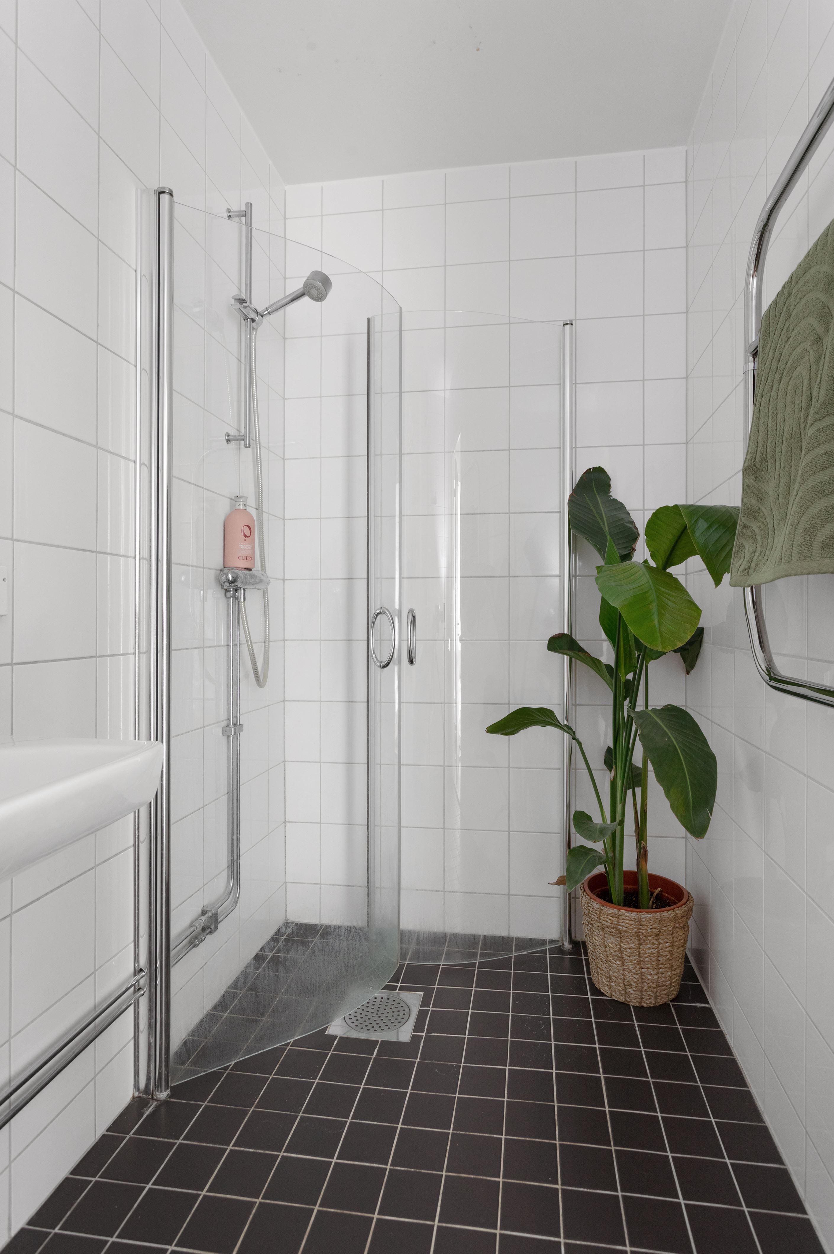 Sovrummet rymmer dubbelsäng och ytterligare möbler utan att kännas trångt, och har ljusa väggar samt ett fint golv. Duschrummet är stambytt och fräscht, med gott om plats och funktion.