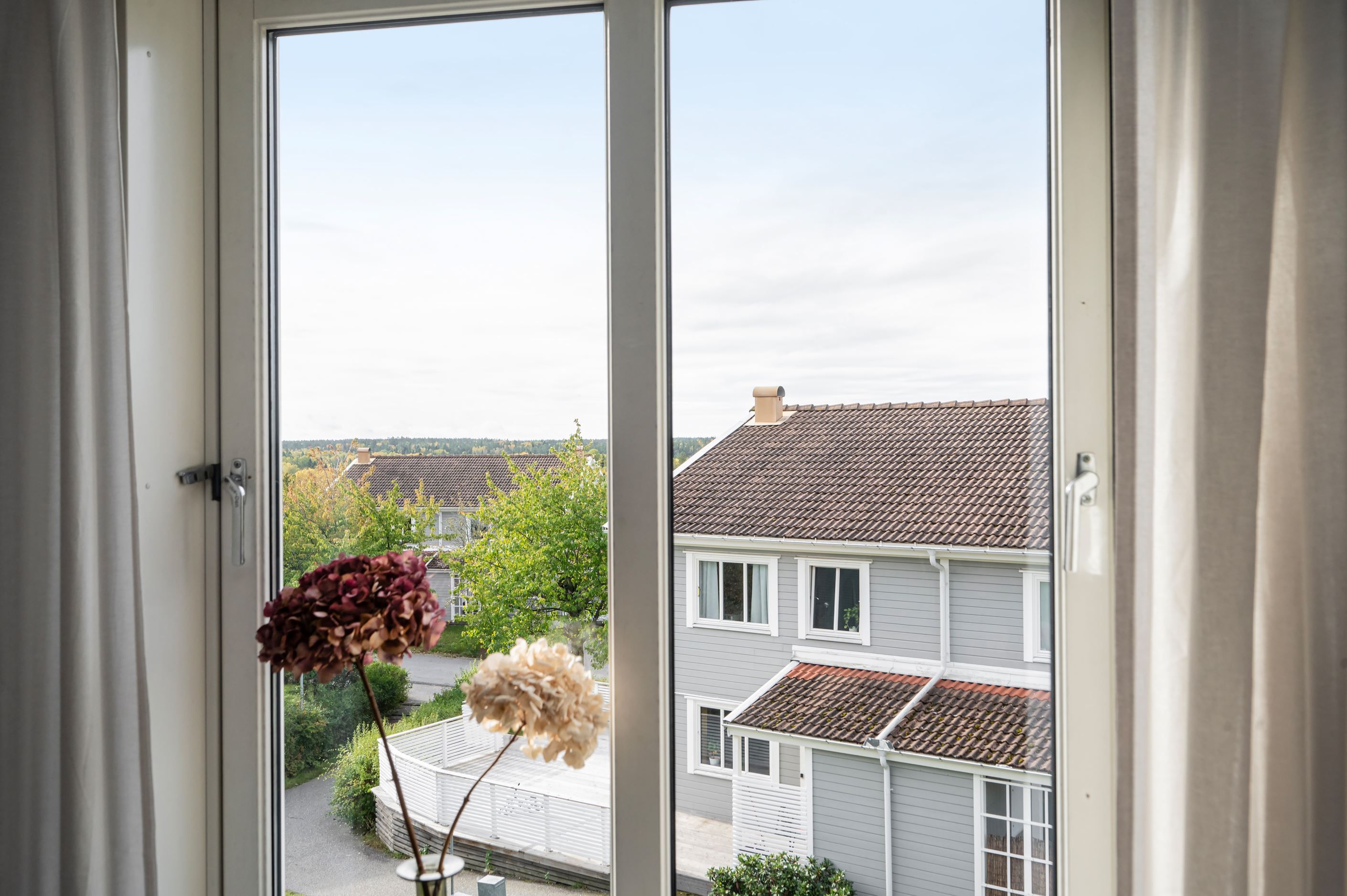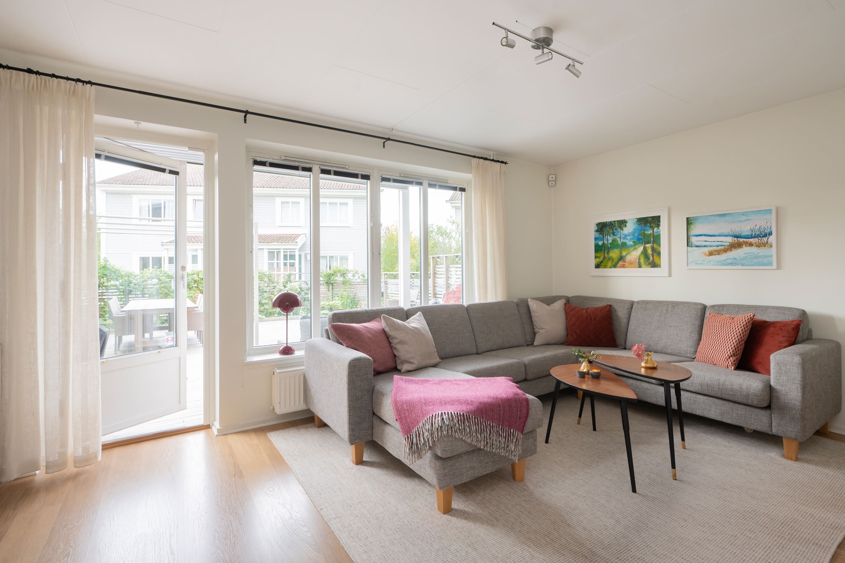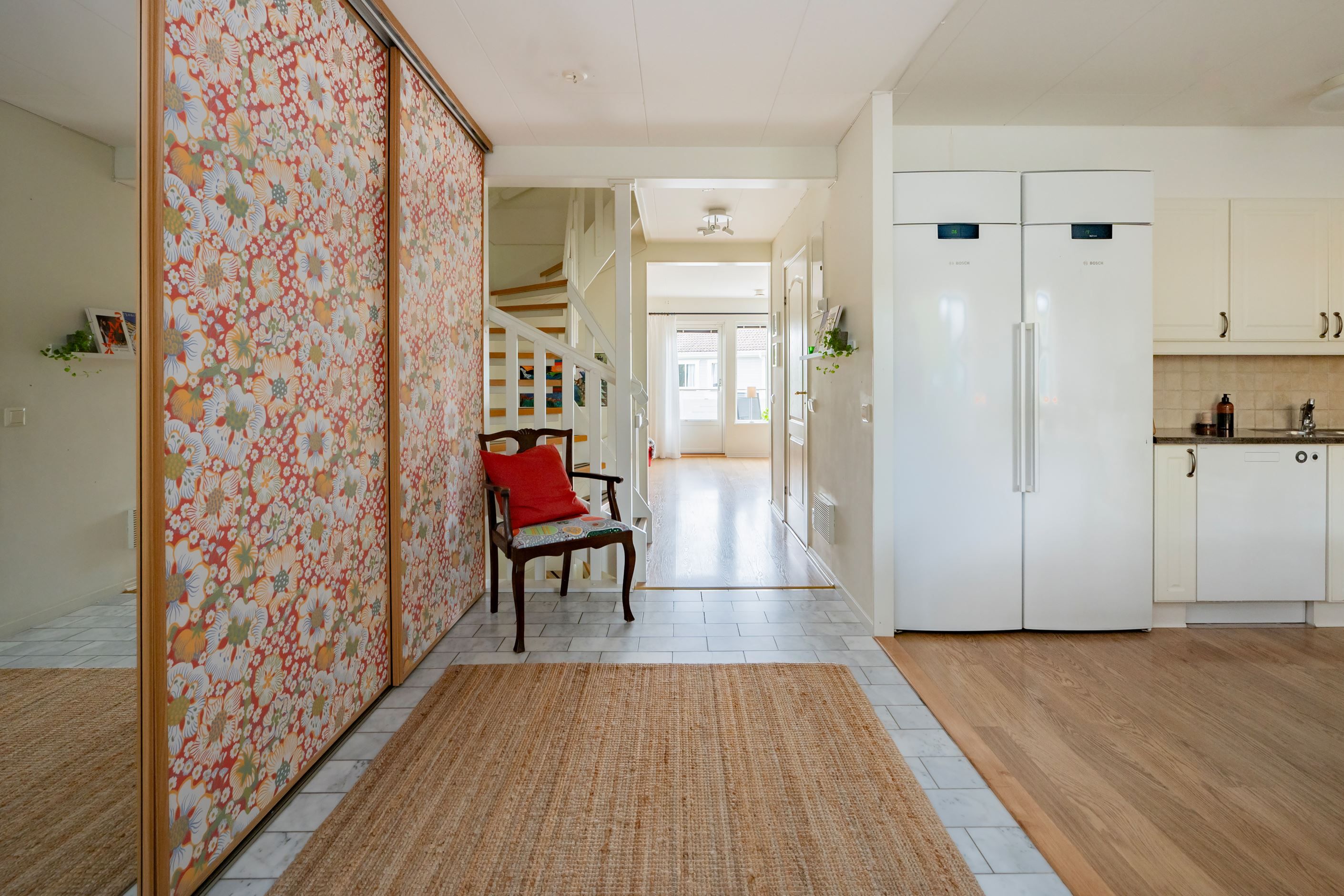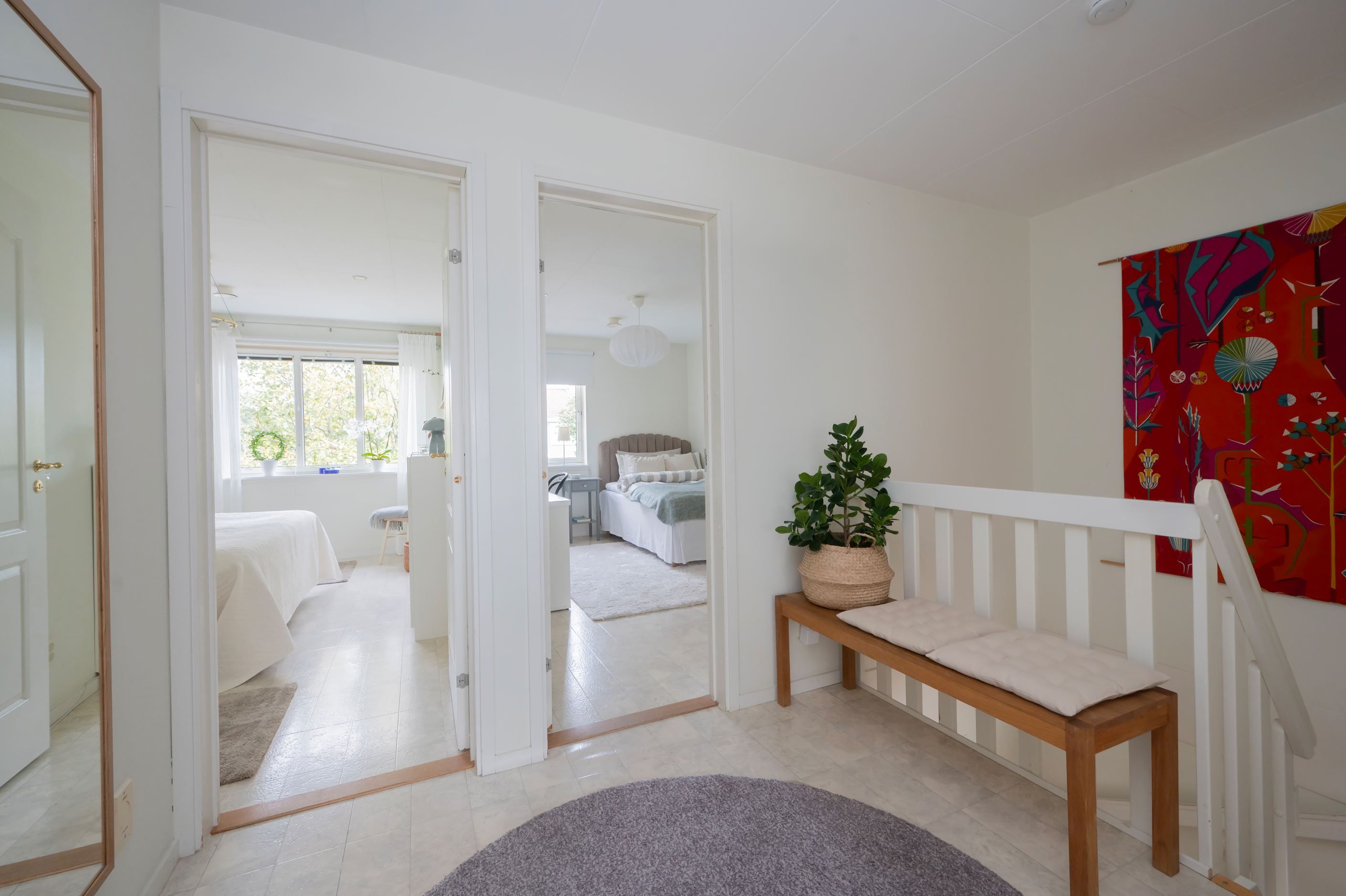 Invändigt möts man av en rymlig hall med stor skjutdörrsgarderob längs hela väggen. Stort kök med mycket förvaring och matplats. Helkaklat badrum med tvättmöjligheter. Rymligt vardagsrum med utgång till balkong. En trappa upp finns fyra rymliga sovrum och badrum med badkar. En trappa ner finns ett stort allrum med en stor skjutdörrsgarderob och badrum med bastu. Här finns den stora trädäckade altanen i soligt söderläge. Plats för två bilar på uppfart med carport och möjlighet till laddbox. Got om plats för förvaring i det utvändiga förrådet på entrésidan.