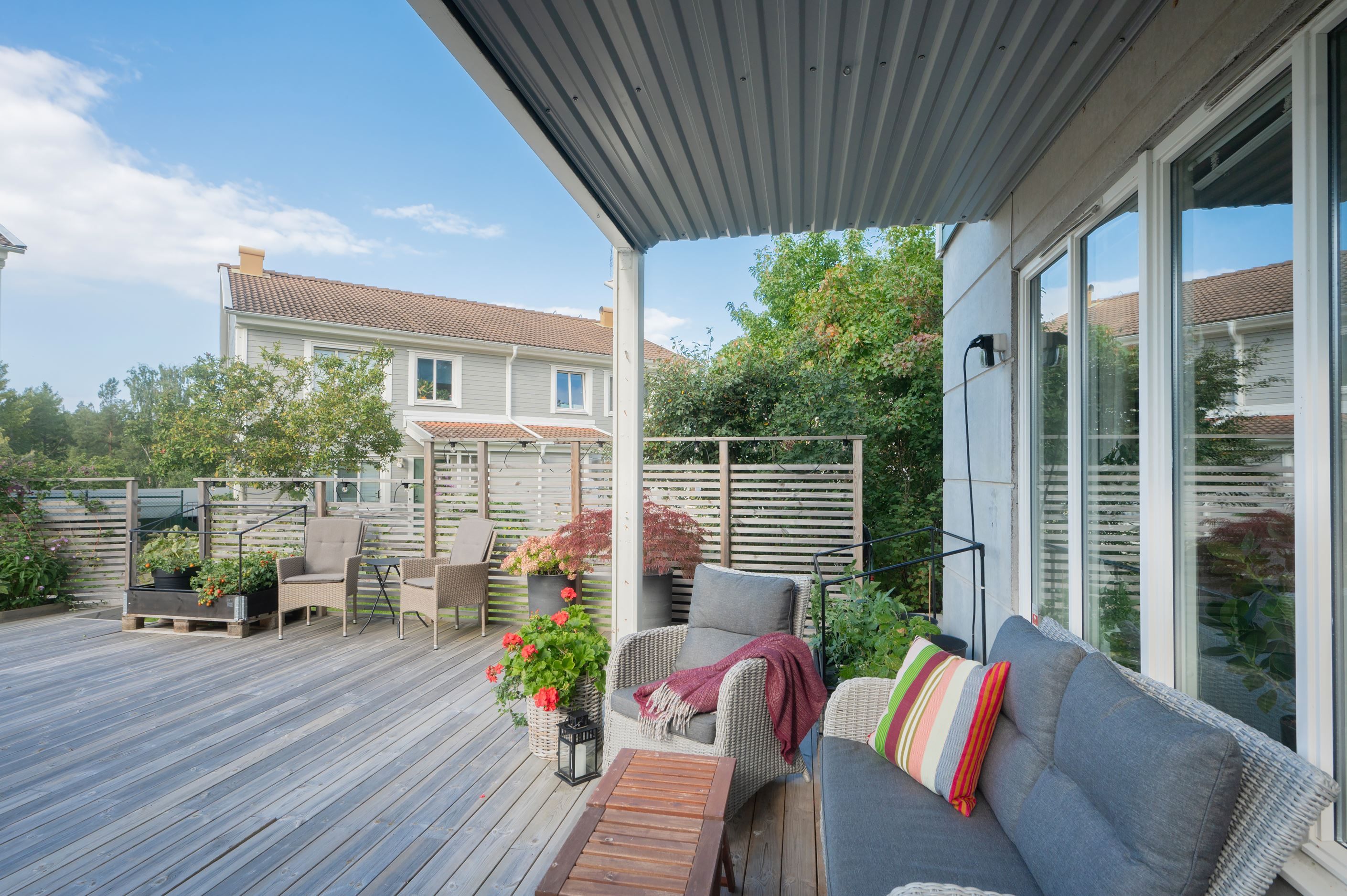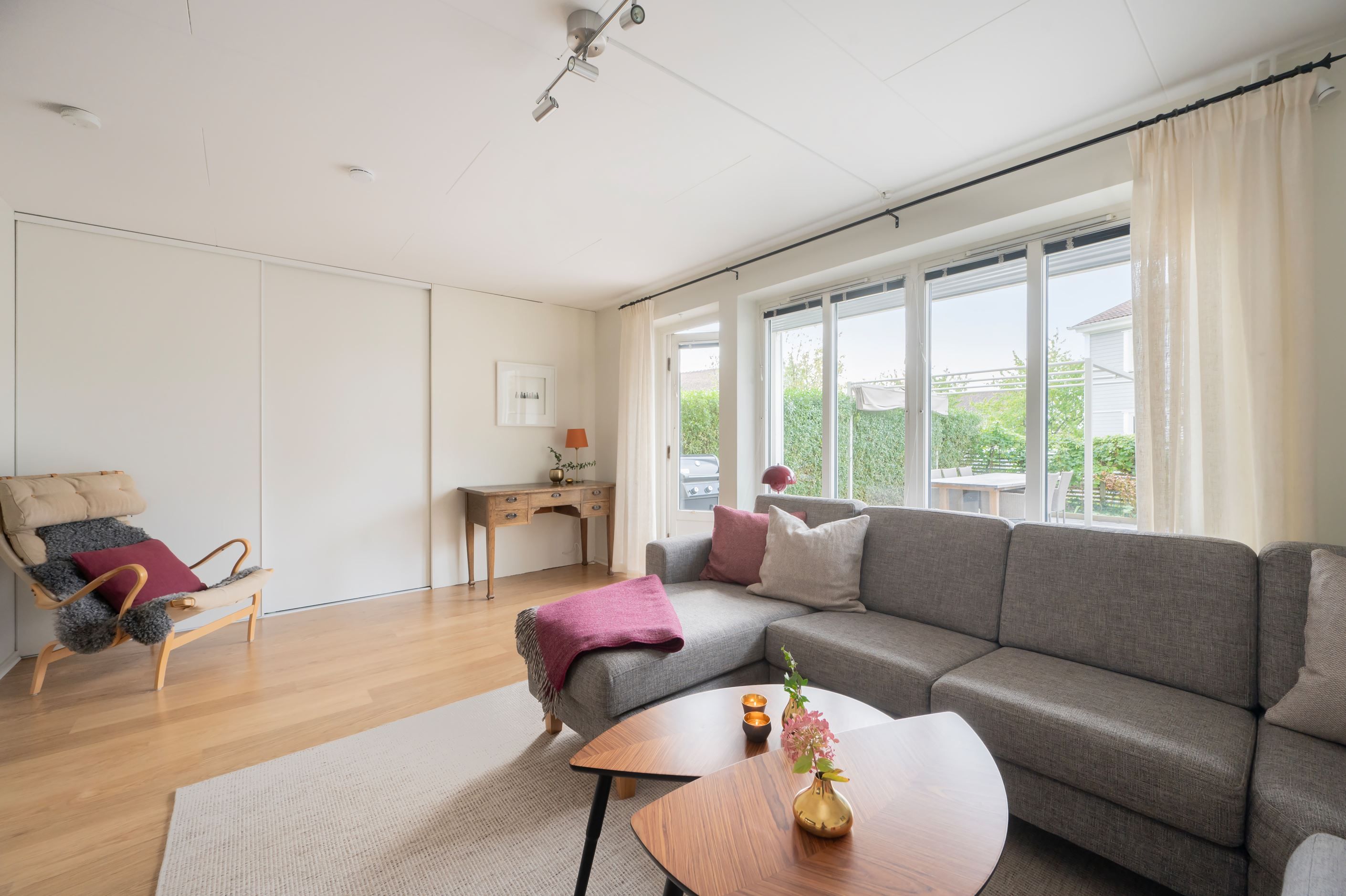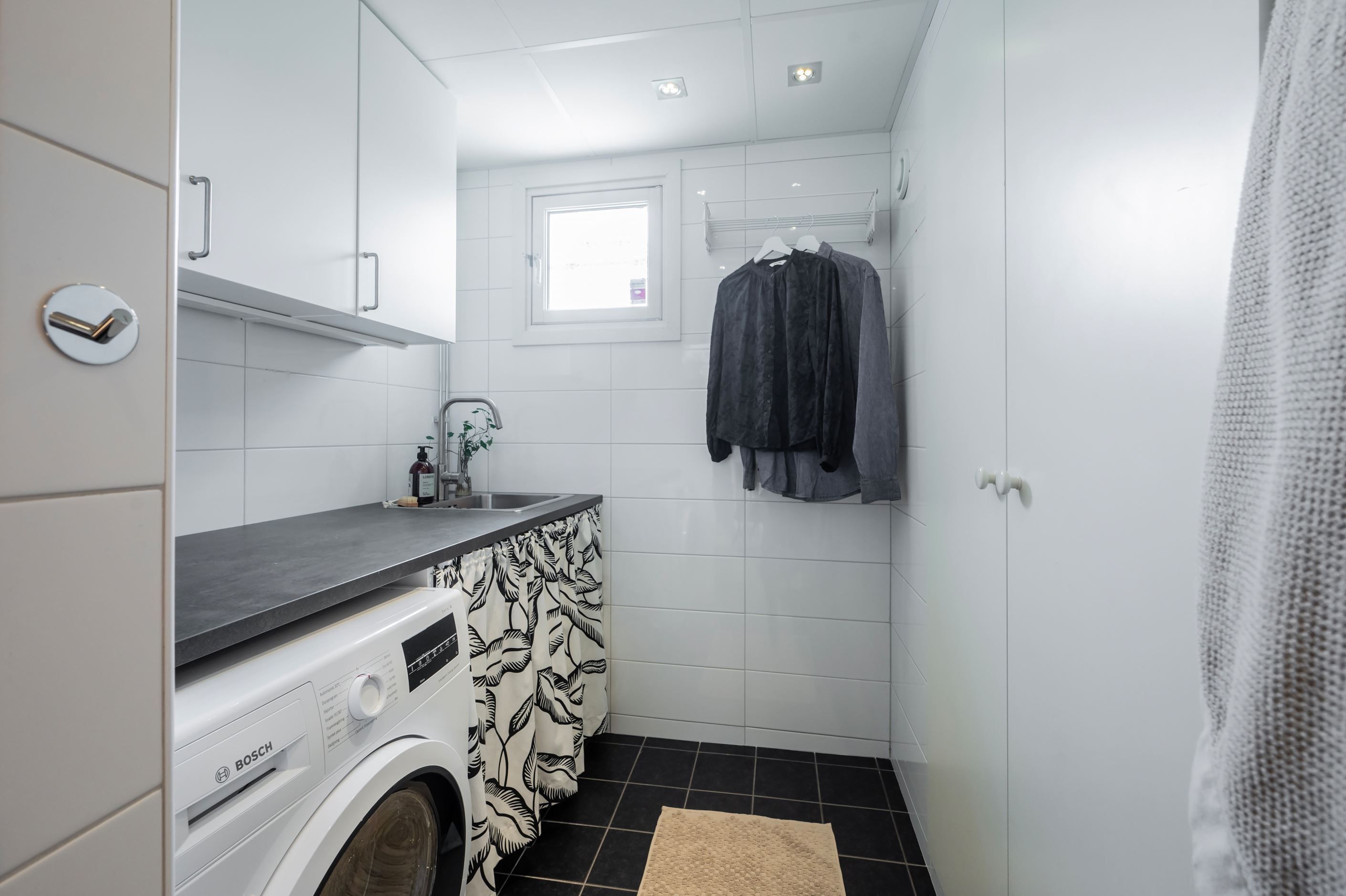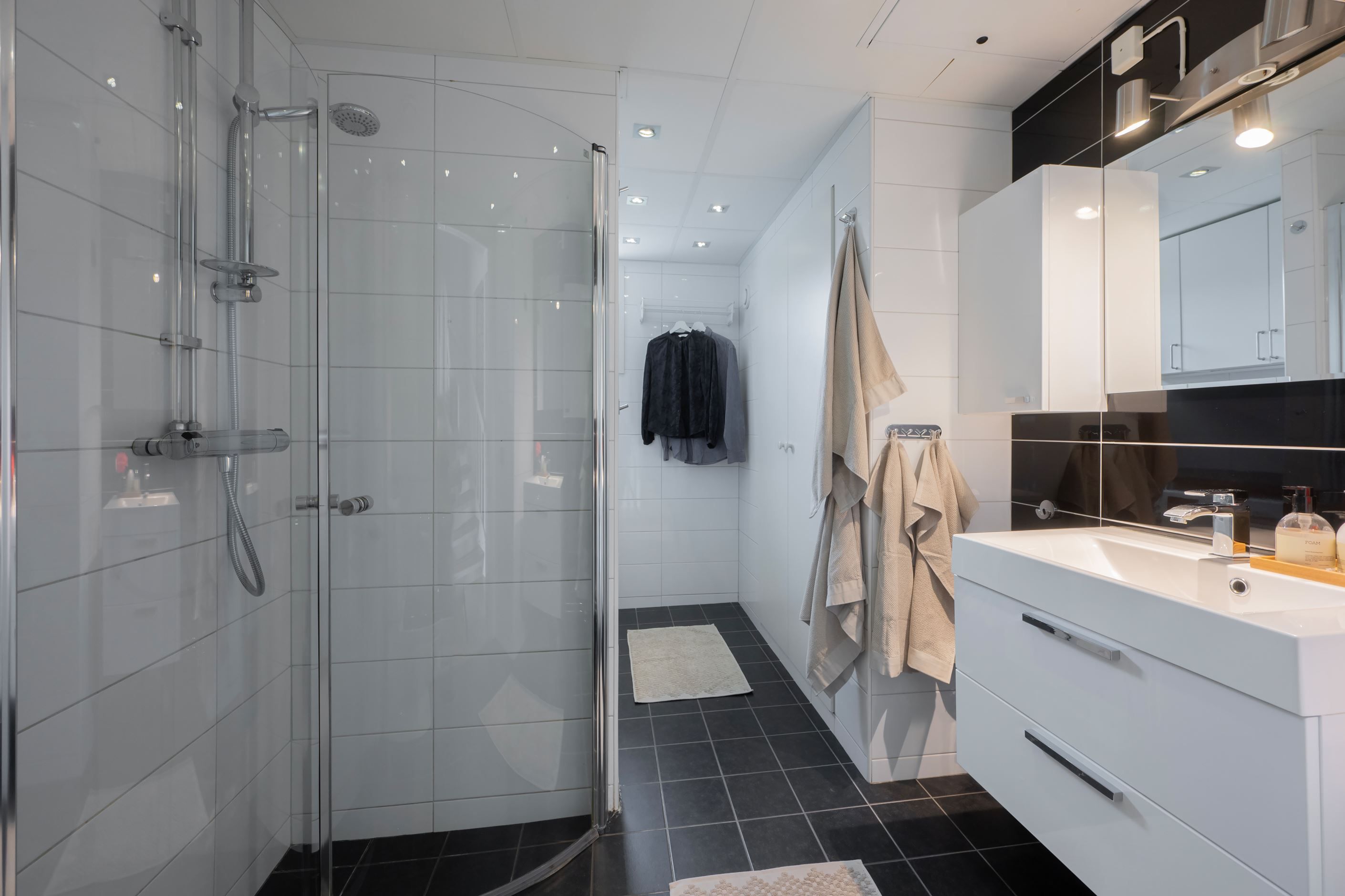 Invändigt möts man av en rymlig hall med stor skjutdörrsgarderob längs hela väggen. Stort kök med mycket förvaring och matplats. Helkaklat badrum med tvättmöjligheter. Rymligt vardagsrum med utgång till balkong. En trappa upp finns fyra rymliga sovrum och badrum med badkar. En trappa ner finns ett stort allrum med en stor skjutdörrsgarderob och badrum med bastu. Här finns den stora trädäckade altanen i soligt söderläge. Plats för två bilar på uppfart med carport och möjlighet till laddbox. Got om plats för förvaring i det utvändiga förrådet på entrésidan.