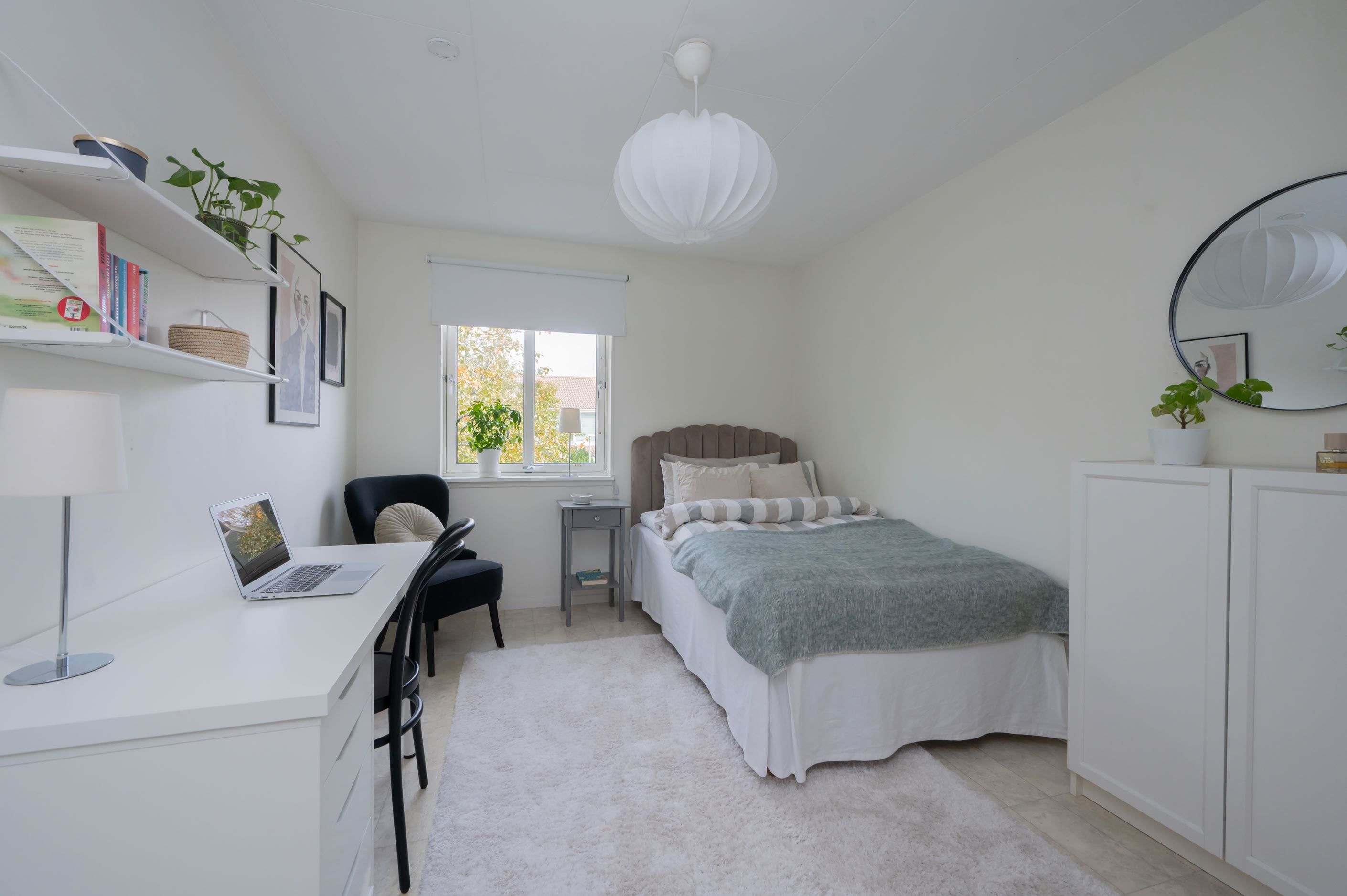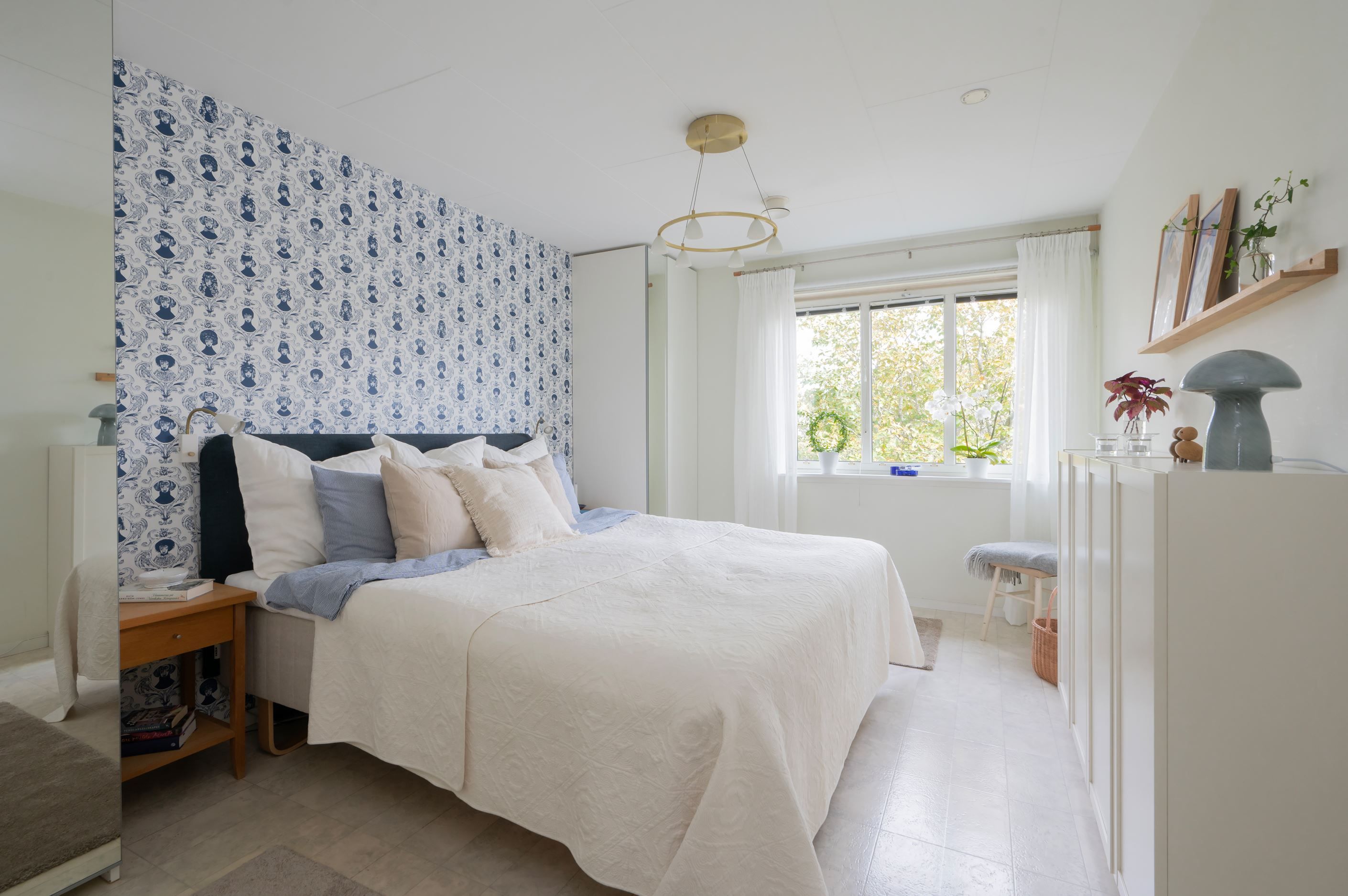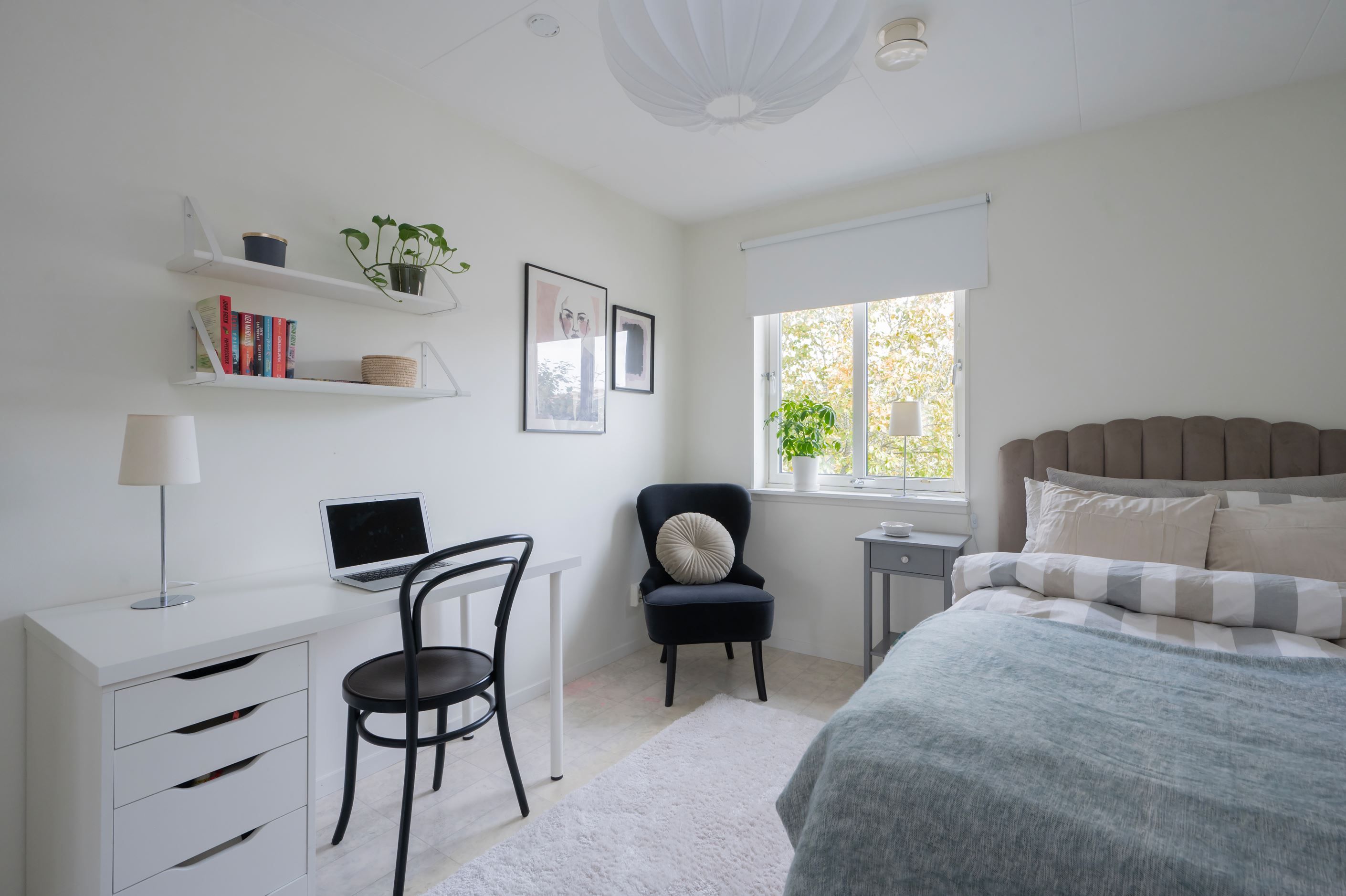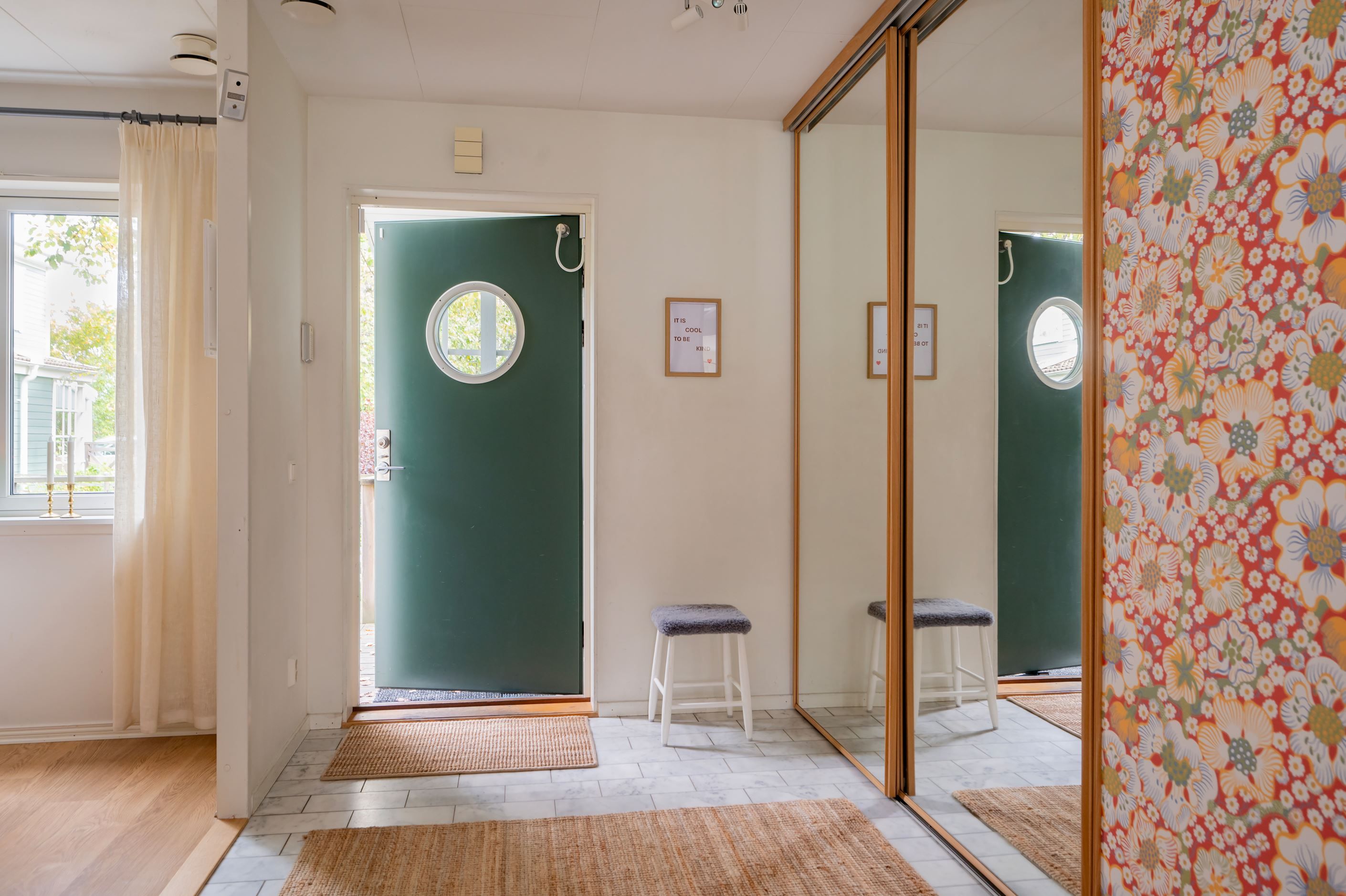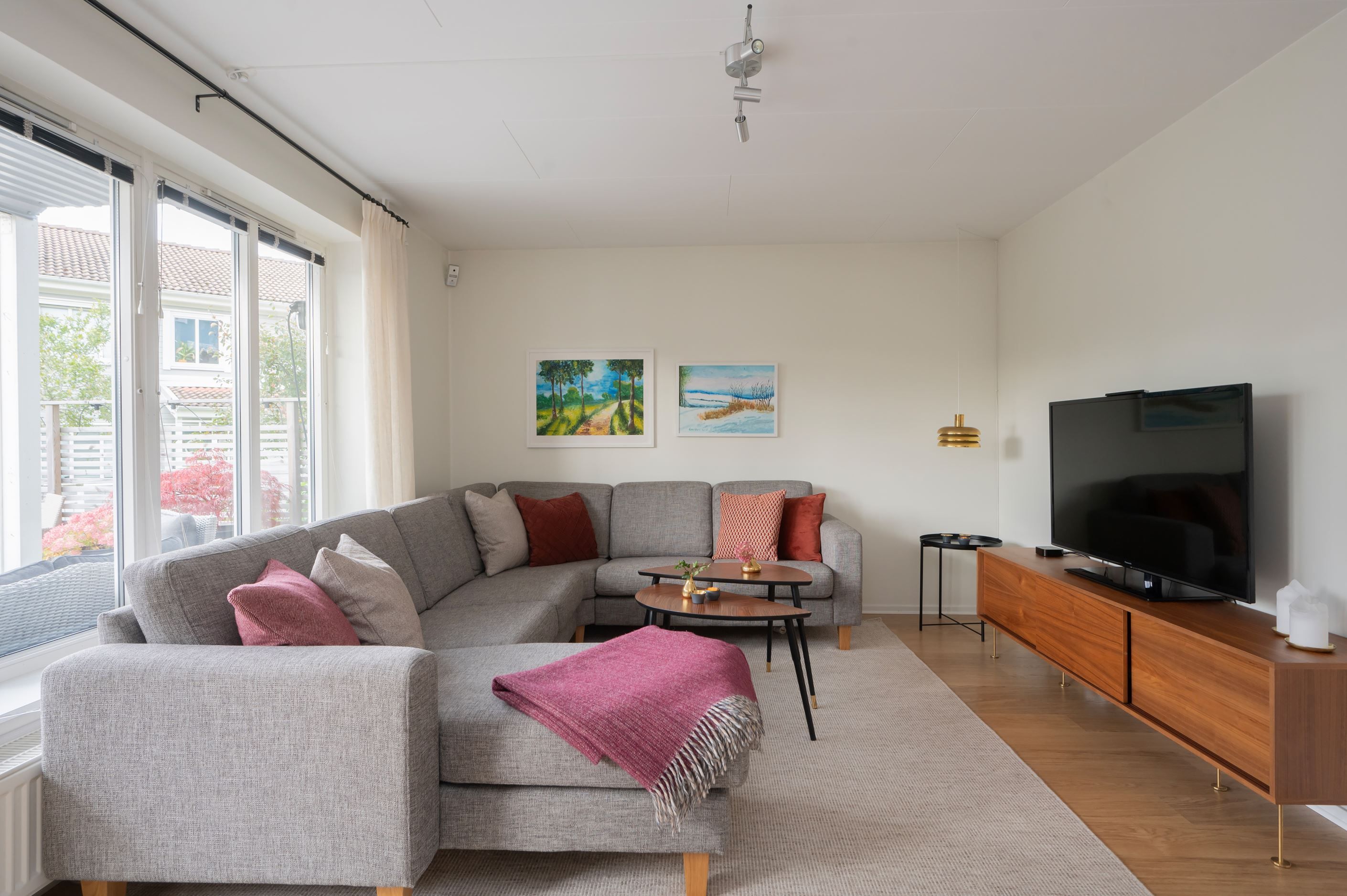 Invändigt möts man av en rymlig hall med stor skjutdörrsgarderob längs hela väggen. Stort kök med mycket förvaring och matplats. Helkaklat badrum med tvättmöjligheter. Rymligt vardagsrum med utgång till balkong. En trappa upp finns fyra rymliga sovrum och badrum med badkar. En trappa ner finns ett stort allrum med en stor skjutdörrsgarderob och badrum med bastu. Här finns den stora trädäckade altanen i soligt söderläge. Plats för två bilar på uppfart med carport och möjlighet till laddbox. Got om plats för förvaring i det utvändiga förrådet på entrésidan.