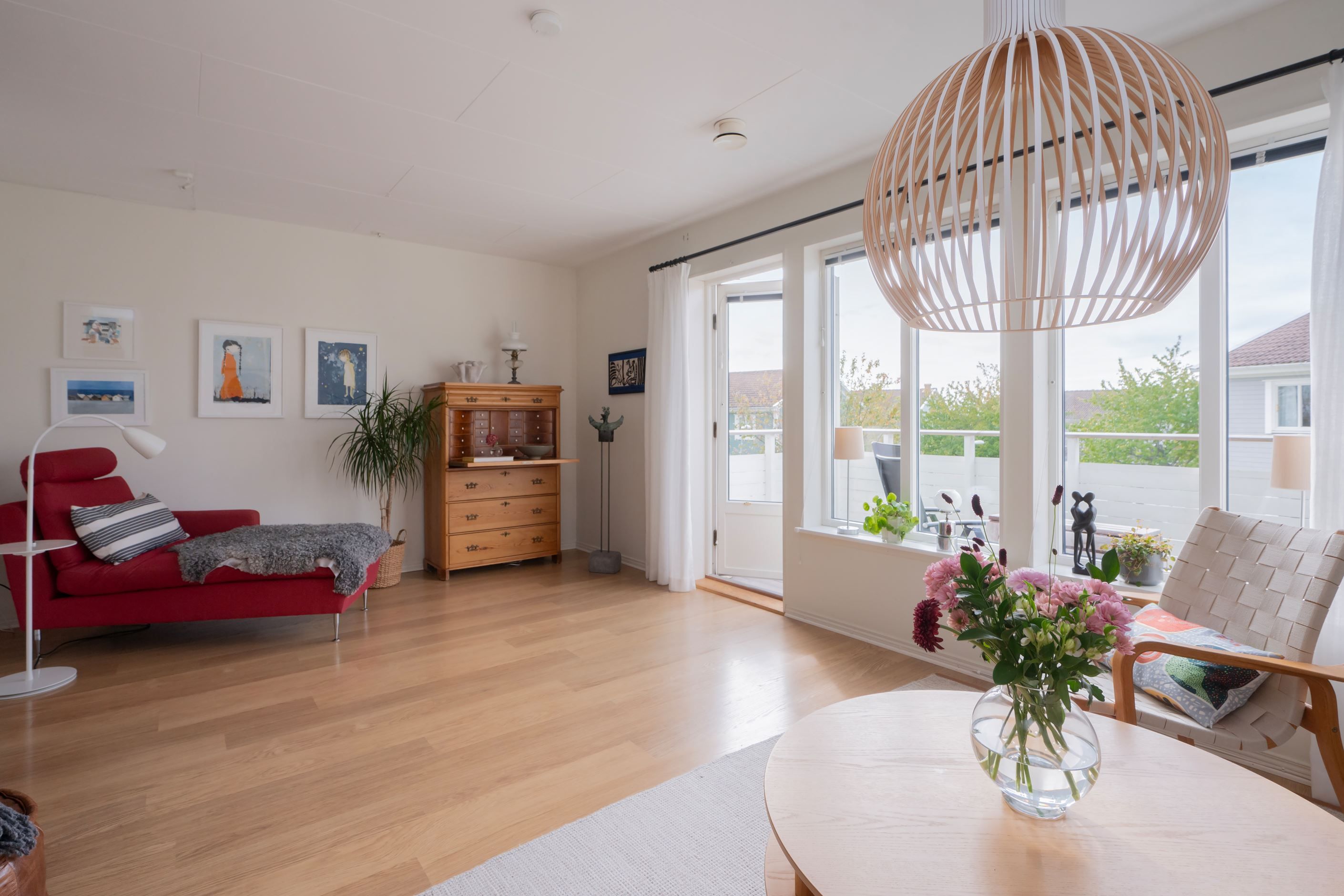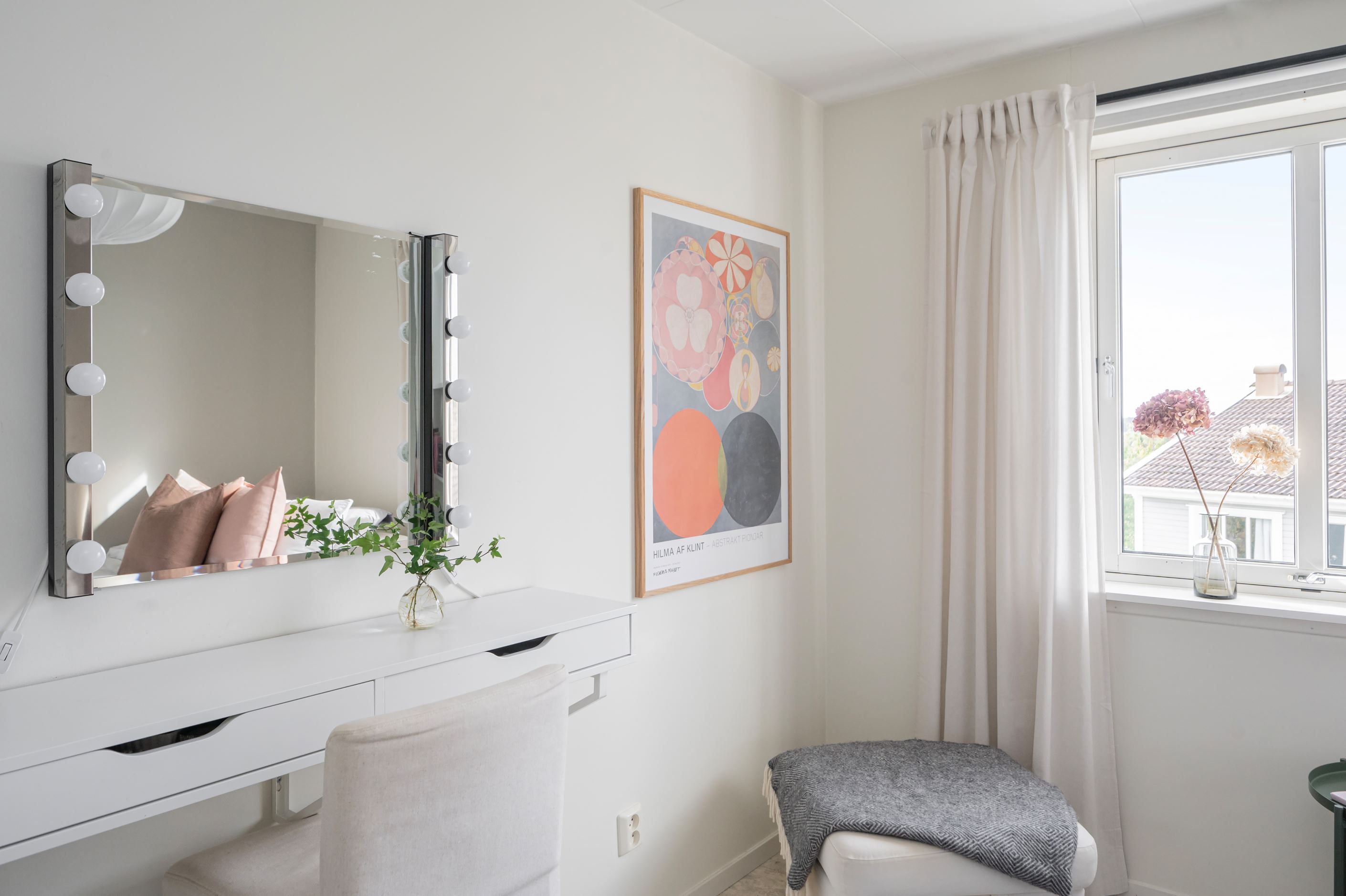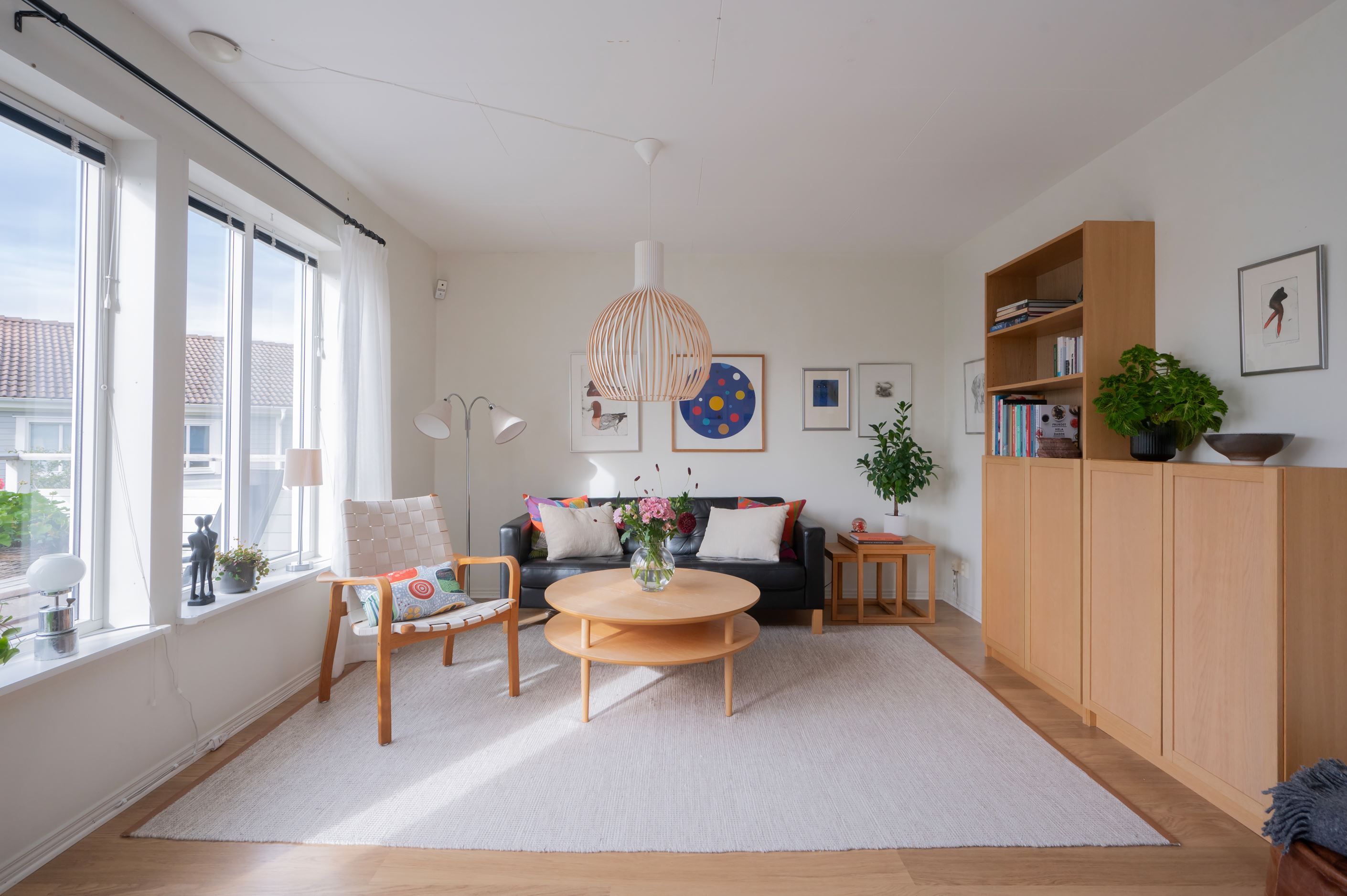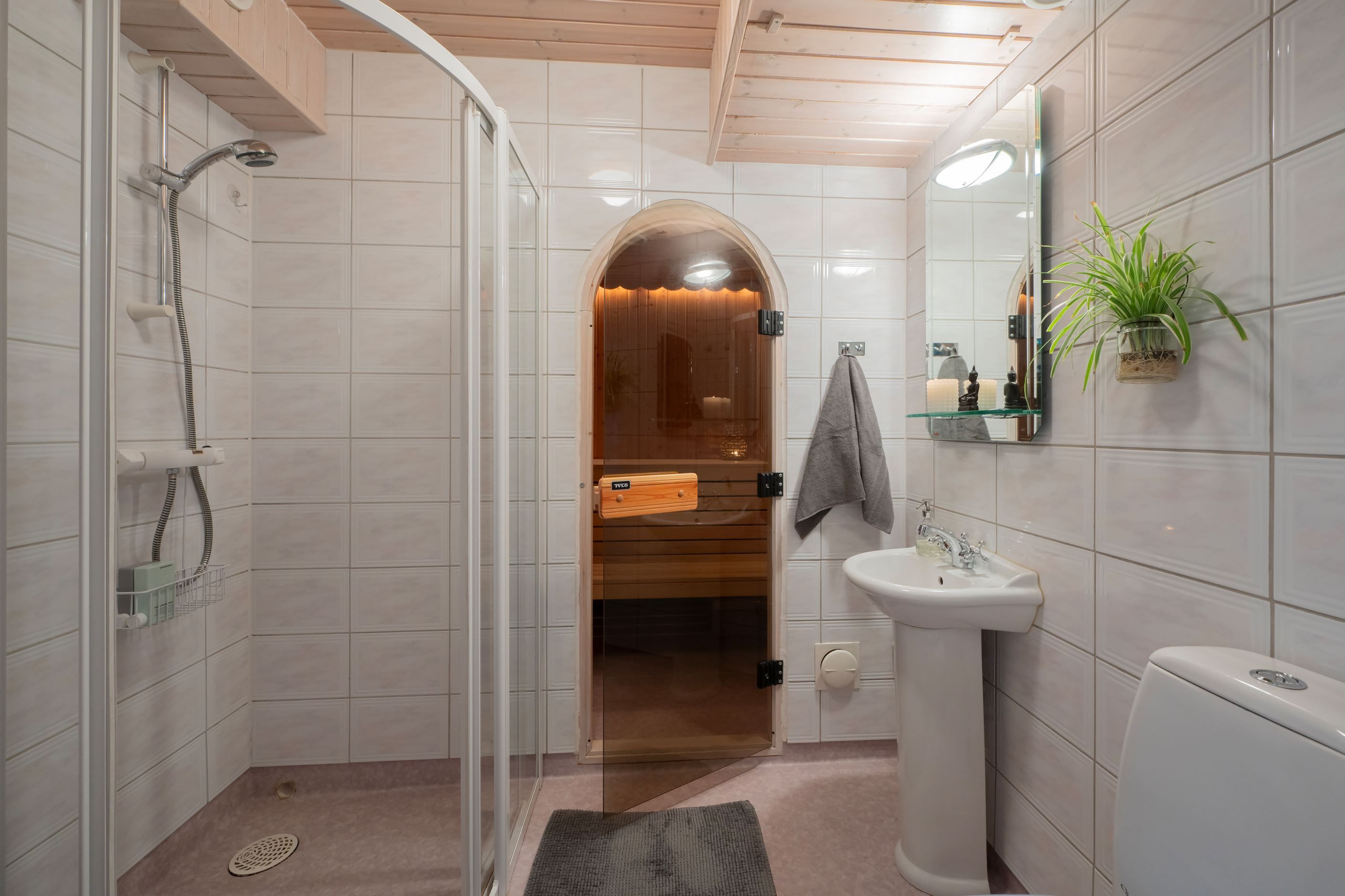 Invändigt möts man av en rymlig hall med stor skjutdörrsgarderob längs hela väggen. Stort kök med mycket förvaring och matplats. Helkaklat badrum med tvättmöjligheter. Rymligt vardagsrum med utgång till balkong. En trappa upp finns fyra rymliga sovrum och badrum med badkar. En trappa ner finns ett stort allrum med en stor skjutdörrsgarderob och badrum med bastu. Här finns den stora trädäckade altanen i soligt söderläge. Plats för två bilar på uppfart med carport och möjlighet till laddbox. Got om plats för förvaring i det utvändiga förrådet på entrésidan.