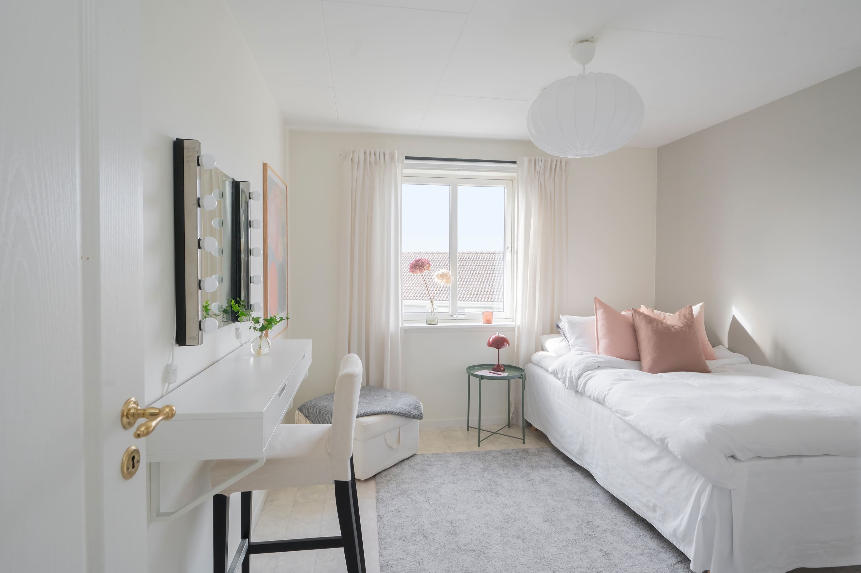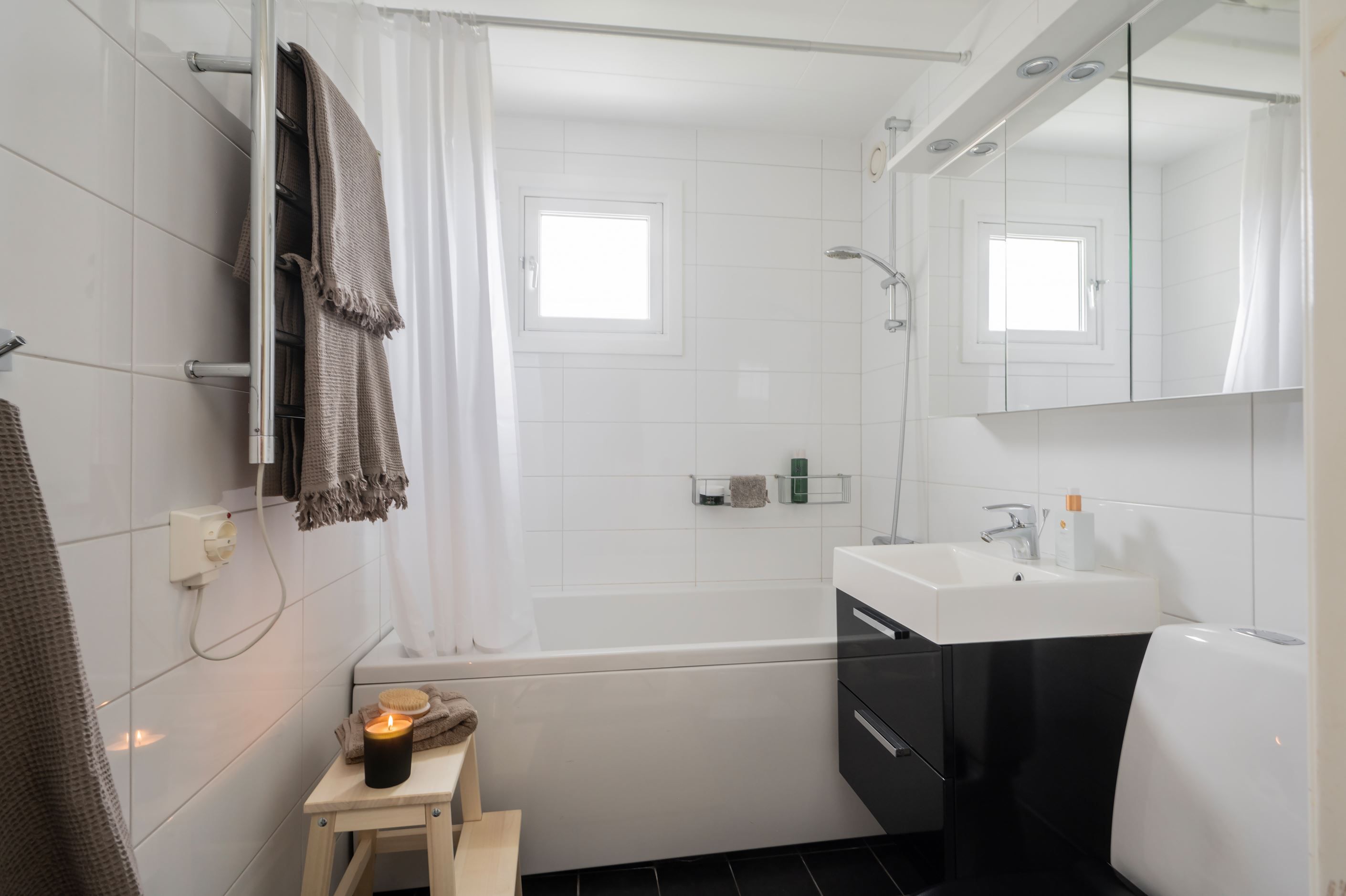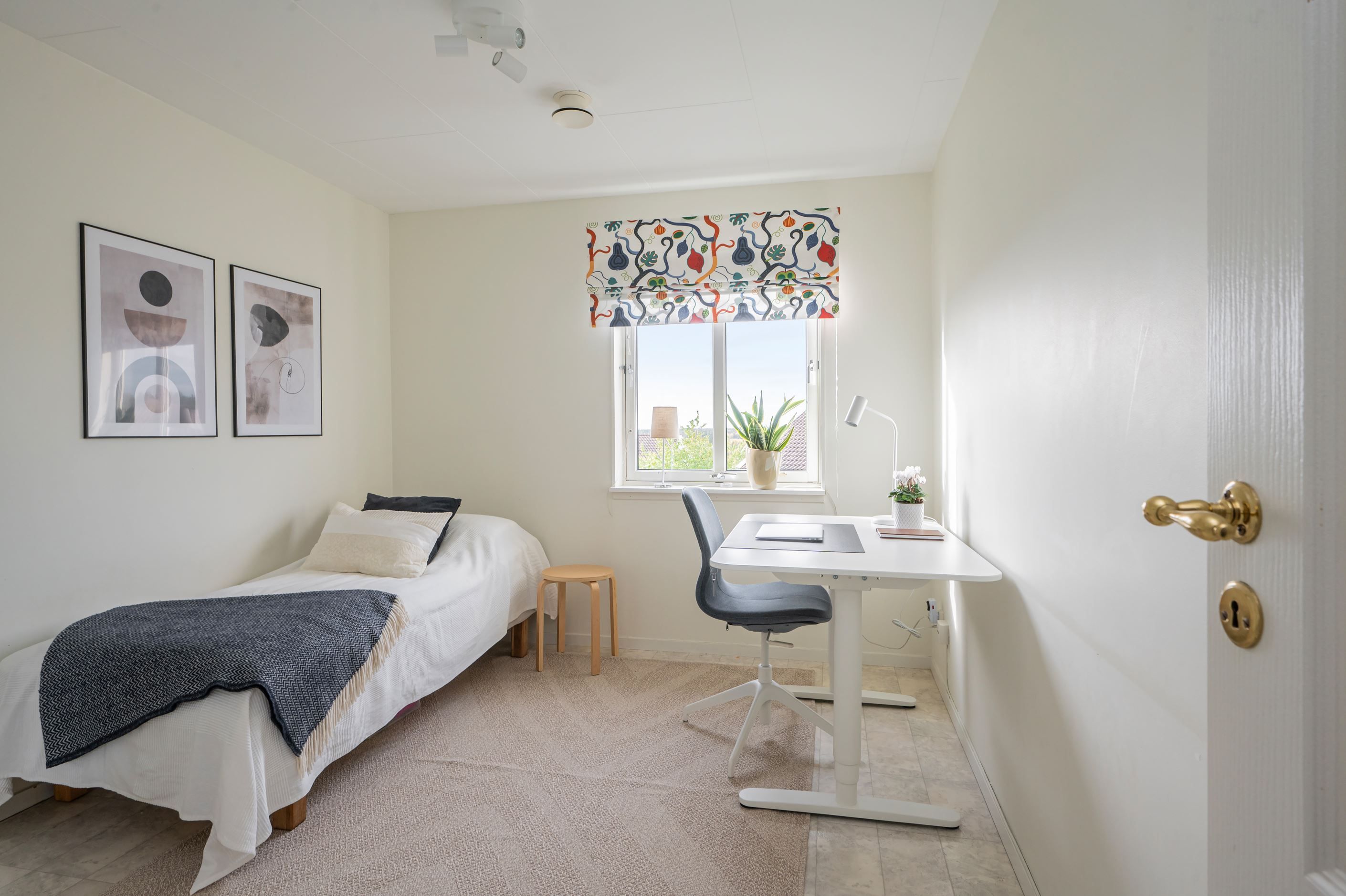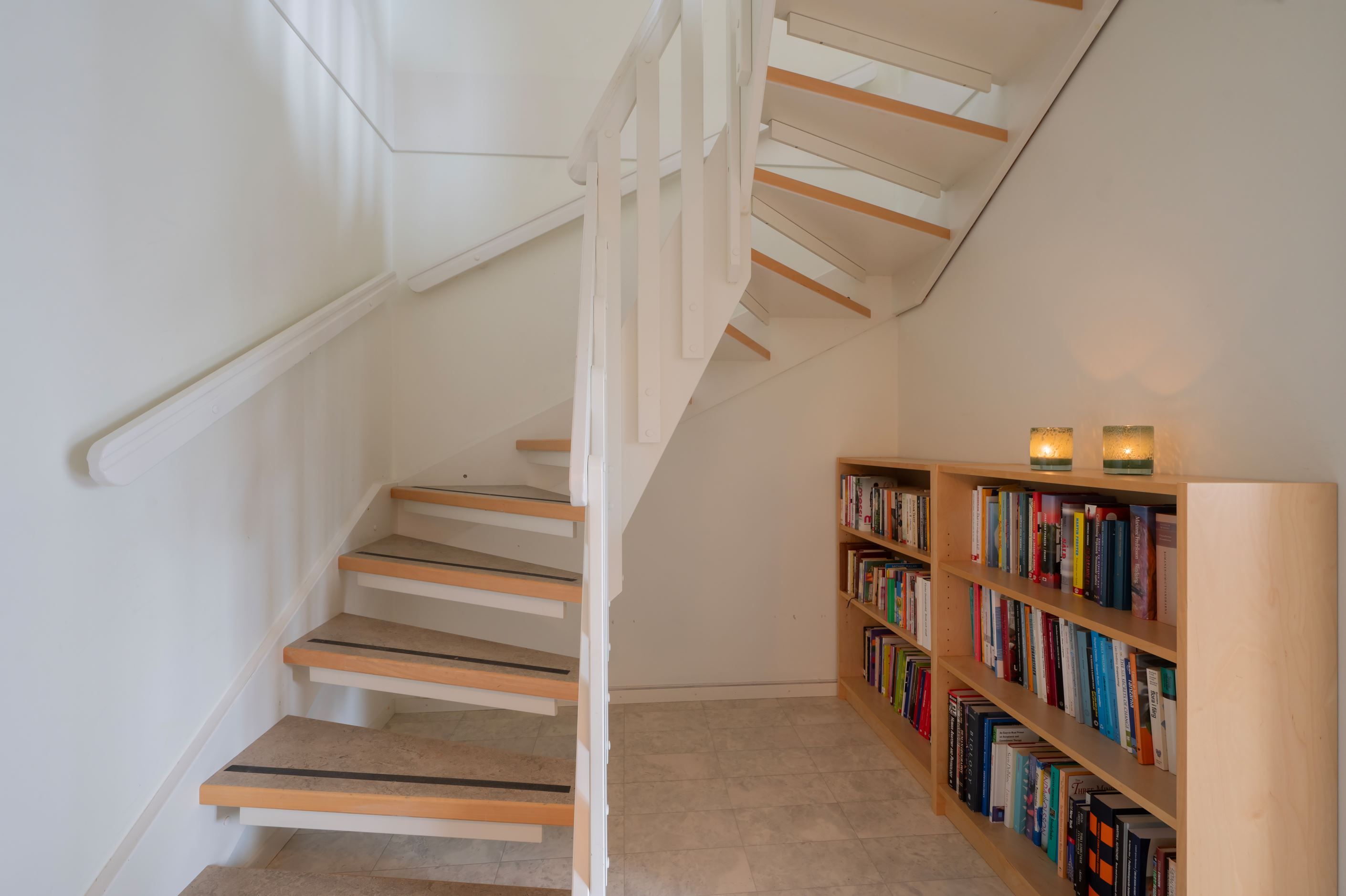 Invändigt möts man av en rymlig hall med stor skjutdörrsgarderob längs hela väggen. Stort kök med mycket förvaring och matplats. Helkaklat badrum med tvättmöjligheter. Rymligt vardagsrum med utgång till balkong. En trappa upp finns fyra rymliga sovrum och badrum med badkar. En trappa ner finns ett stort allrum med en stor skjutdörrsgarderob och badrum med bastu. Här finns den stora trädäckade altanen i soligt söderläge. Plats för två bilar på uppfart med carport och möjlighet till laddbox. Got om plats för förvaring i det utvändiga förrådet på entrésidan.
