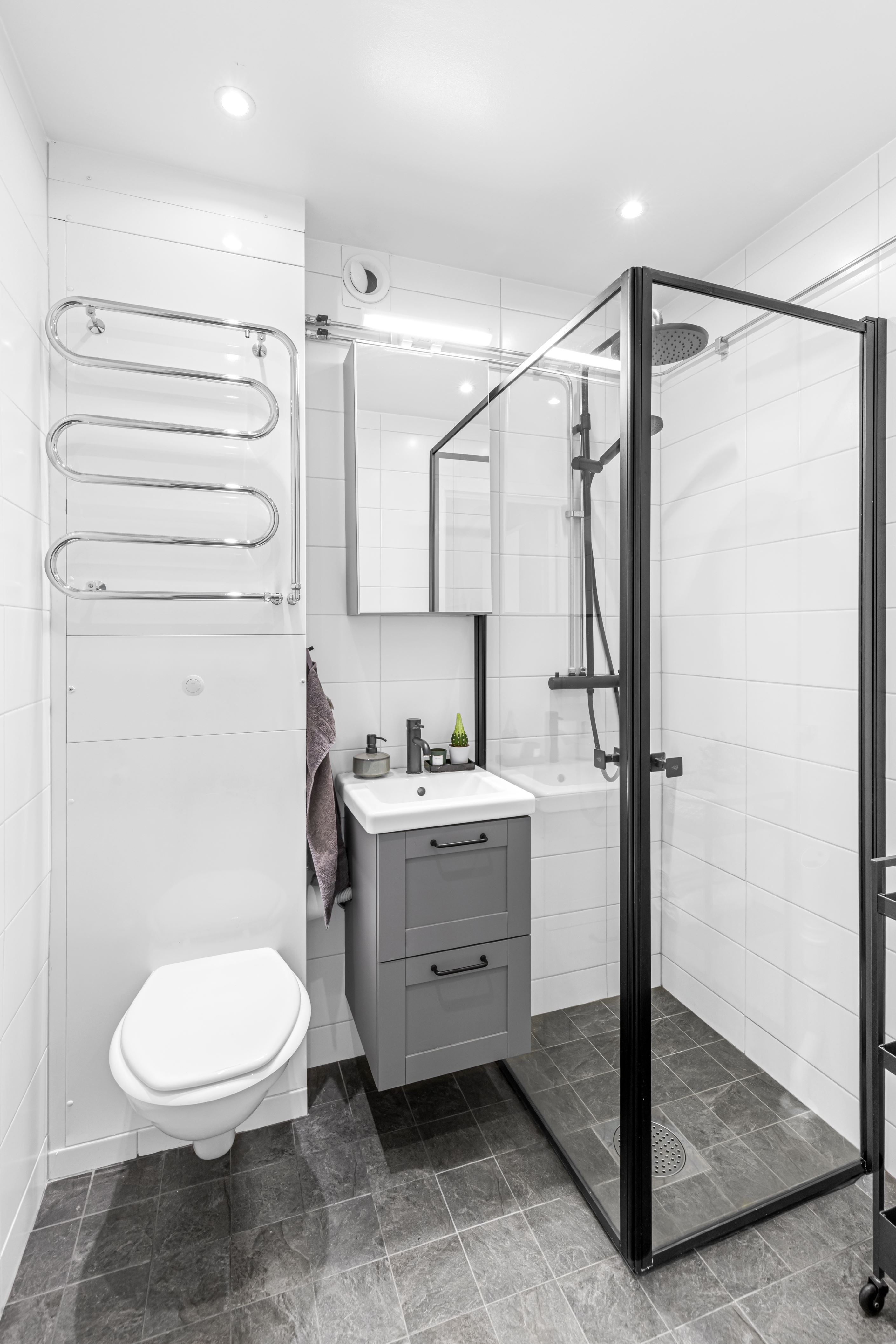 Det supermoderna badrummet erbjuder en känsla av hotelllyx med bra materialval och smakfull inredning. I det rymliga sovrummet väntar flertalet garderober som ger gott om plats för hela din garderob.