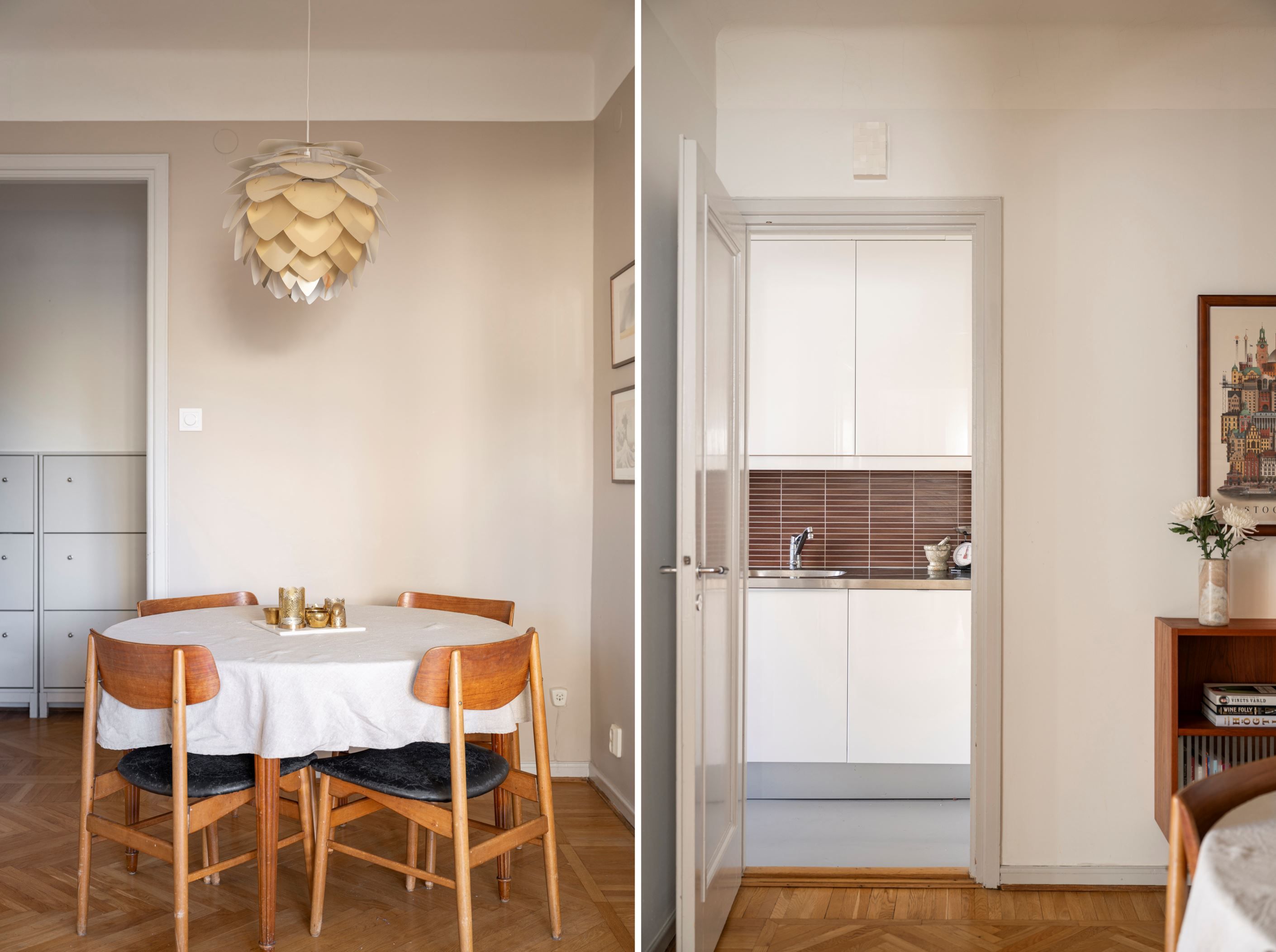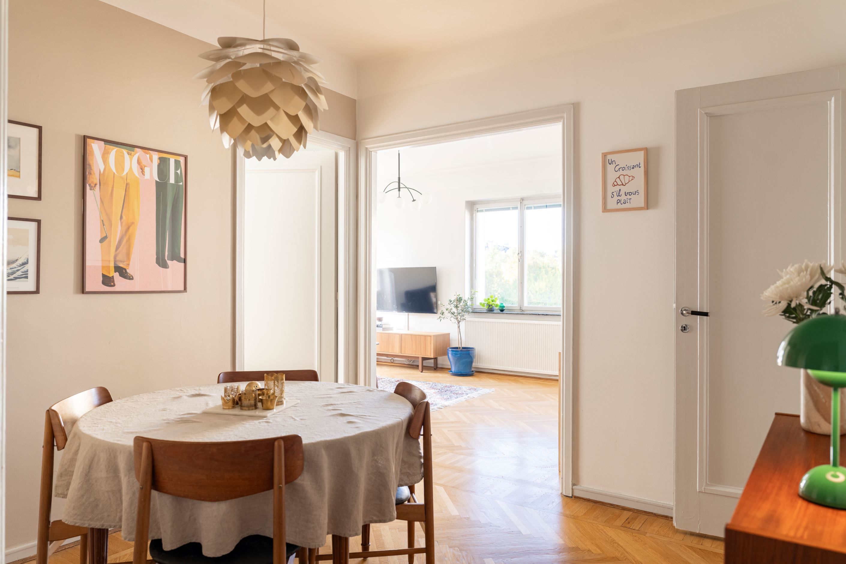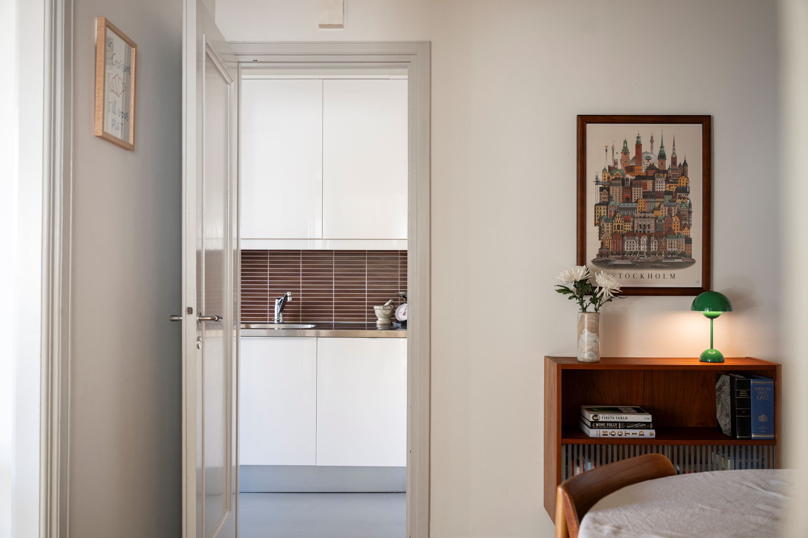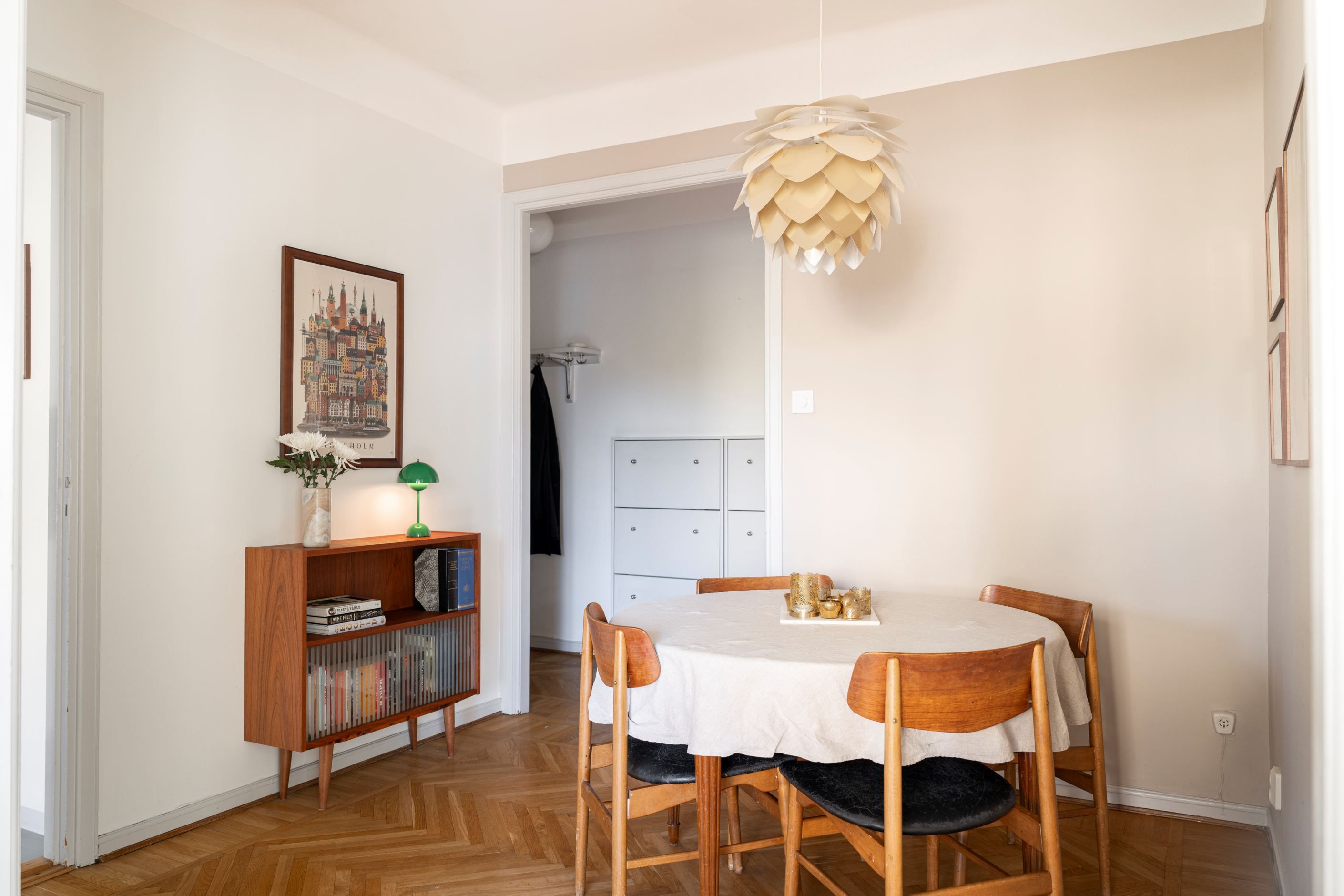 Invid vardagsrum och kök nås ett separat matrum som med enkelhet rymmer ett större matbord – perfekt för middagar för stora sällskap. Det nyrenoverade badrummet är smakfullt inrett i stilrena materialval och utrustat med dusch, wc, handfatskommod, tvättmaskin och smart förvaring. Hela bostaden har goda förvaringsmöjligheter tack vare två inbyggda garderober samt en garderobsvägg i sovrummet.