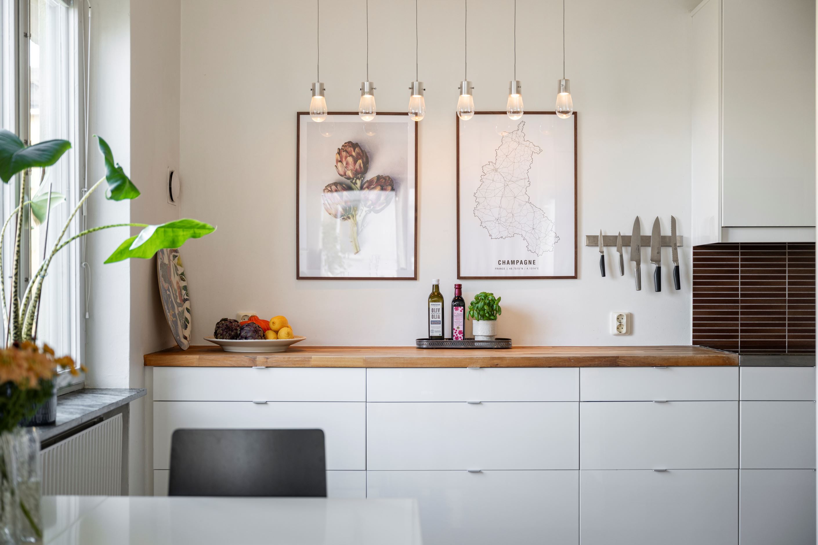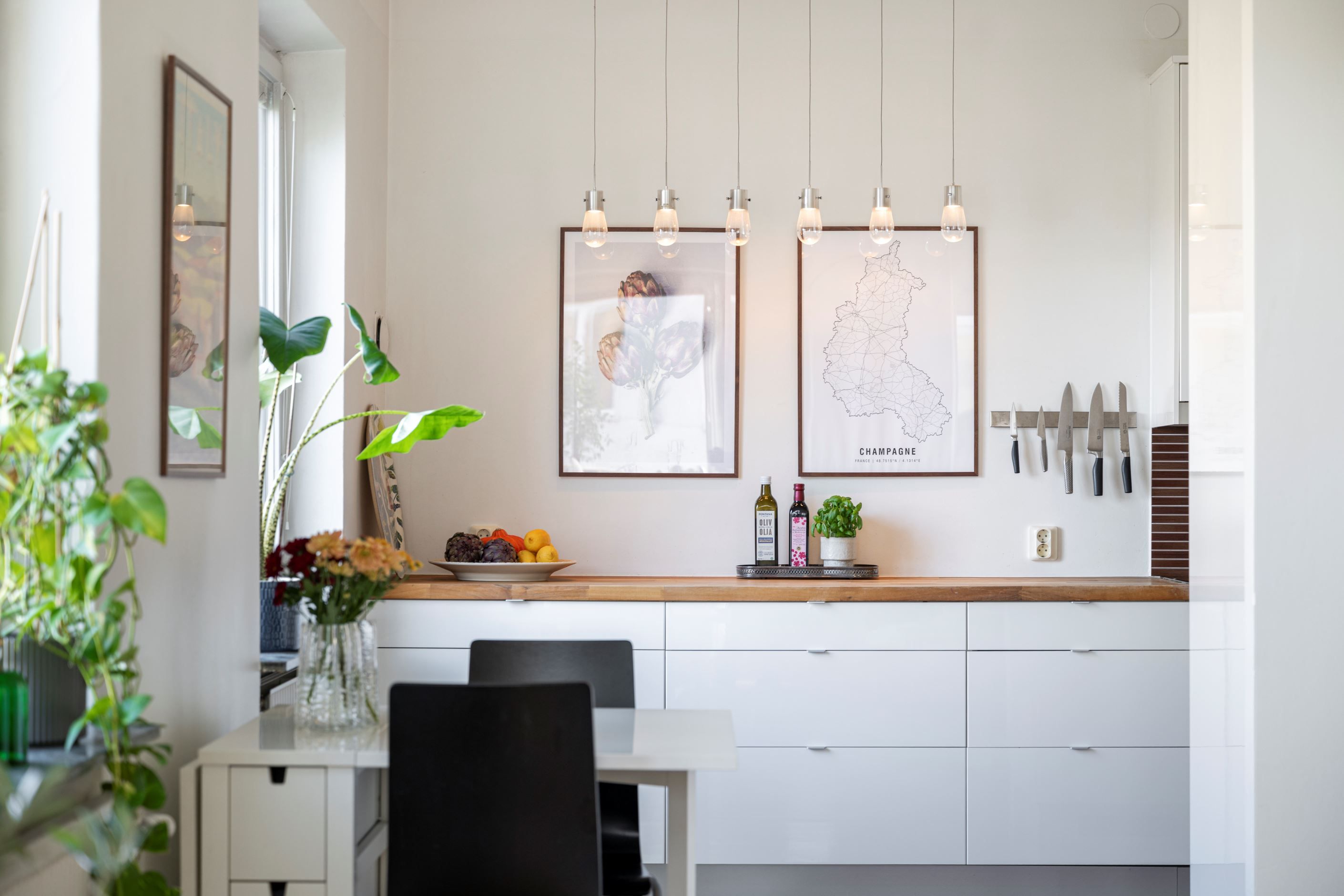 Bostaden präglas av en genomgående ljus och trivsam känsla, med en öppen planlösning mellan kök och vardagsrum som skapar en social och inbjudande atmosfär. Köket erbjuder gott om arbetsytor och förvaring samt full maskinell utrustning med kyl/frys, diskmaskin, ugn, micro och spis. I anslutning finns vardagsrummet med plats för både soffgrupp och mindre matbord – en naturlig samlingspunkt för vänner och familj.