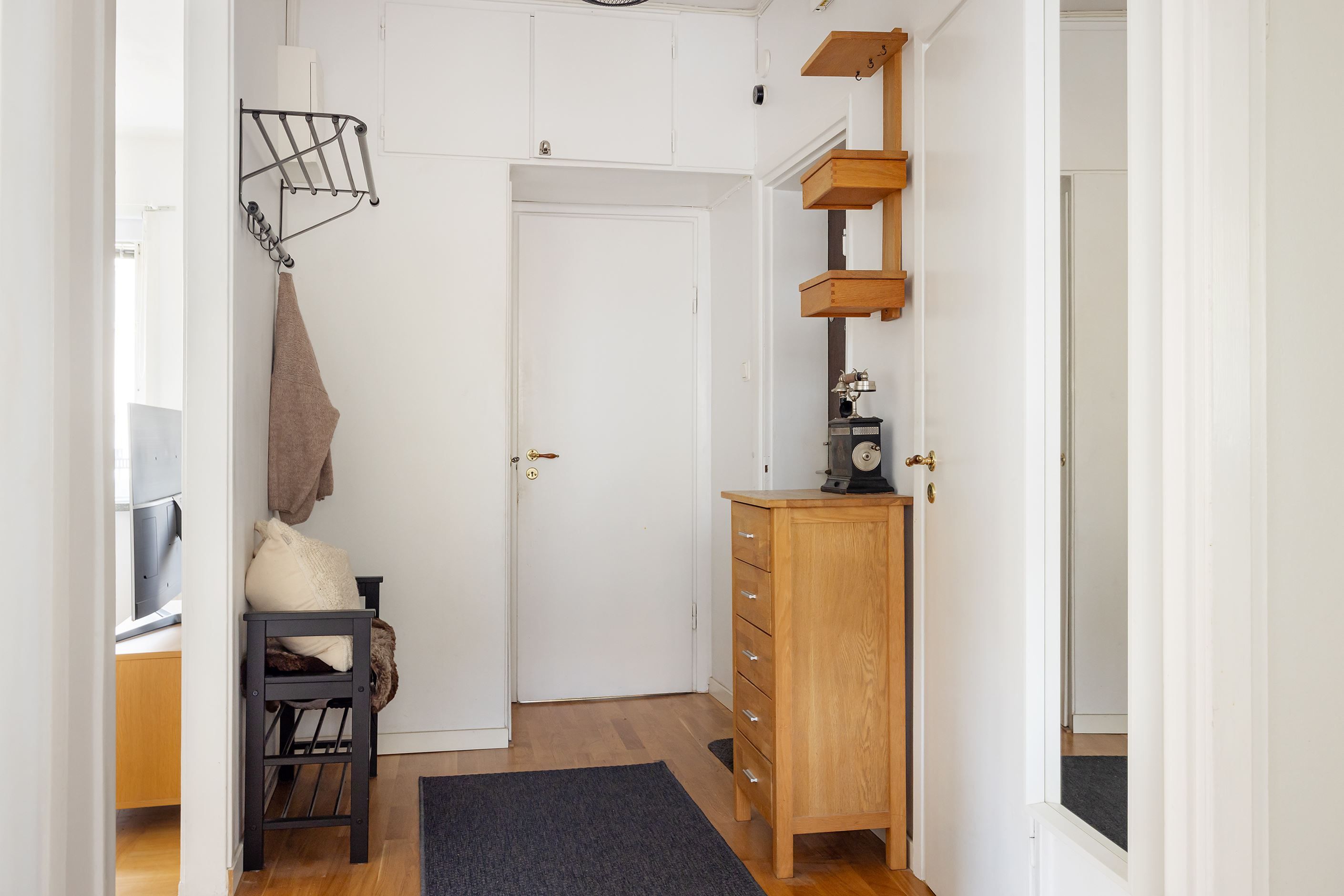 Planlösningen bjuder på ett stort vardagsrum som med enkelhet möbleras med soffa, soffbord och mediamöbel men också plats för matbord för den som önskar. Fönster i två väderstreck skänker rummet fint ljus och på golvet ligger en charmig fiskbensparkett. Köket är stilrent och modernt med gott om förvaring och arbetsyta. Här har man full maskinell utrustning med häll, ugn, fläktkåpa och integrerad diskmaskin samt kombinerad kyl/frys och mikro. I köket finns också plats för matbord för två personer. Badrummet renoverades i samband med stambytet 206/2017 och är helkaklat med duschplats, handfat på kommod, spegelskåp, handdukstork och wc. Bostadens bägge sovrum är rogivande med fönster som ger rummen trivsamt ljus. I det större sovrummet har man gott om plats för dubbelsäng, sängbord och ytterligare möblemang efter egen smak och behov. De något mindre sovrummet har också plats för större säng, perfekt som barn-eller tonårsrum, gästrum eller ett rymligt hemmakontor. Flertalet garderober skänker god förvaring. Hallen är välkomnande med naturlig yta för ytterkläder och skor. En platsbyggd originalgarderob, överskåp och en intilliggande klädkammare ger tillsammans ypperliga förvaringsmöjligheter.
