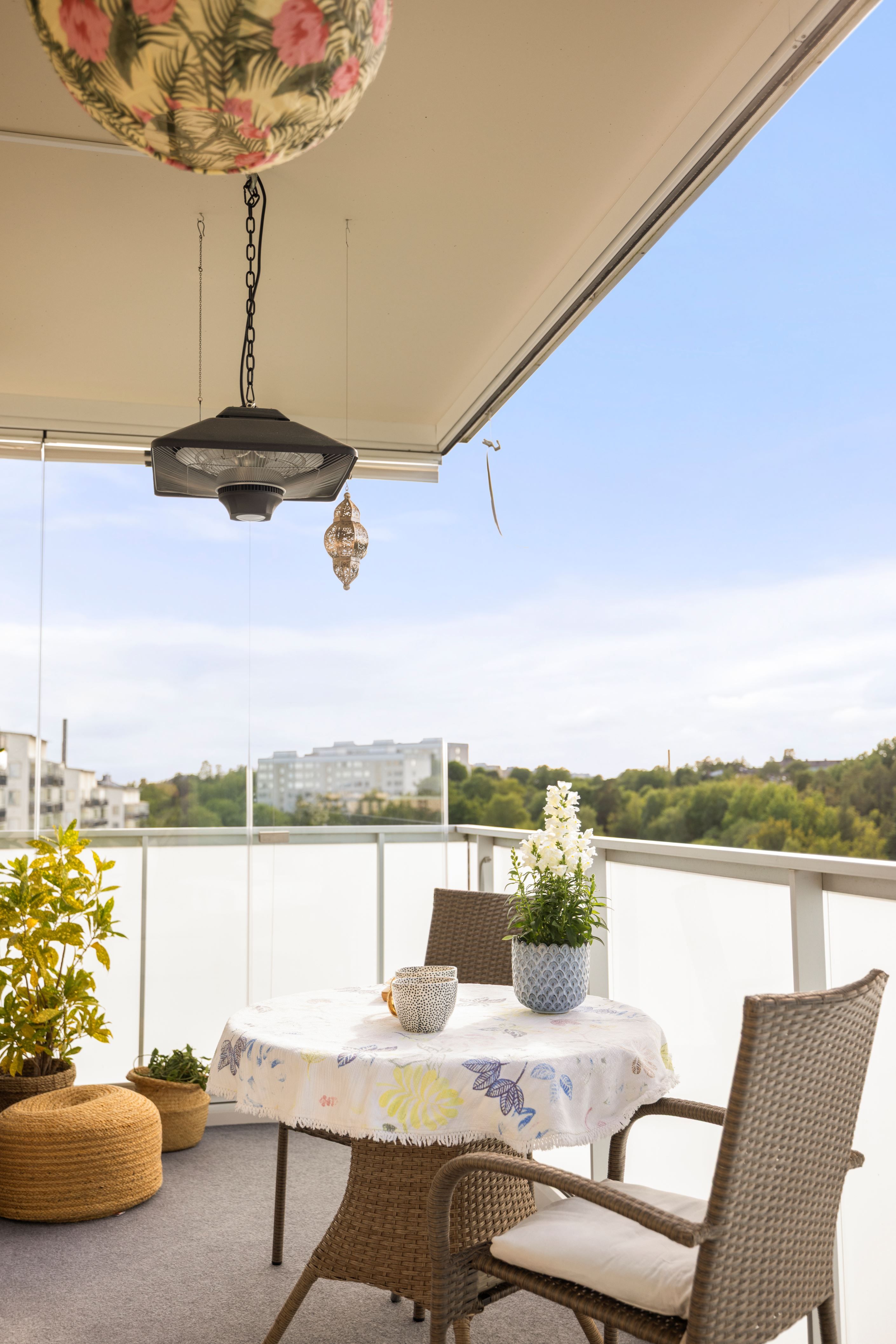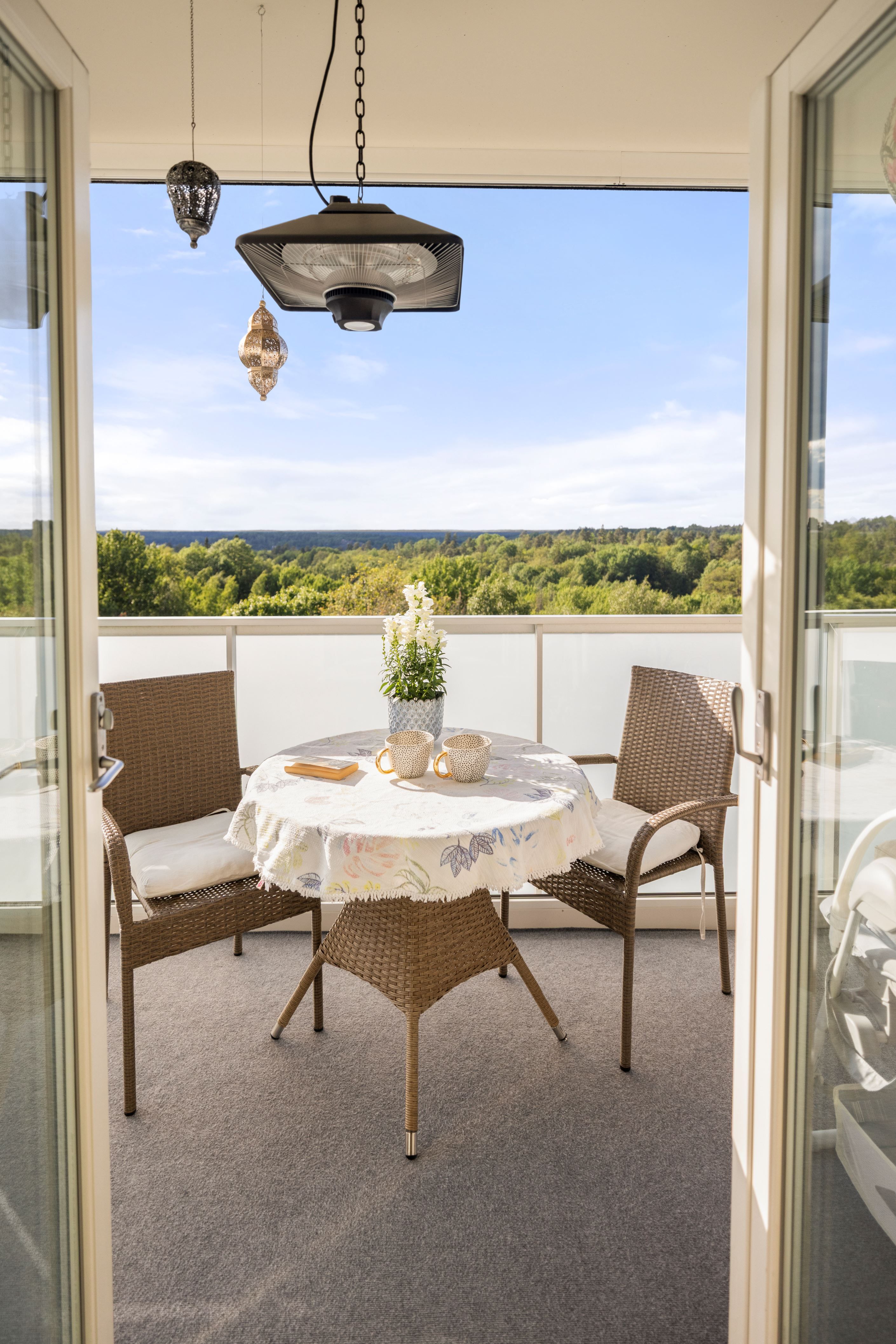 Från vardagsrummet når du den stora inglasade balkongen – en riktig pärla där du kan njuta av den fria utsikten över grönska och Mälaren. Här kommer många timmar tillbringas med nära och kära, året om, medan solen går ner över Mälarens glittrande vatten.