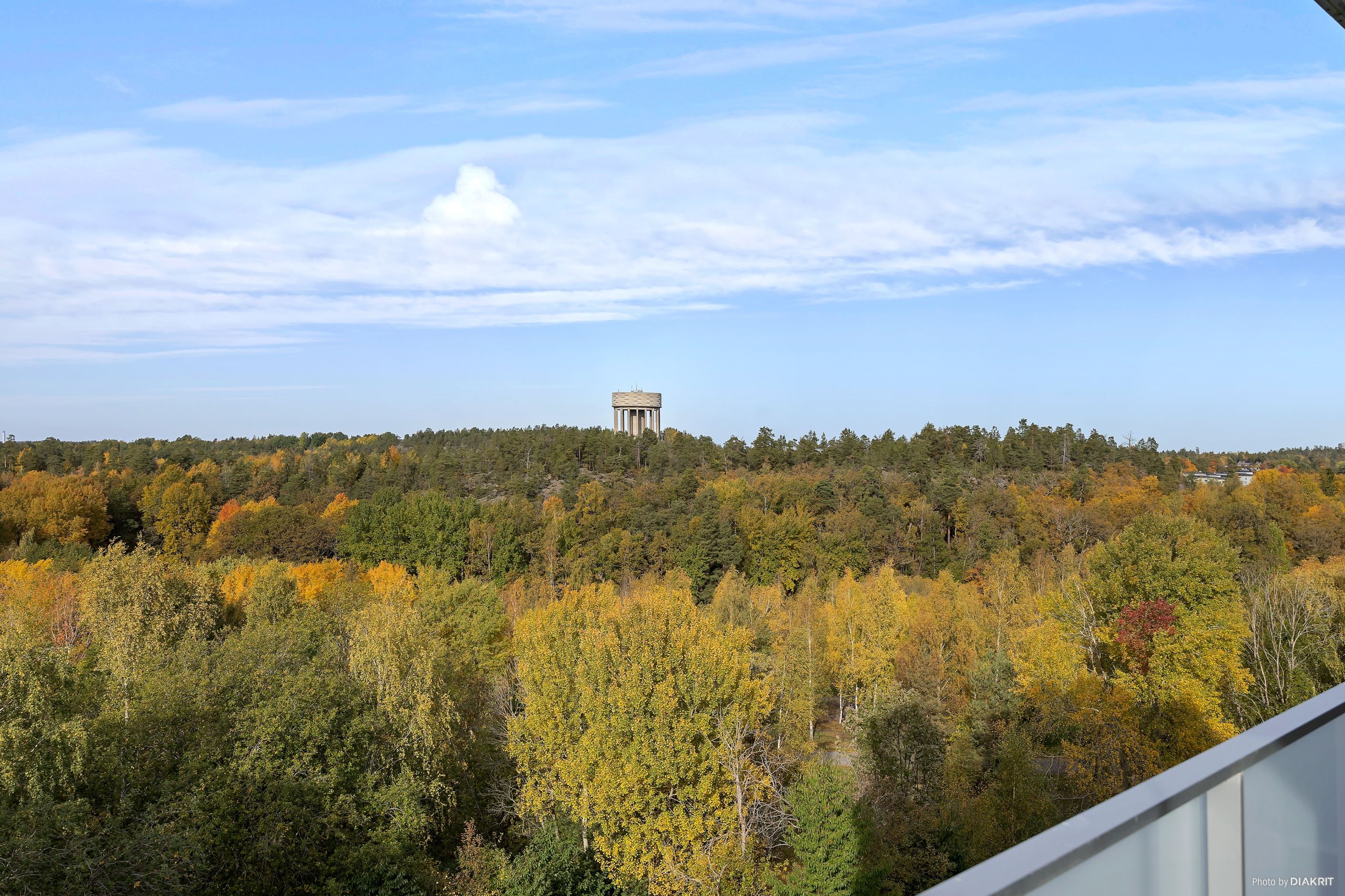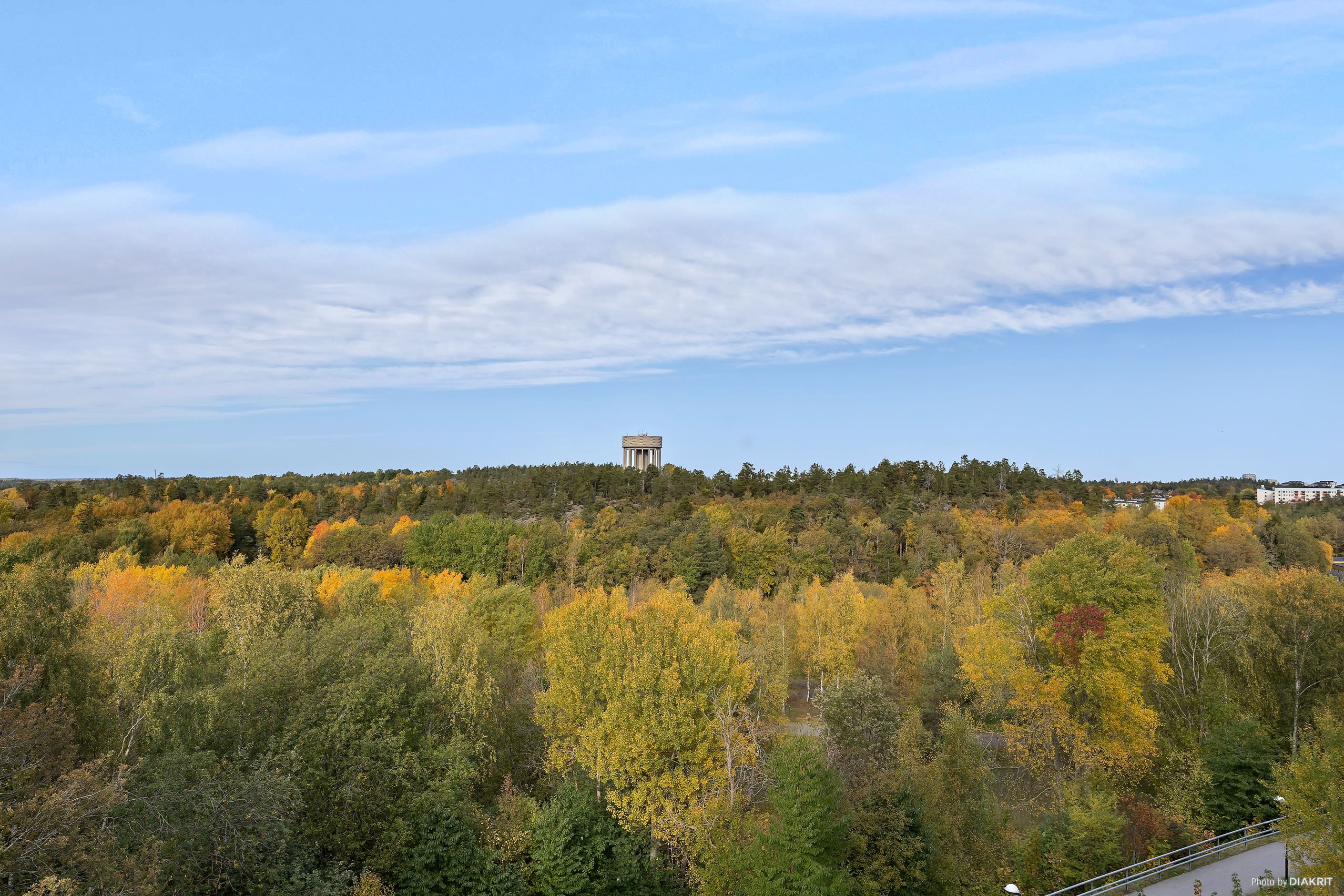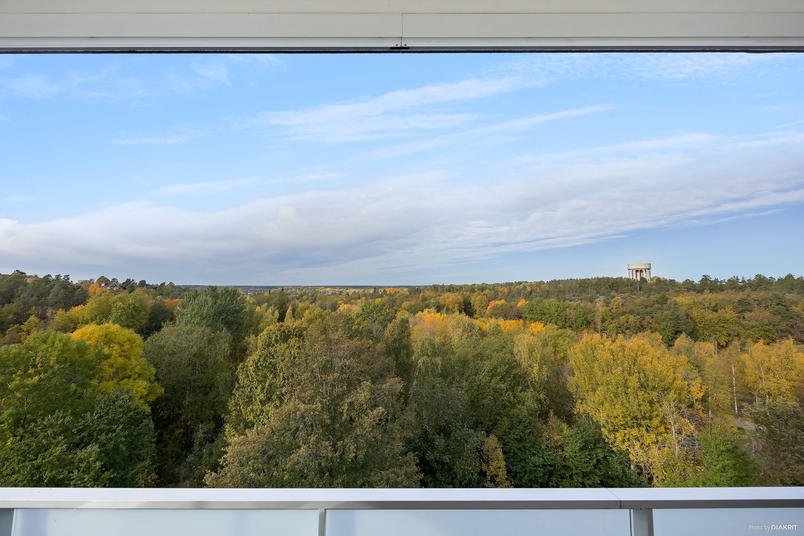 Gaveltvå med milsvid utsikt över grönska och Mälaren, begränsad insyn & inglasad balkong! Möjlig 3a.