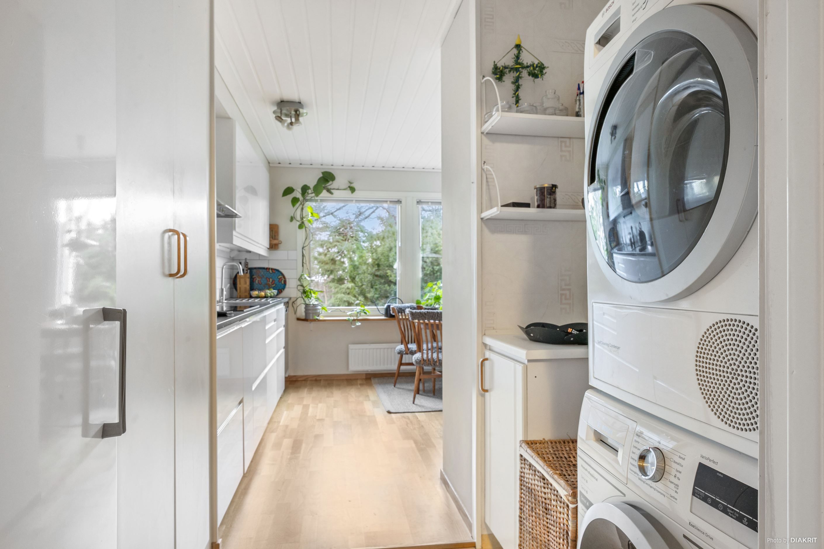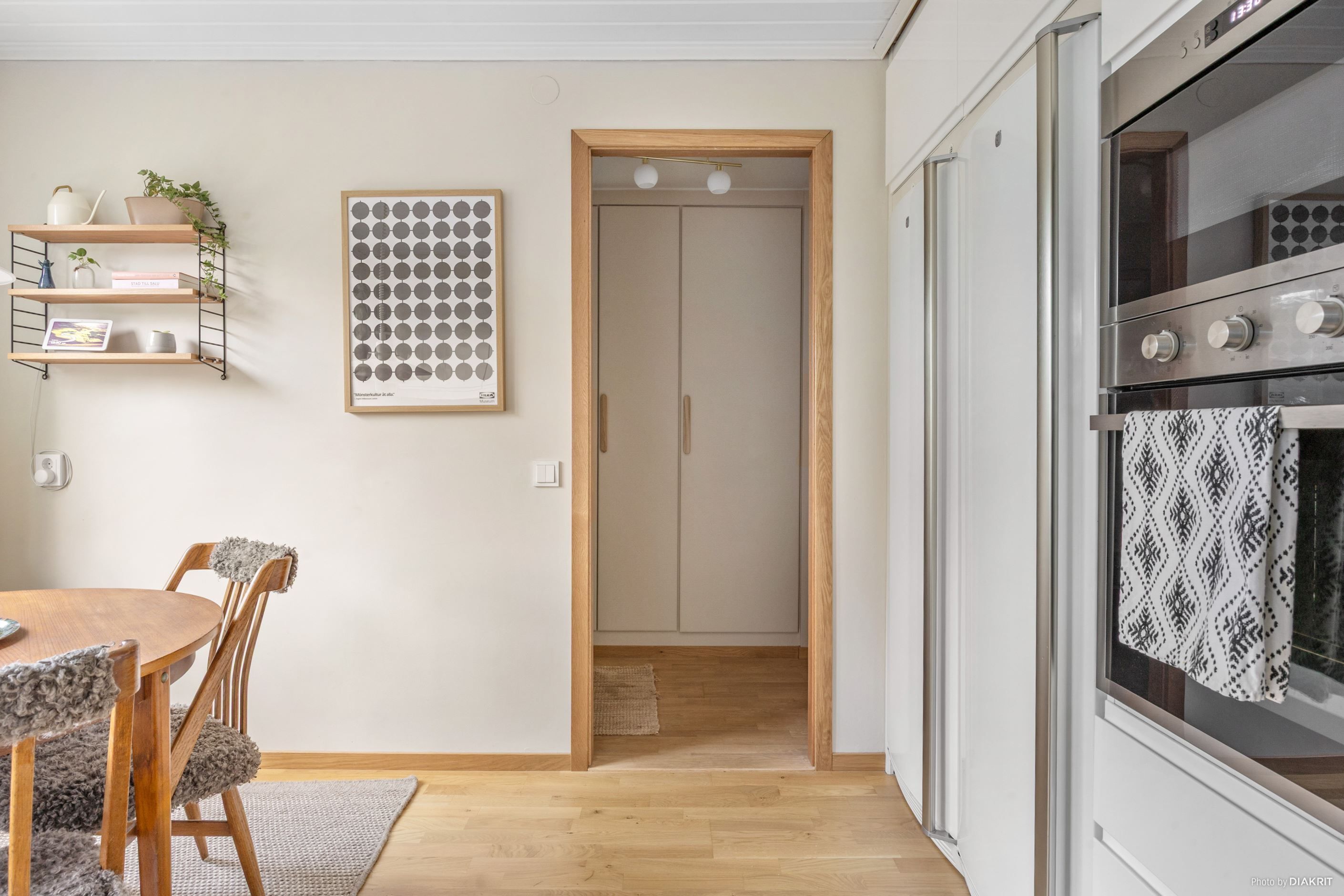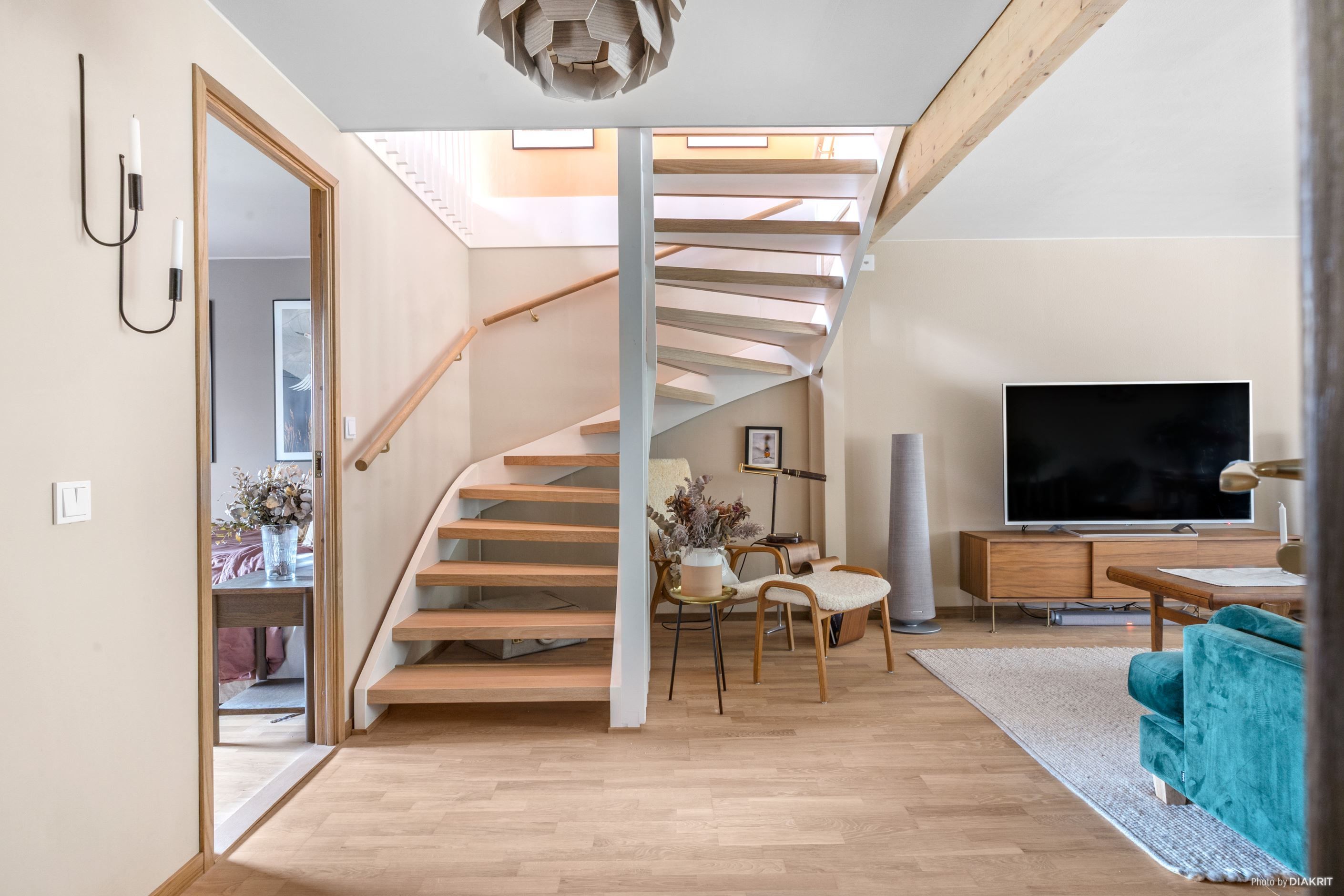 Entréplanet präglas av en genomtänkt och välplanerad planlösning med sociala ytor i fokus. Det rymliga vardagsrummet med öppen spis skapar en varm och inbjudande atmosfär och har direkt access till den lummiga, insynsskyddade uteplatsen som vetter mot allmänning. Vidare finns ett stort och modernt kök, helkaklad WC, ett sovrum samt praktisk tvättstuga och pannrum/förråd.