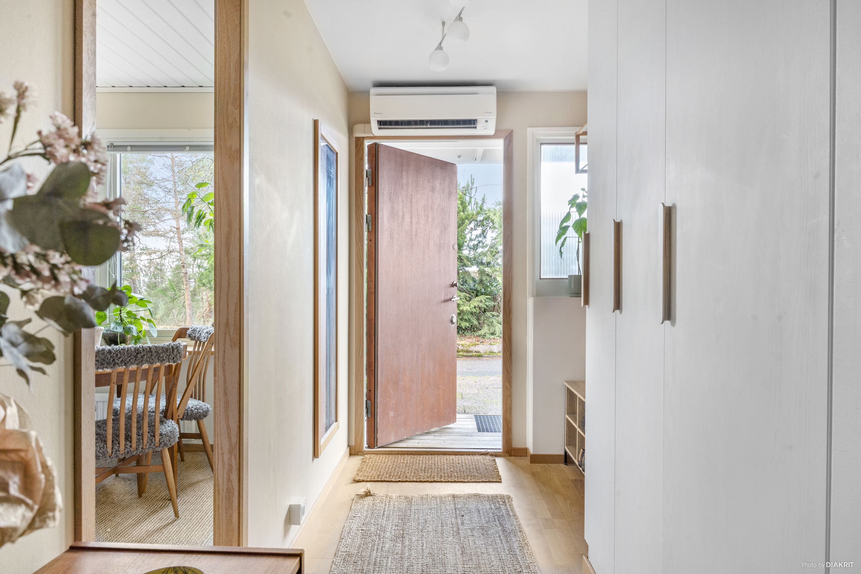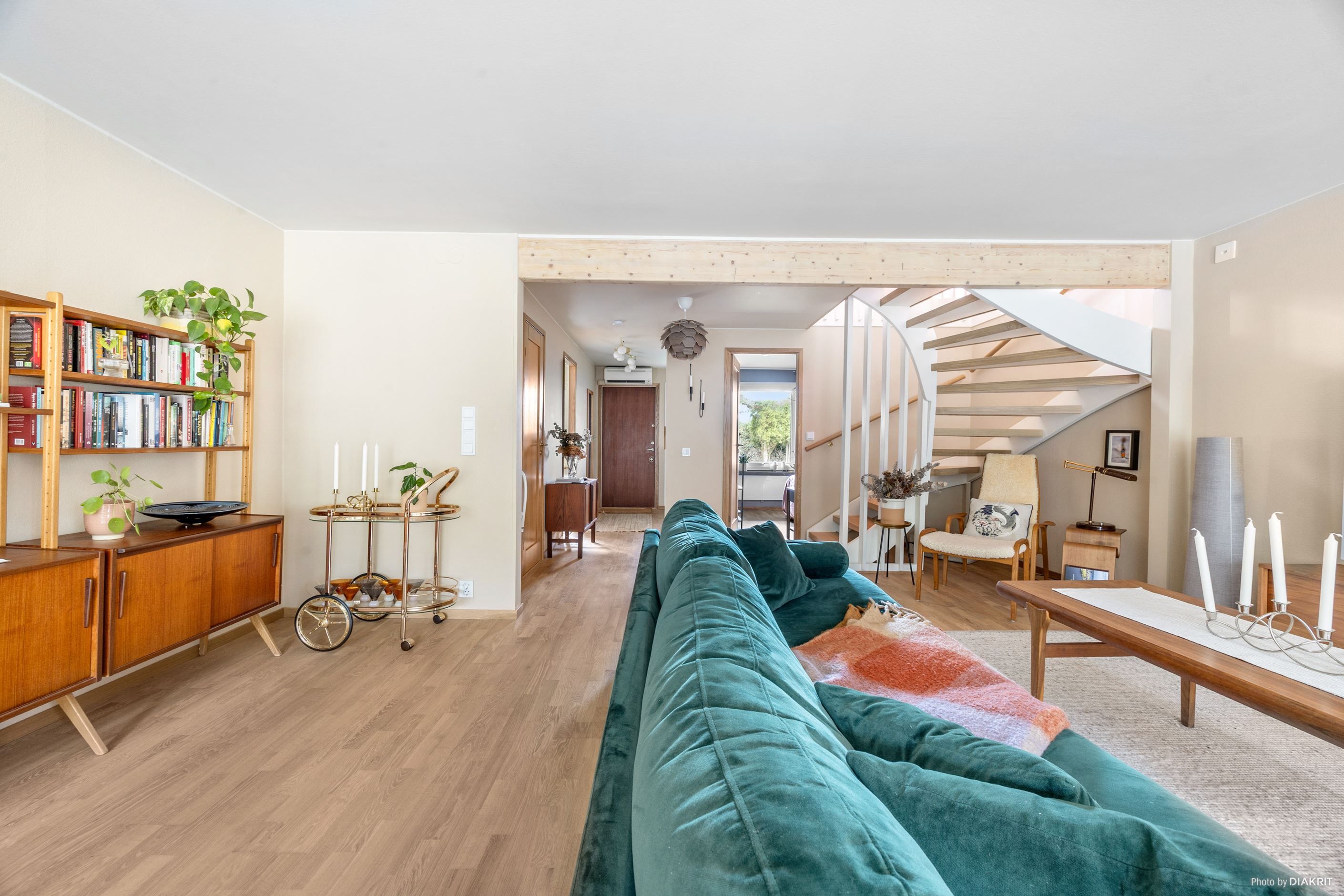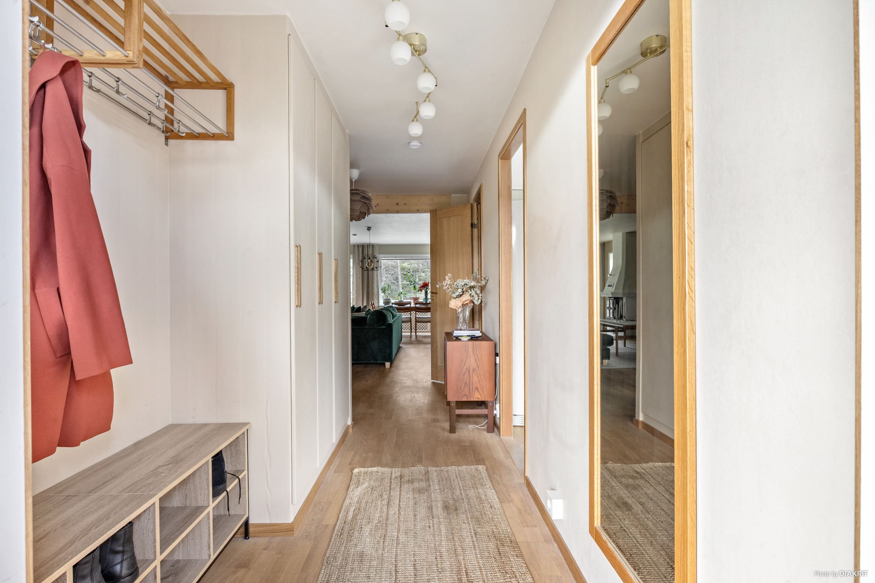 Entréplanet präglas av en genomtänkt och välplanerad planlösning med sociala ytor i fokus. Det rymliga vardagsrummet med öppen spis skapar en varm och inbjudande atmosfär och har direkt access till den lummiga, insynsskyddade uteplatsen som vetter mot allmänning. Vidare finns ett stort och modernt kök, helkaklad WC, ett sovrum samt praktisk tvättstuga och pannrum/förråd.