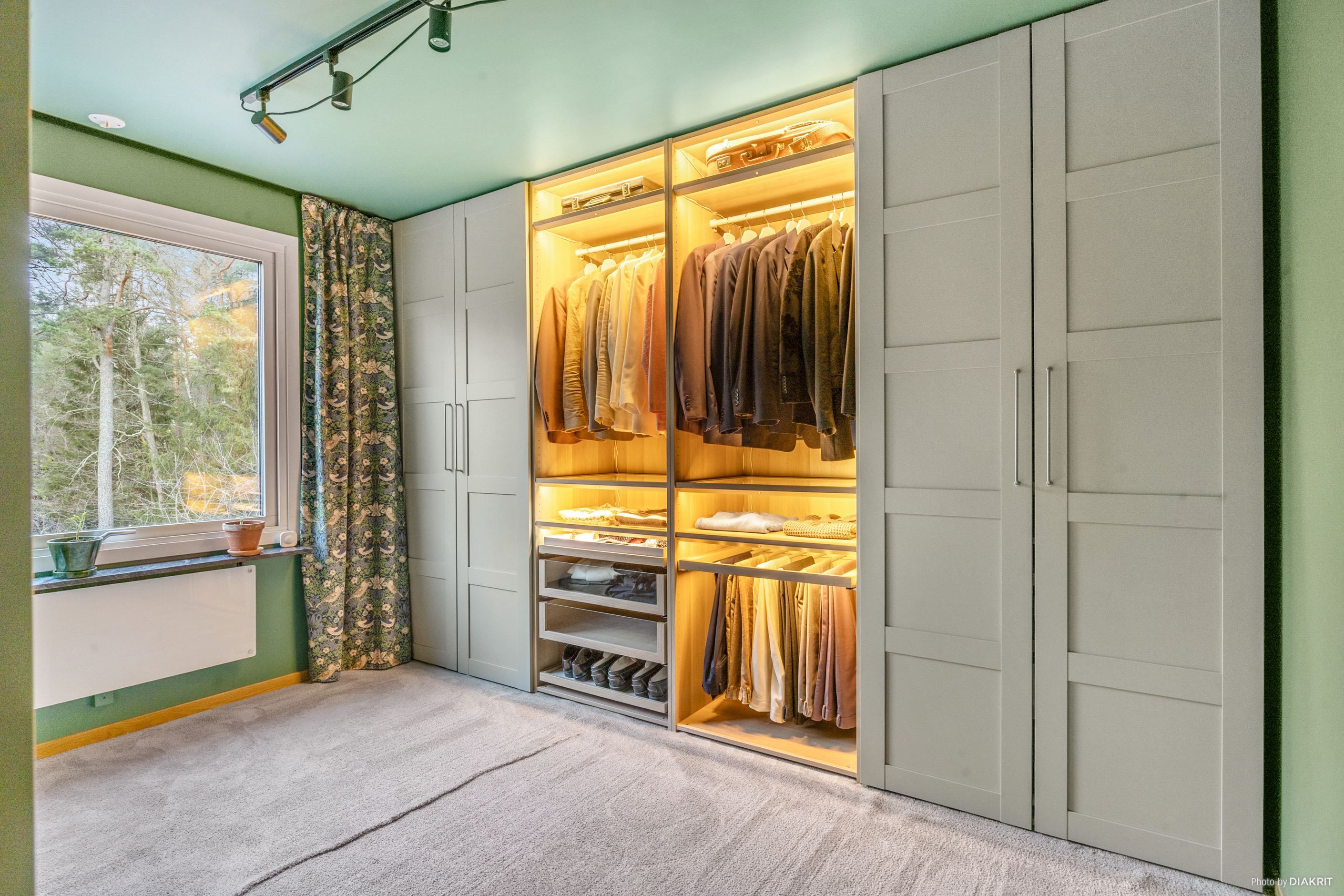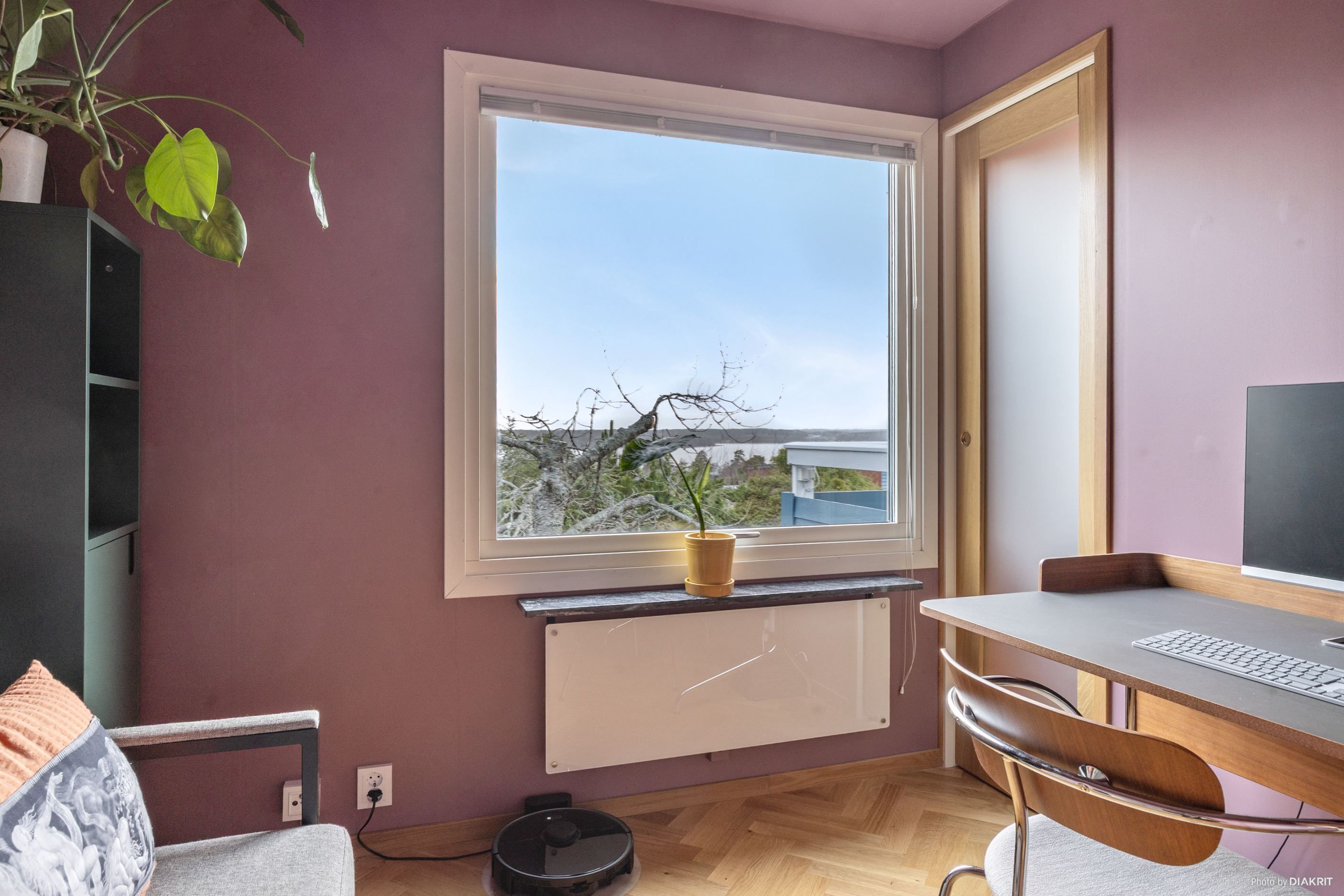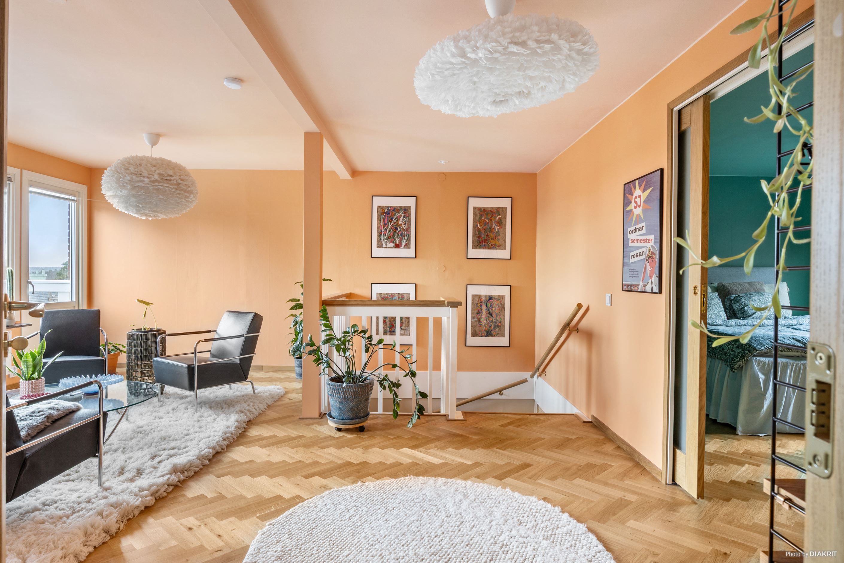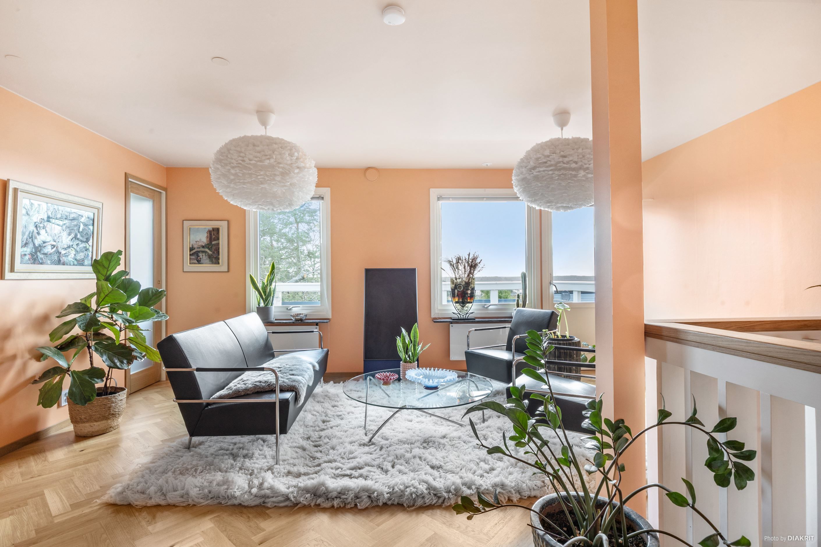 På övre plan väntar ett rofyllt master bedroom med tillhörande walk-in closet, ett luftigt allrum med direkt utgång till balkong och en magisk utsikt över Mälaren. Här finns även ett helkaklat badrum med moderna bekvämligheter samt ytterligare ett sovrum/kontor. Här ges även möjligheten att enkelt kunna omvandla allrummet till ytterligare 1-2 sovrum om behovet finns.