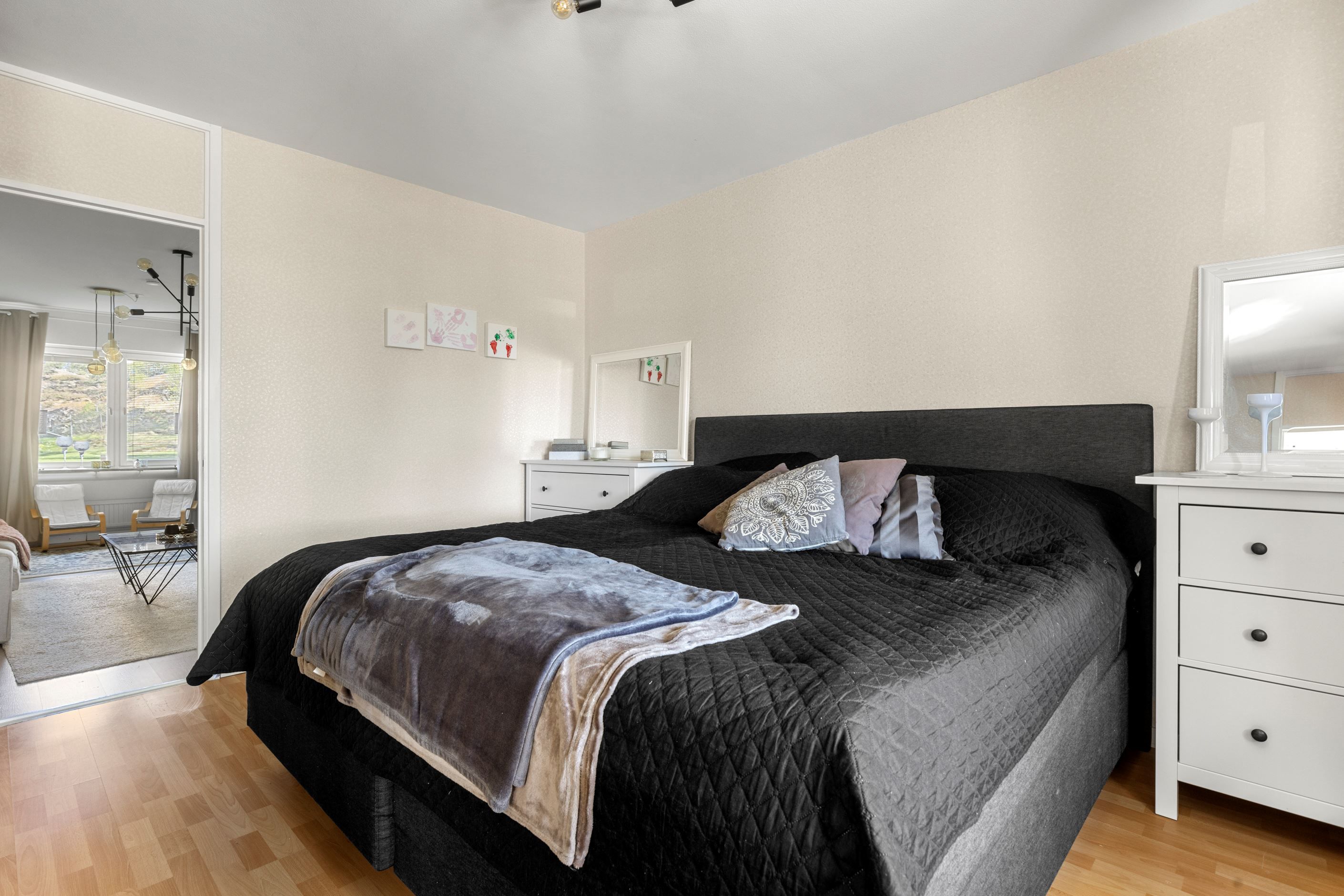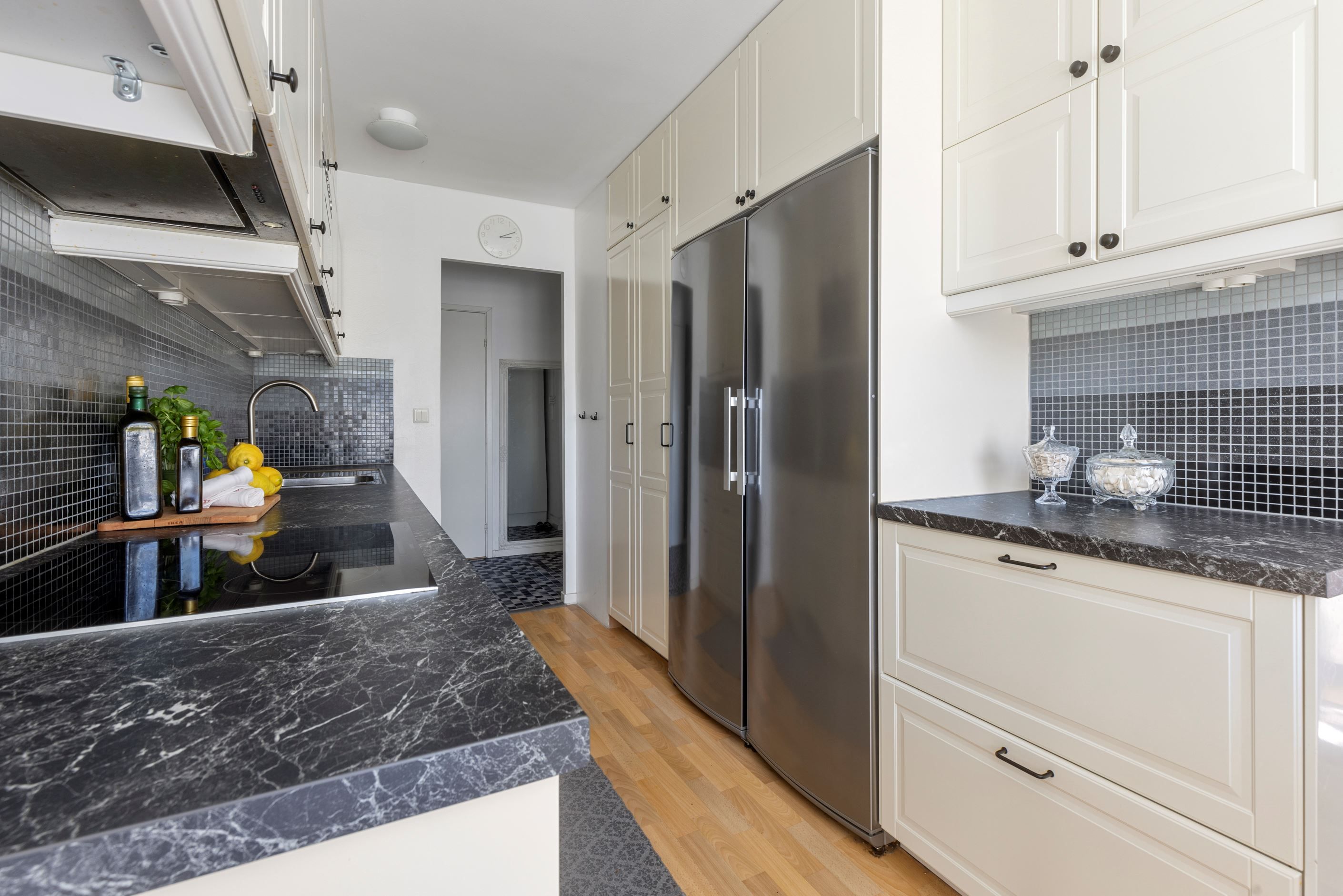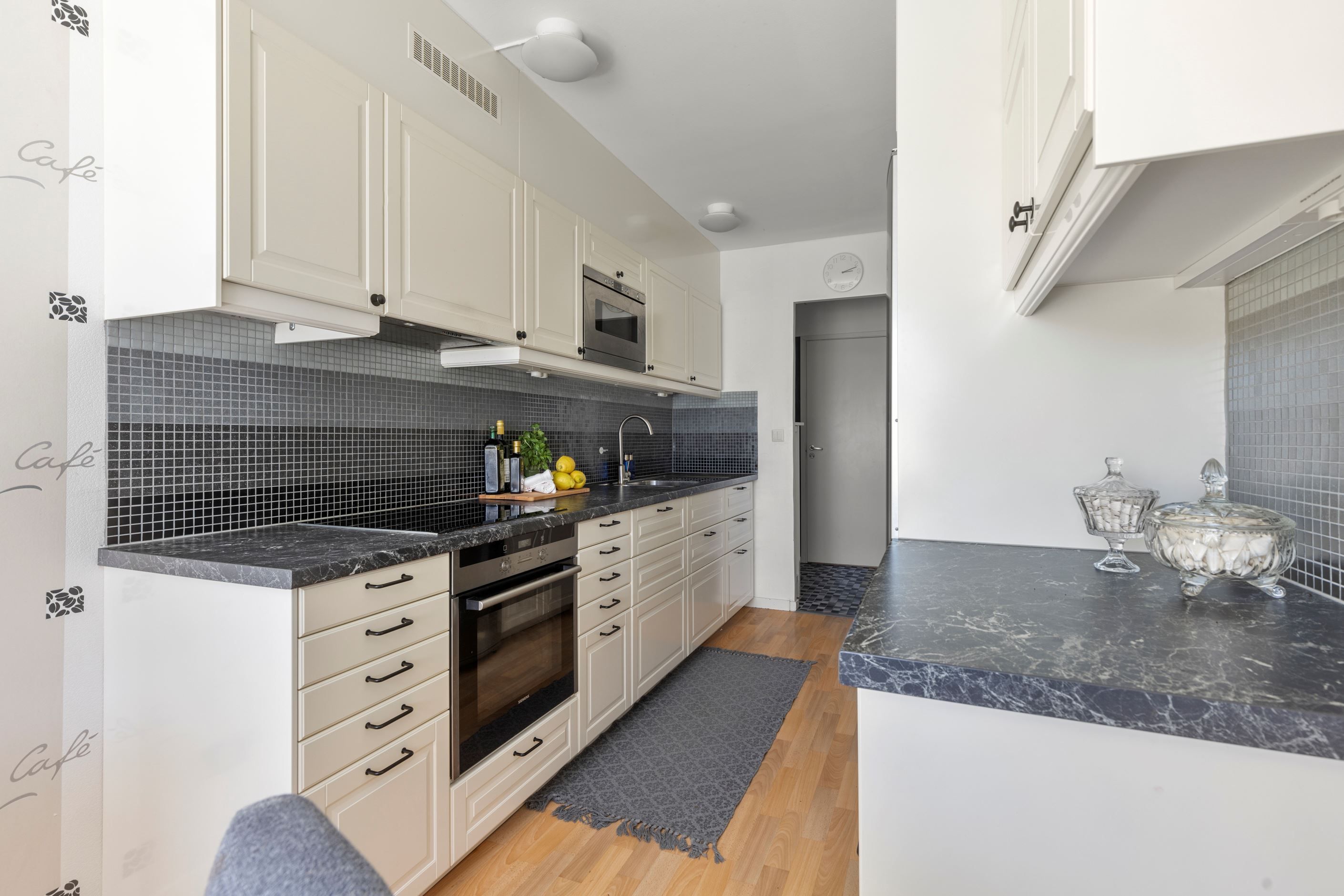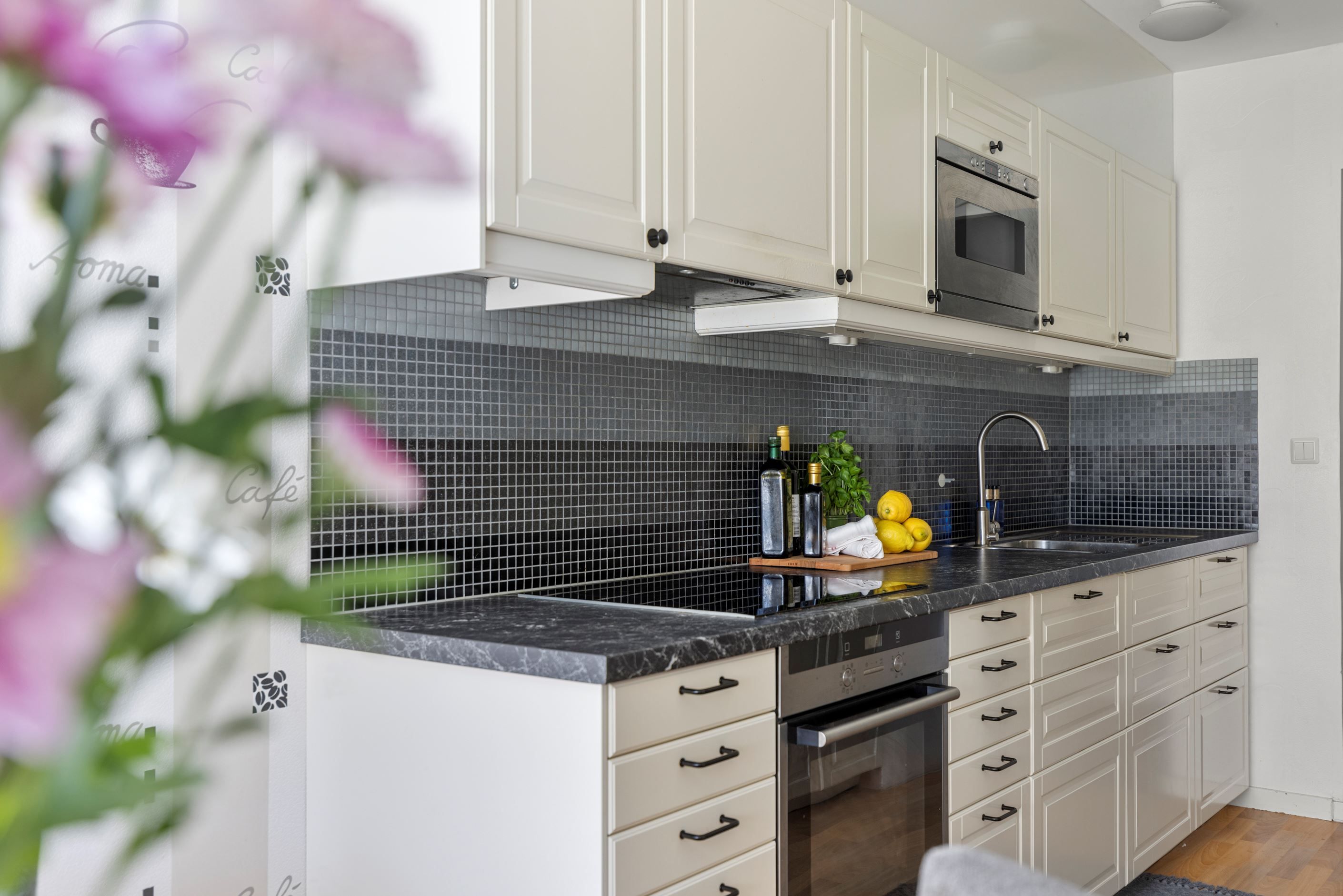 Vidare in i bostaden möts du av det dubbelsidiga köket med goda arbetsytor och förvaringsmöjligheter via vita köksluckor. Här får ni även plats med ett matbord för 6 personer. Lättmöblerat vardagsrum där du får plats med större soffgrupp, tv-bänk, bord och annat möblemang. Härligt med ljusinsläpp via de väl tilltagna fönsterpartierna i ett fritt läge med grönskande utsikt och en inglasad balkong som erbjuder eftermiddagssol!