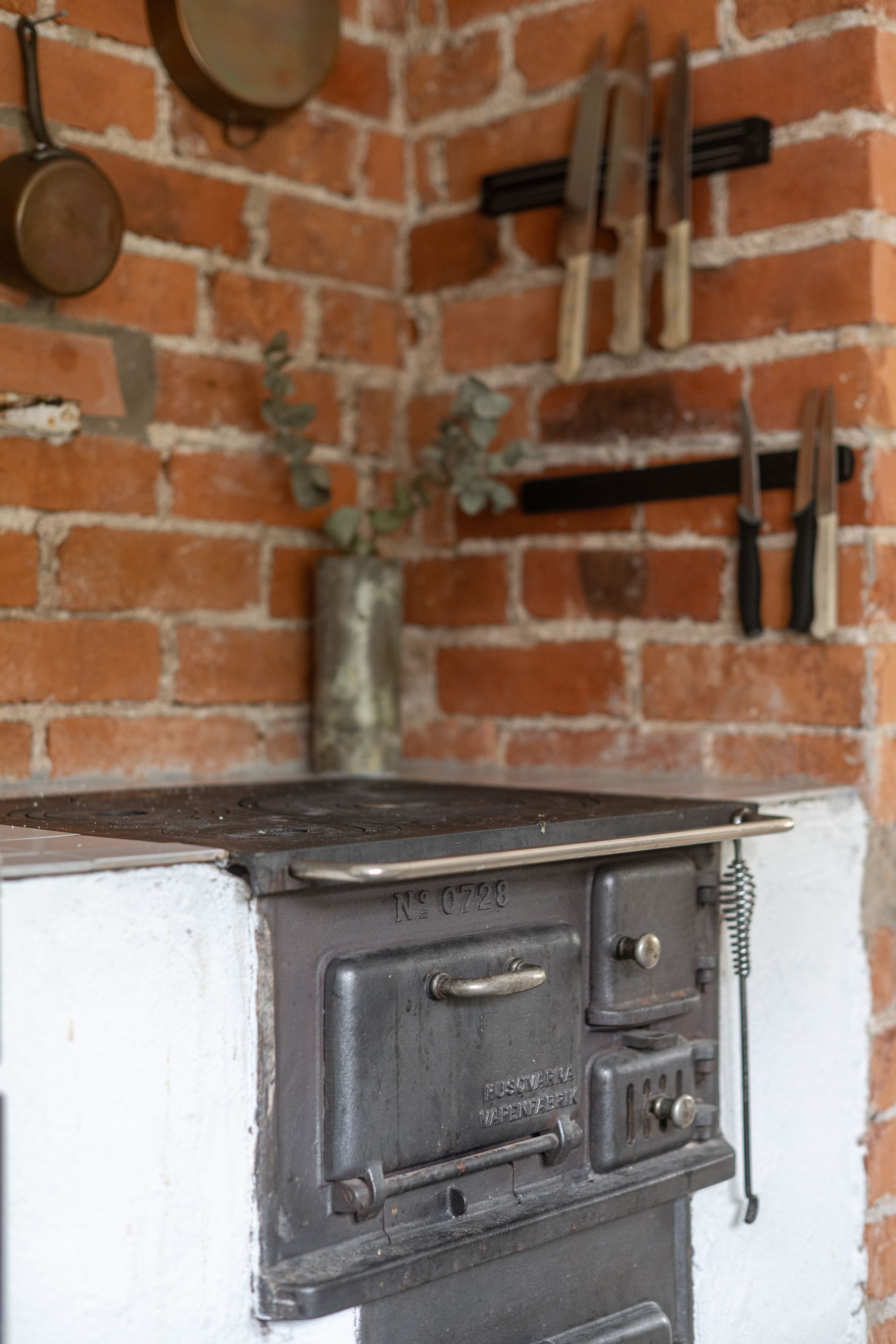 -Kök med matplats för 4 personer. Köket har vita skåpluckor, kyl och frys i fullhöjd, spis, och diskmaskin. Här finns gott om plats för förvaring och den framtagna tegelväggen pryder rummet. Här finns även en fungerande vedspis.