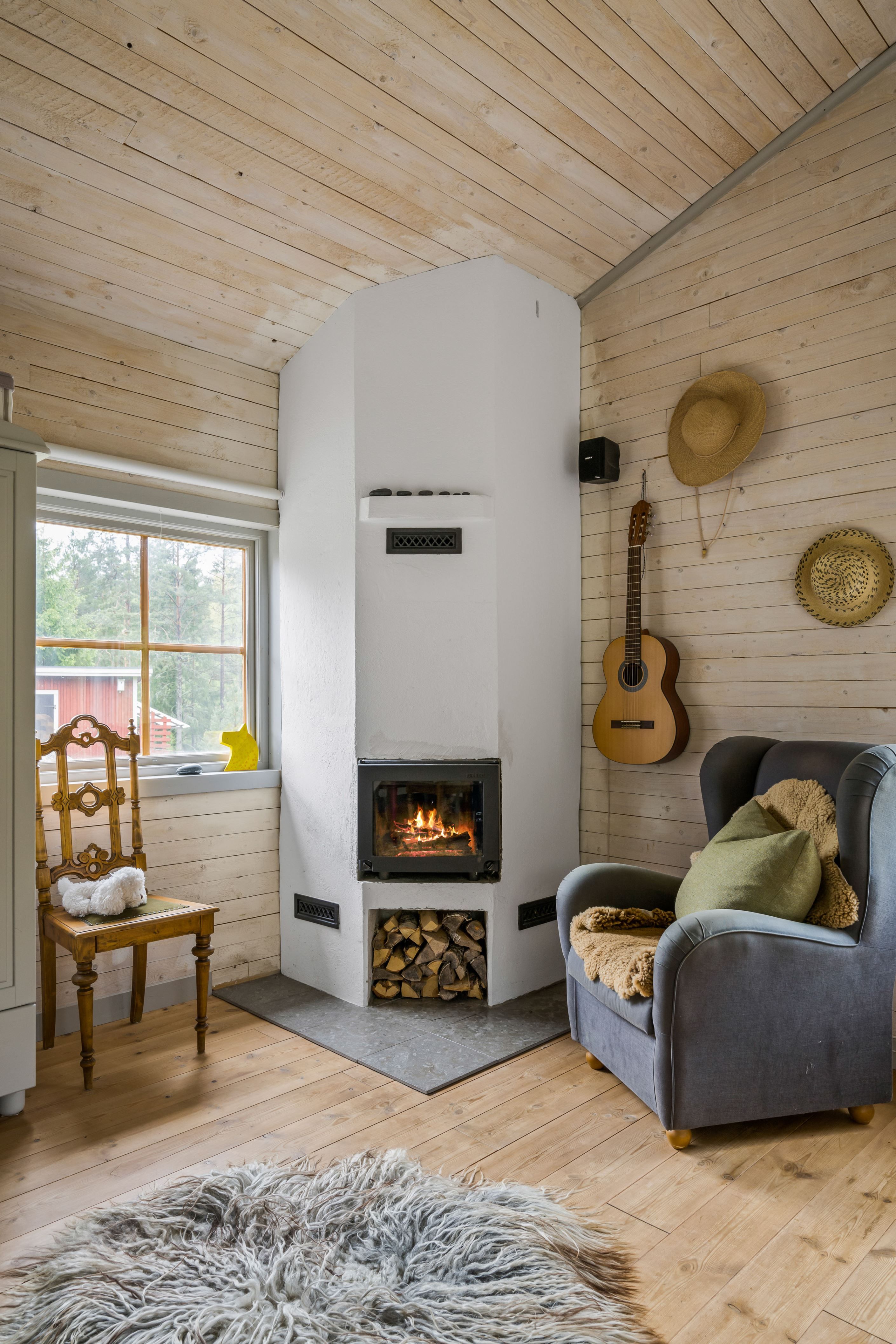 -Stort sovrum med trägolv och uppmurad kamin i hörnet.