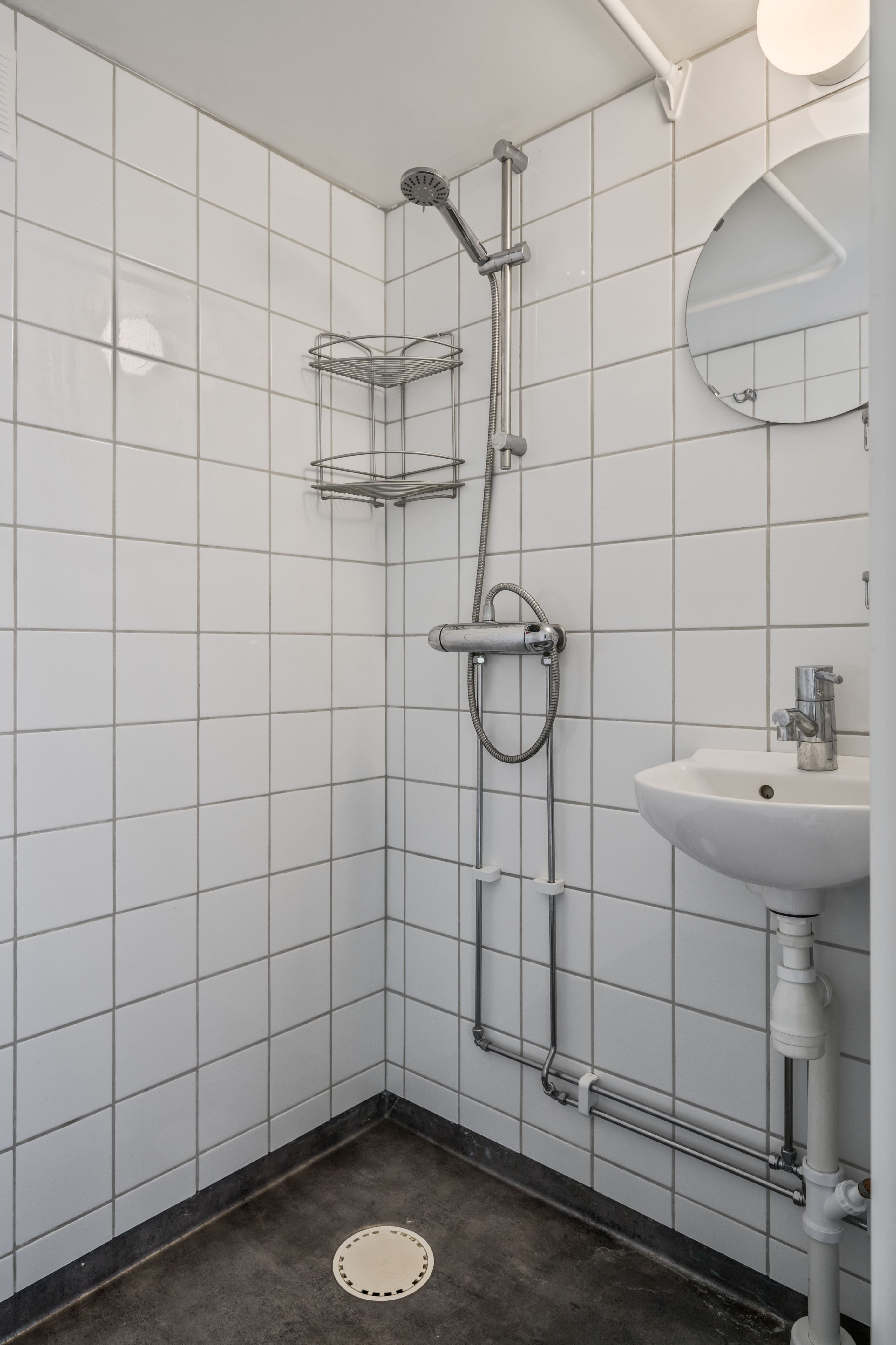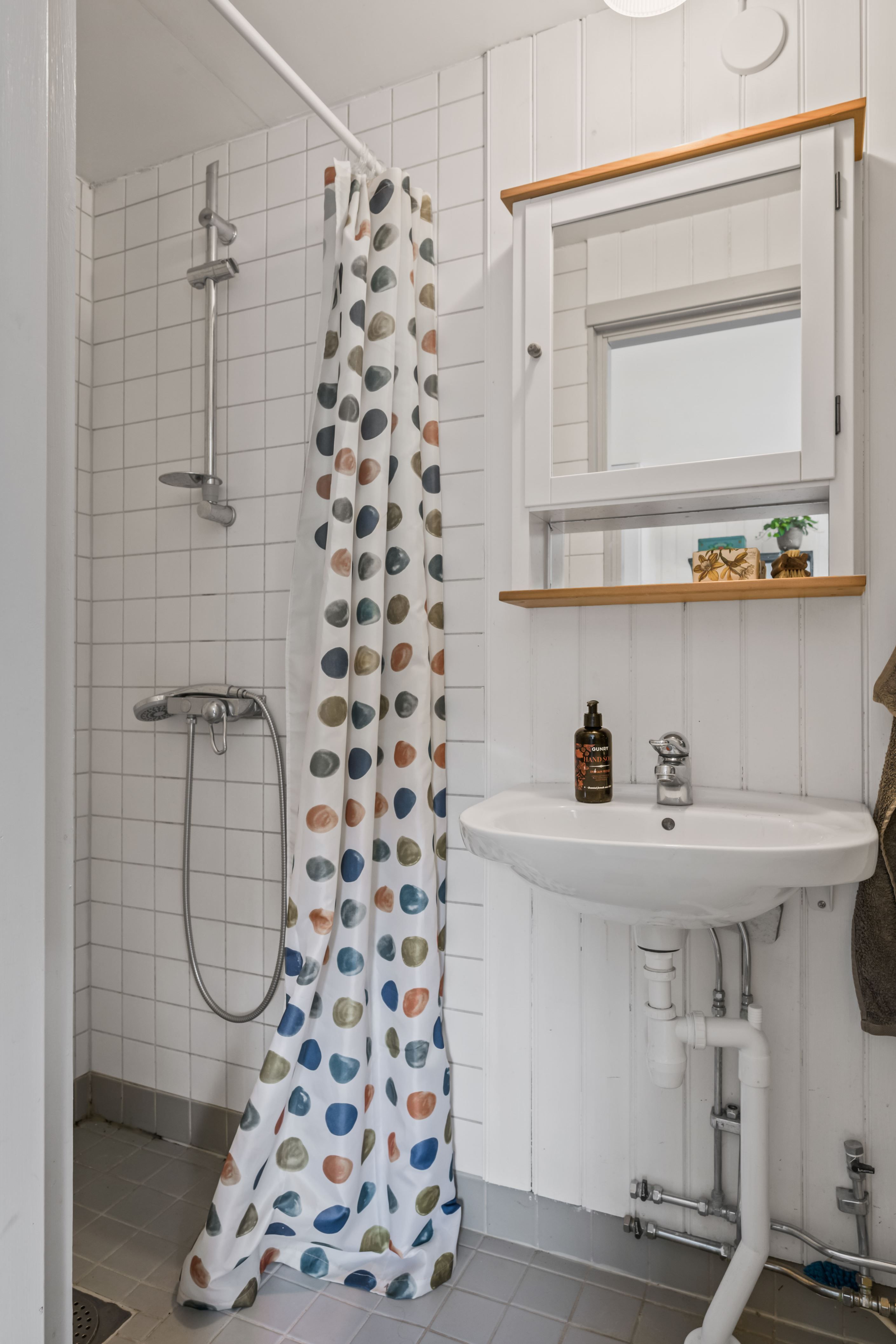 -Duschrum med klinker och delvis kakel, delvis pärlspont på vägg. Här finns dusch och ett handfat.