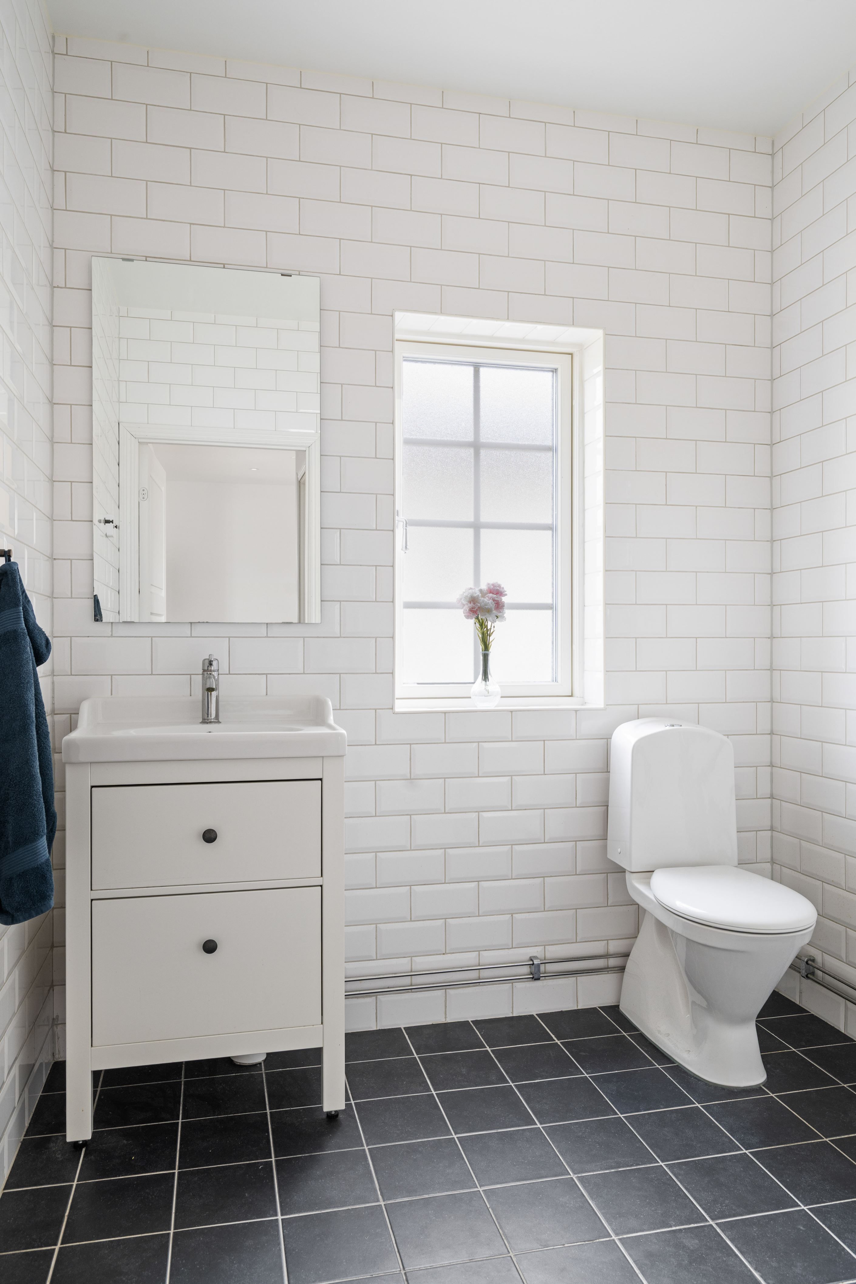Badrum med klinker, golvvärme och helkaklade väggar. Badkar med tassar, duschhörna, wc samt dubbelhandfat med kommod.